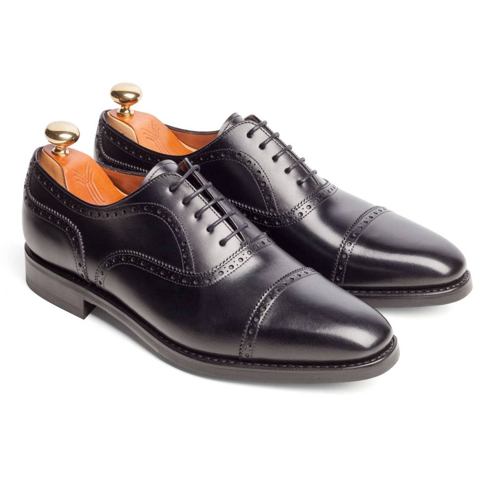 Оксфорды полуброги чёрного цвета из коллекции испанского бренда Yanko. Модель выполнена из плотной телячьей кожи. Внутренняя отделка из кожи. Туфли украшены традиционным перфорированным узором. Особенностью данной колодки являются заметные боковые грани заострённый силуэт, из-за чего обувь приобретает формальный и элегантный внешний вид. Комбинированная подошва из кожи и резины. Конструкция Goodyear Welted.