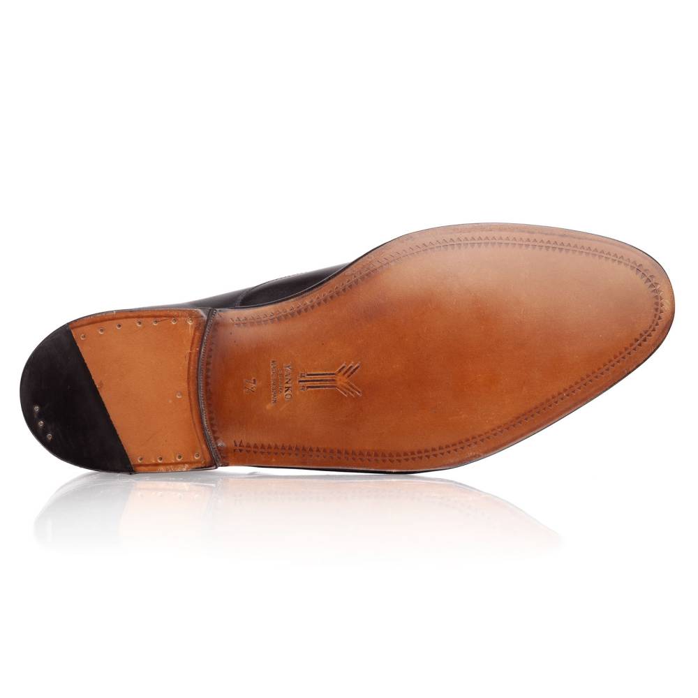 Элегантные мужские туфли-оксфорды с отрезным мыском. Изготовлены на Майорке на фабрике Yanko в конструкции Goodyear Welted. Верх модели выполнен из плотной телячьей кожи чёрного цвета. Внутренняя отделка из тонкой кожи растительного дубления. Область пятки с внутренней стороны с шероховатой поверхностью, чтобы стопа лучше фиксировалась. Пара оснащена кожаной подошвой с закрытым швом. Это делает её гладкой, а также защищает от проникновения влаги.