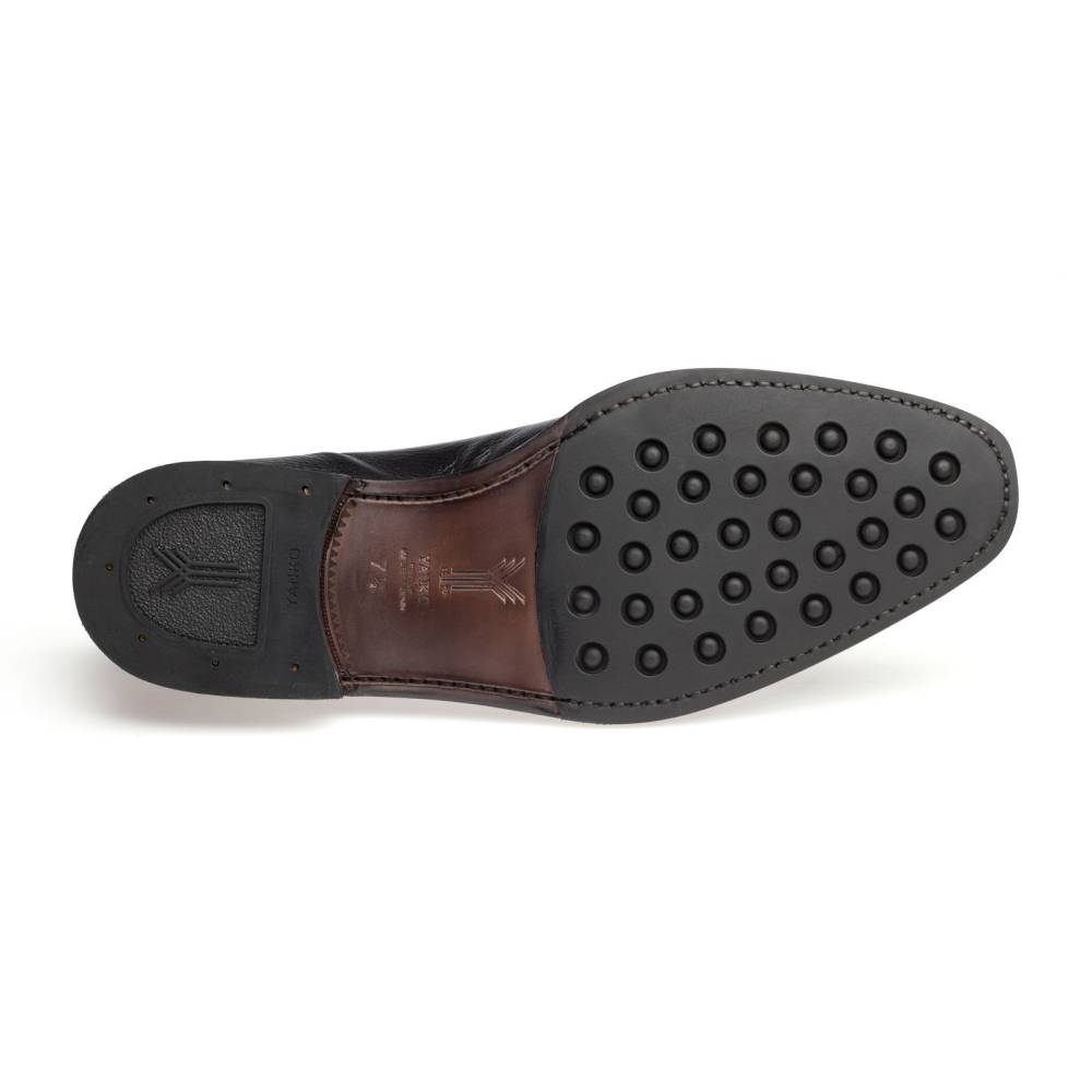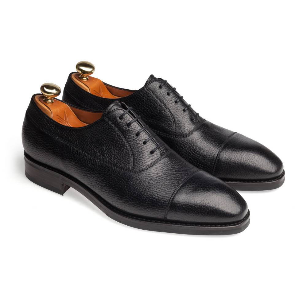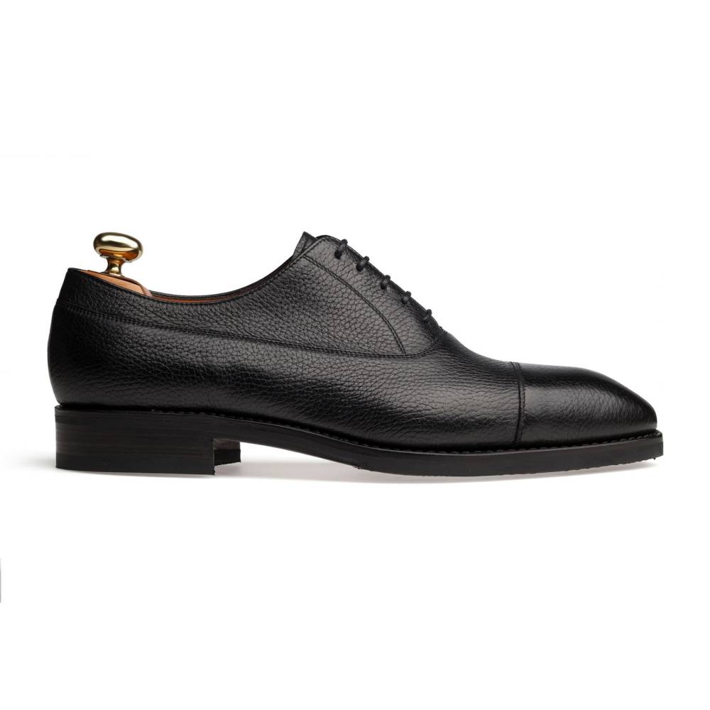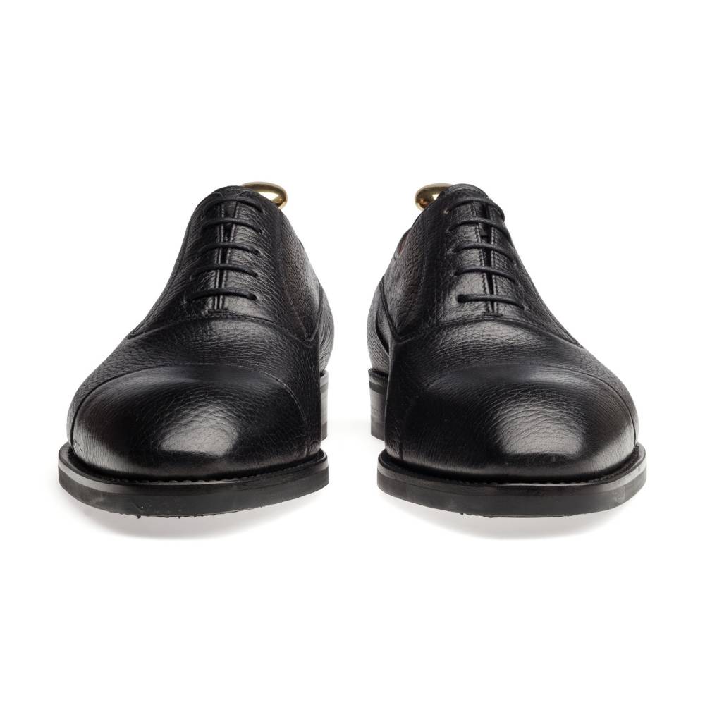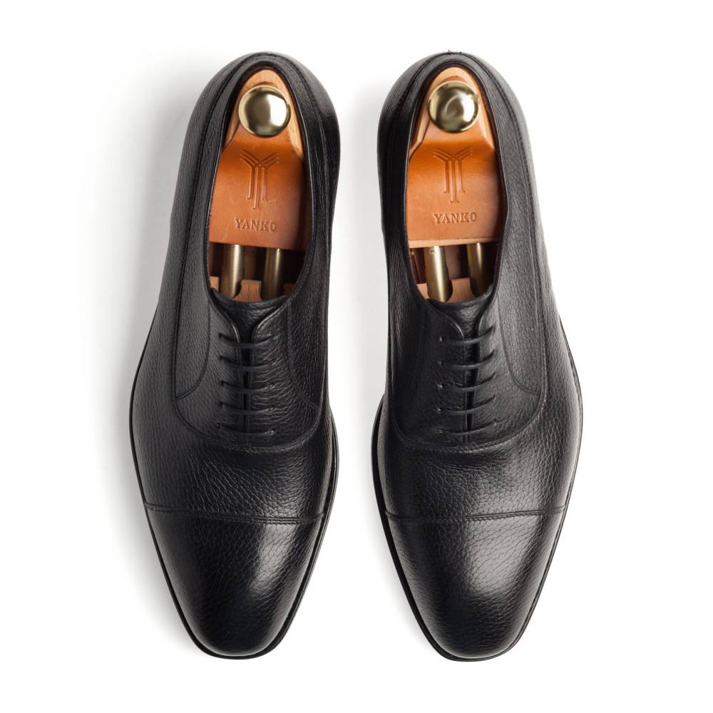 Традиционные формальные туфли оксфорды с отрезным мысом испанского бренда Yanko. Модель представляет собой тип Balmoral Oxford - разновидность классических оксфордов, когда союзка уходит к пяточной части и подчеркивается диагональной строчкой. Верх выполнен из мягкой приятной на ощупь оленьей кожи с зернистой текстурой. Подошва состоит из кожи и резины, что делает данную обувь подходящей для дождливой погоды. Особенностью этой колодки является лёгкий скос на носке, который добавляет модели характерную для испанской обуви элегантность. Конструкция Goodyear Welted.