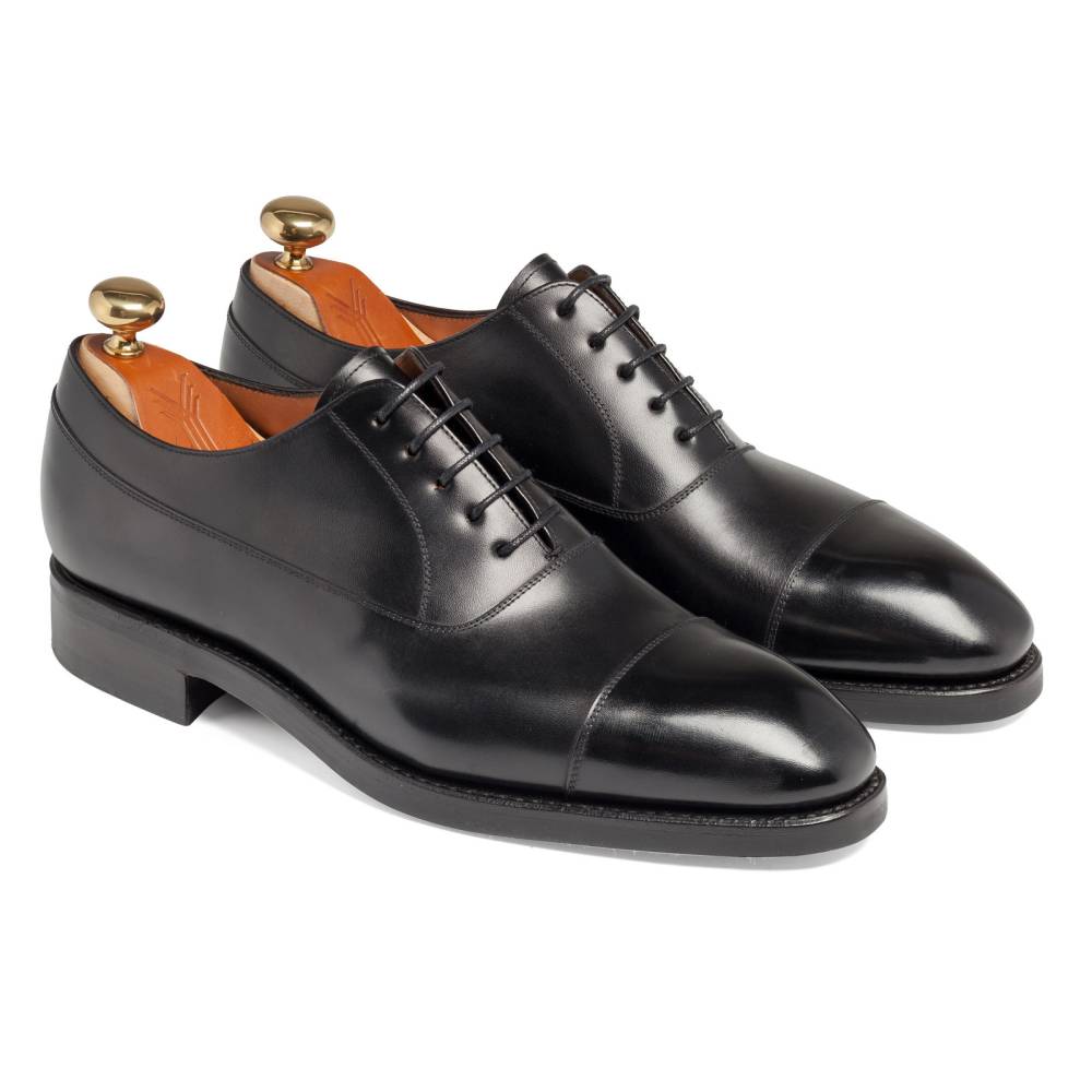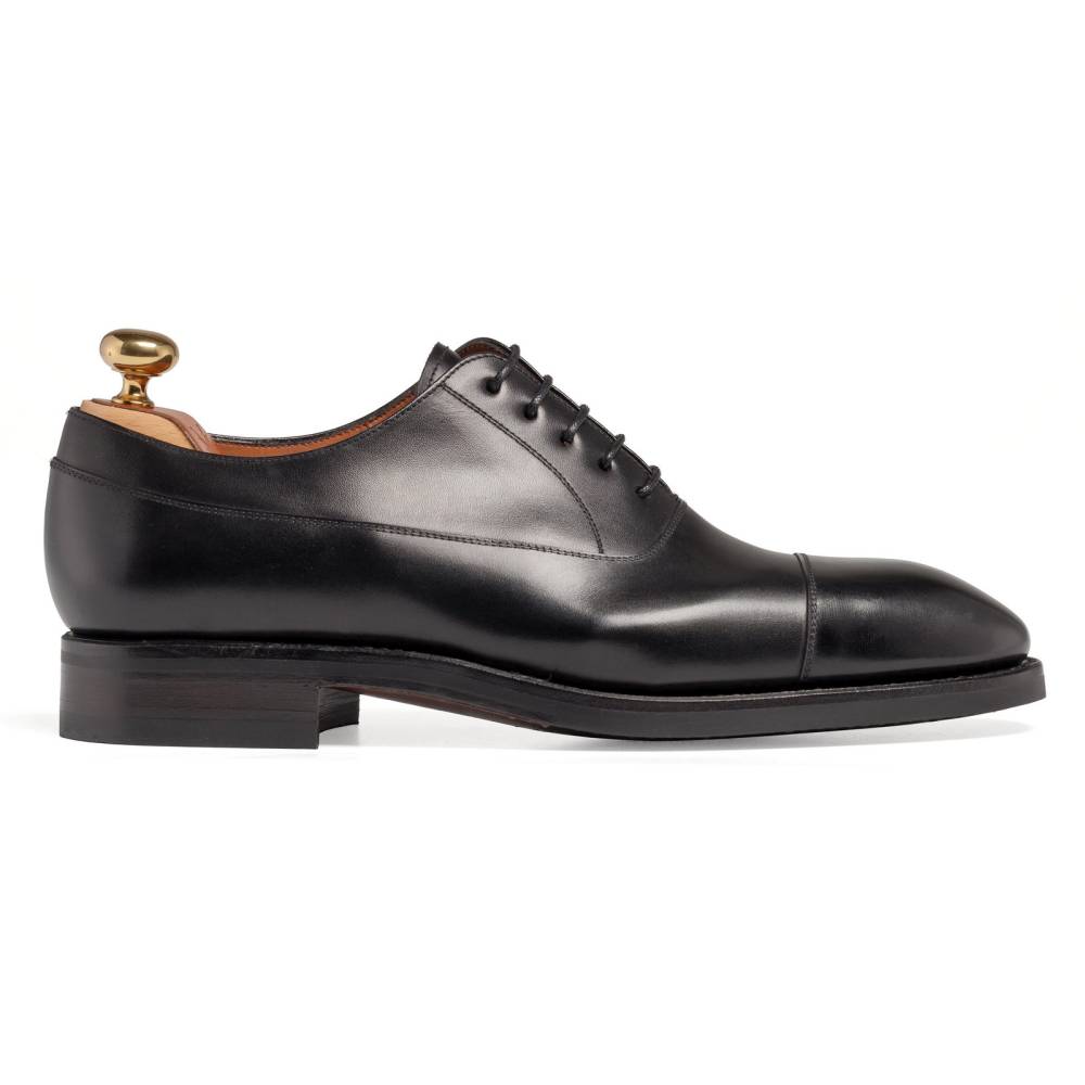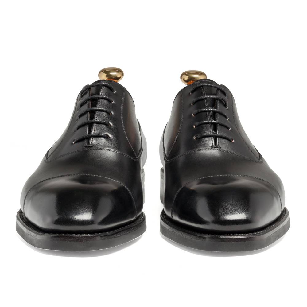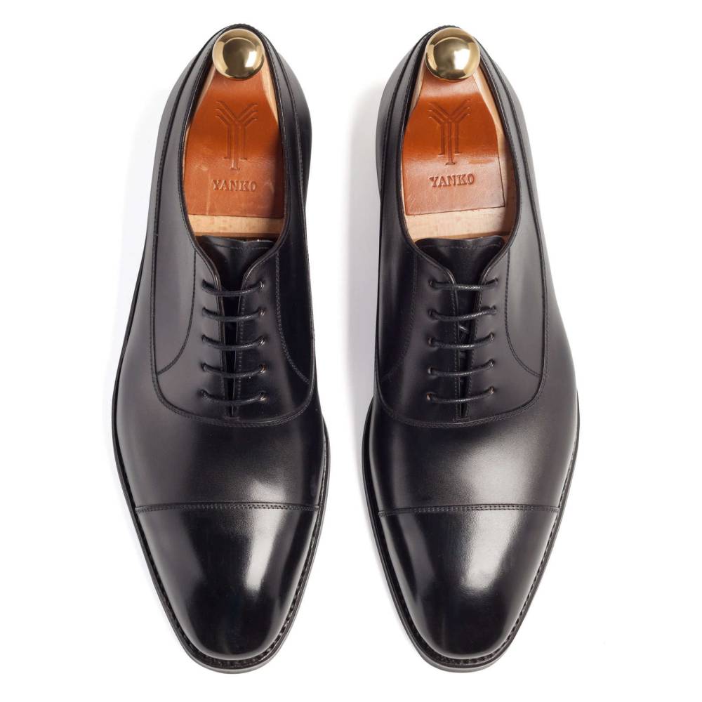 Традиционные формальные туфли оксфорды с отрезным мысом испанского бренда Yanko. Модель представляет собой тип Balmoral Oxford - разновидность классических оксфордов, когда союзка уходит к пяточной части и подчеркивается диагональной строчкой. Верх модели полностью выполнен из плотной телячьей кожи чёрного цвета. Подошва состоит из кожи и резины, что делает данную обувь подходящей для дождливой погоды. Особенностью этой колодки является лёгкий скос на носке, который добавляет модели характерную для испанской обуви элегантность. Конструкция Goodyear Welted.