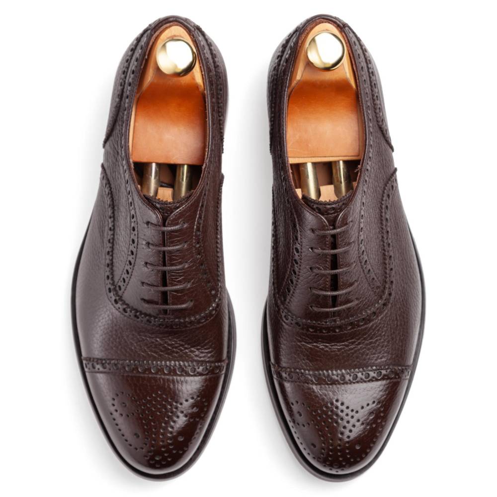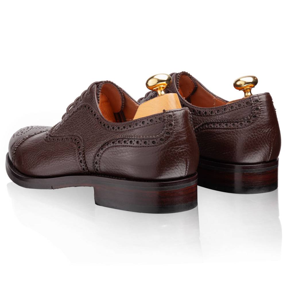 Классические полуброги тёмно-коричневого цвета в исполнении фабрики Yanko. Верх выполнен из мягкой приятной на ощупь оленьей кожи с зернистой текстурой. Подошва этих туфель изготовлена из кожи и резины. Такое сочетание материалов позволяет носить обувь даже в дождливую погоду, не жертвуя при этом удобством. Конструкция Goodyear Welted.