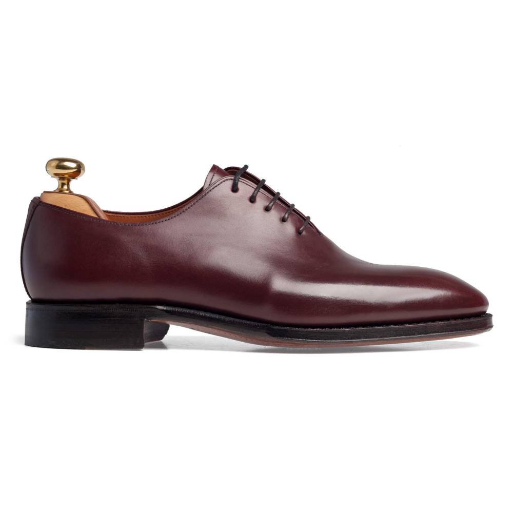 Бордовые туфли оксфорды Yanko на кожаной подошве. Верх выполнен из цельной телячьей кожи. Единственный шов расположен в области пятки. Внутренняя отделка из тонкой кожи горчичного оттенка. Конструкция Goodyear.
