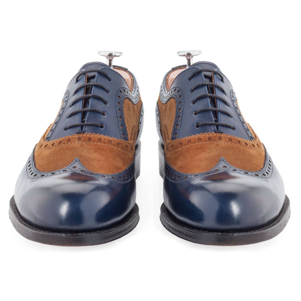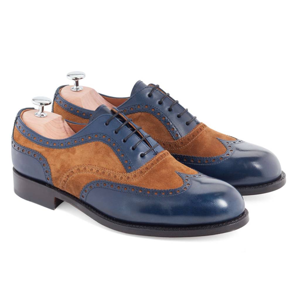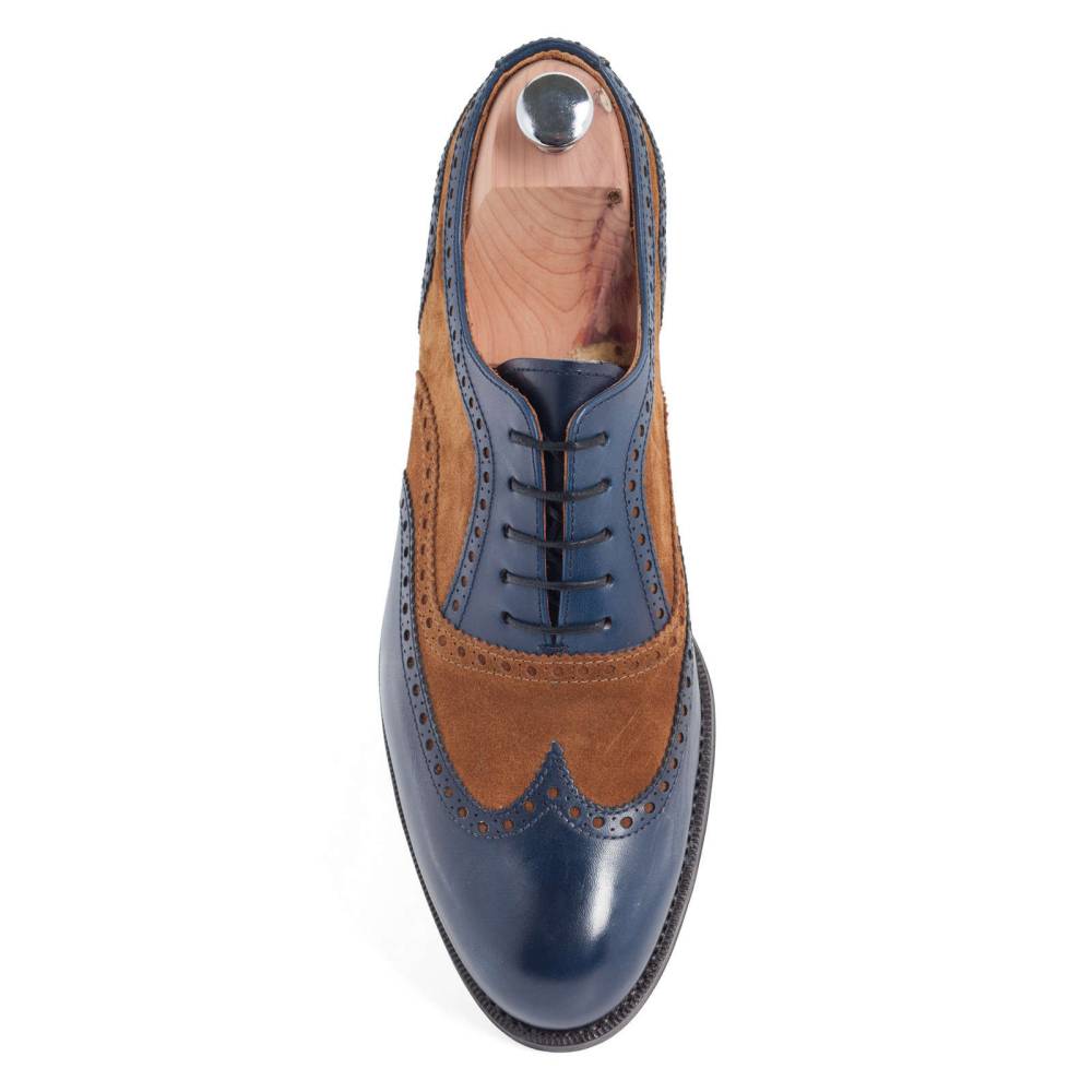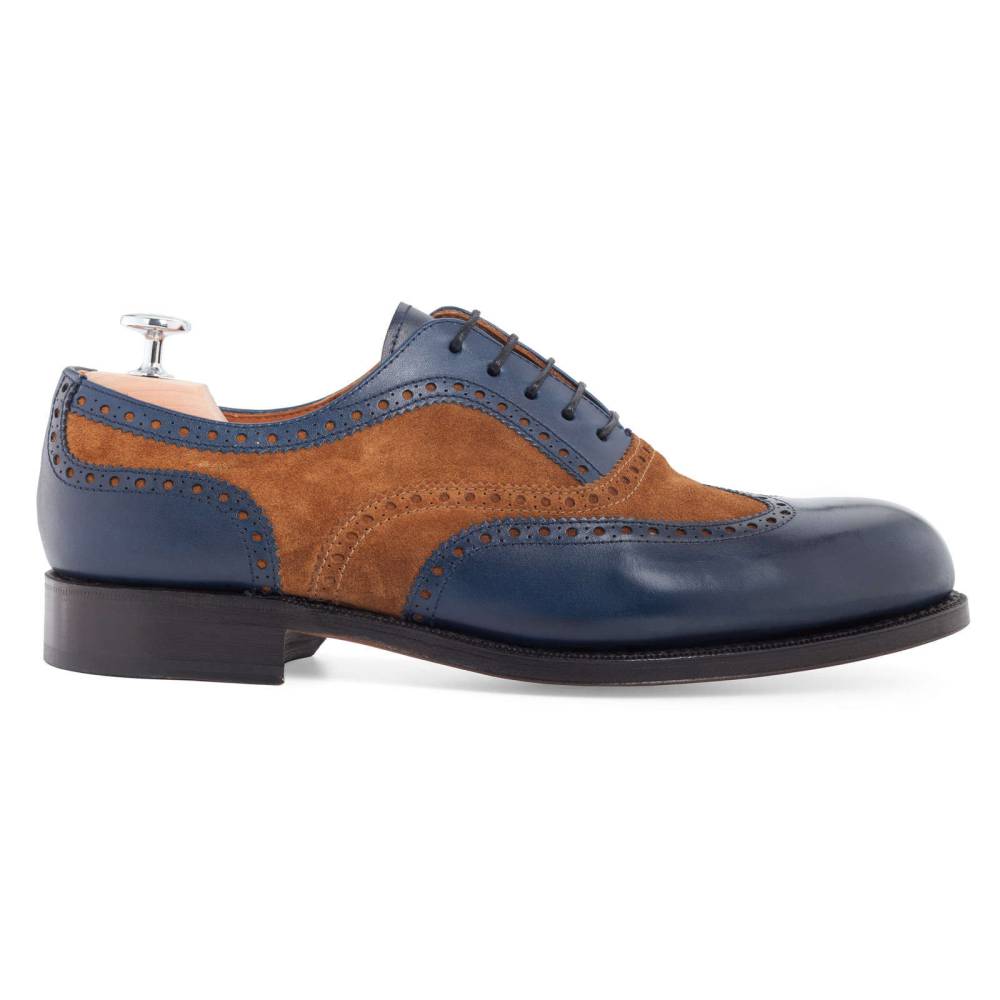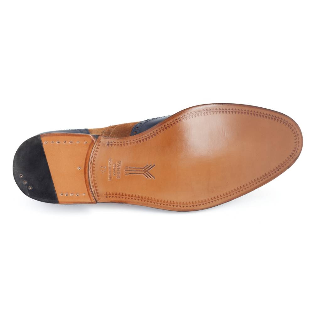 Двухцветные броги Yanko на кожаной подошве. Верх модели выполнен из тёмно-синей телячьей кожи в сочетании с бархатистой замшей песочного оттенка. Подкладка из мягкой кожи бежевого цвета. Конструкция Goodyear.