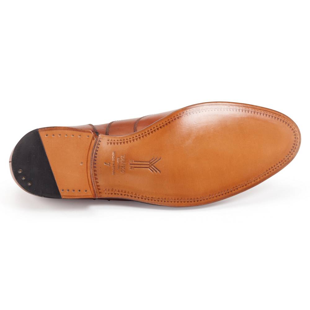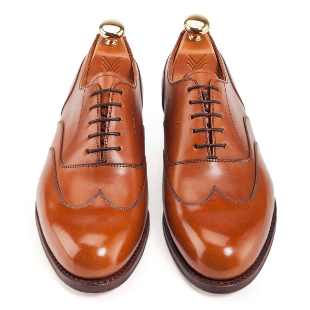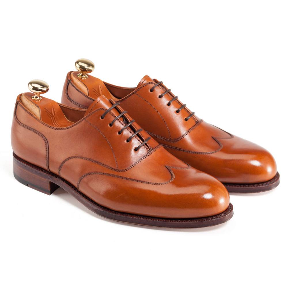 Оксфорды Yanko на кожаной подошве. Верх модели выполнен из плотной телячьей кожи светло-коричневого цвета. Особенностью модели является лаконичный дизайн, лишенный перфорации, но в то же время напоминающий узор брог. Конструкция Goodyear Welted.