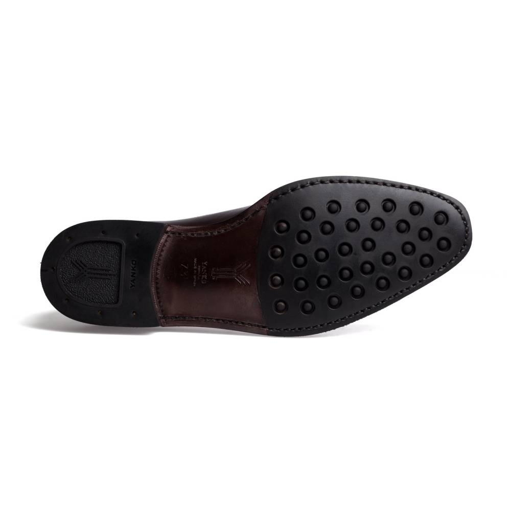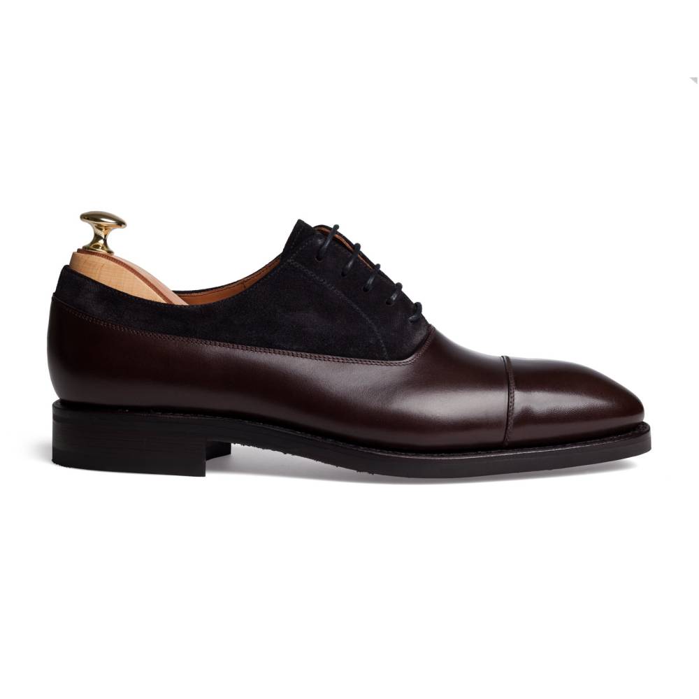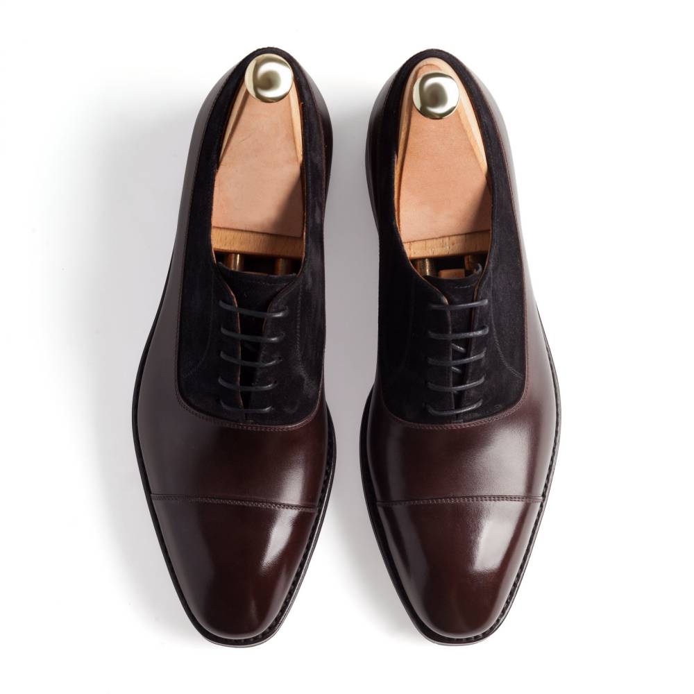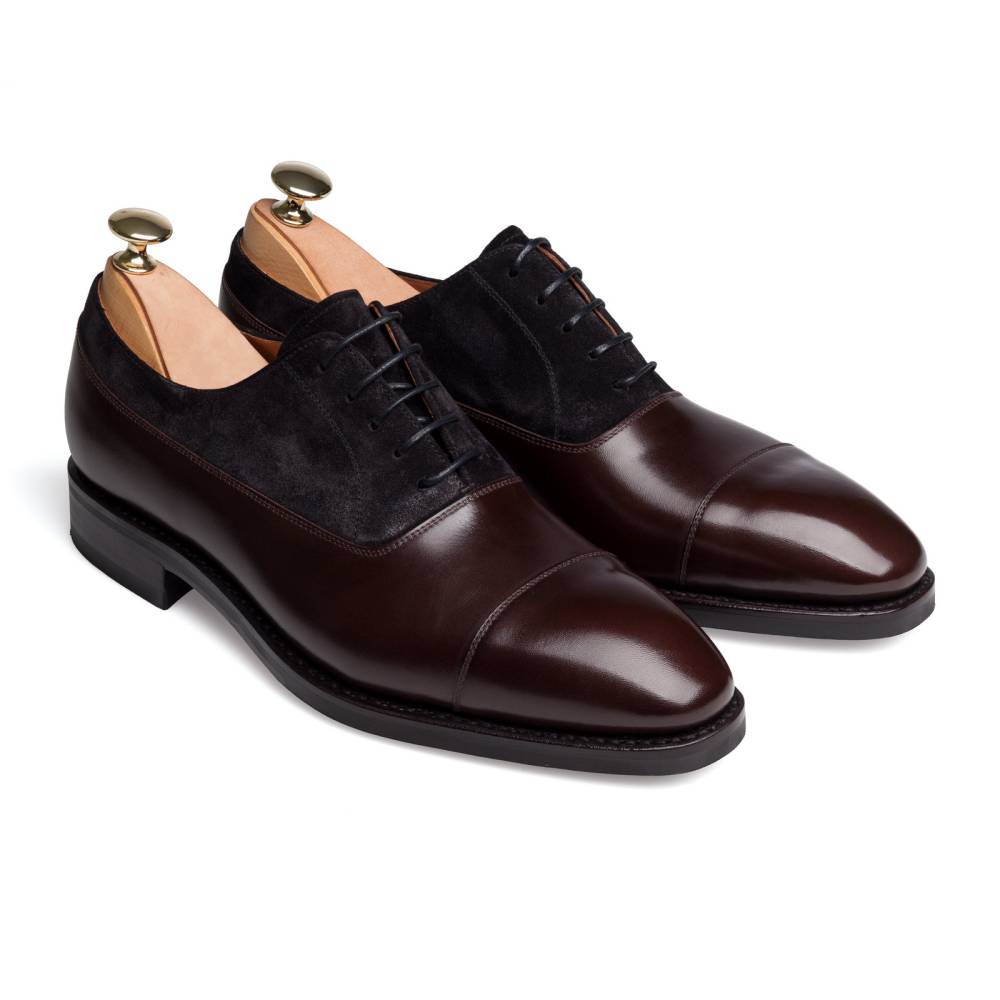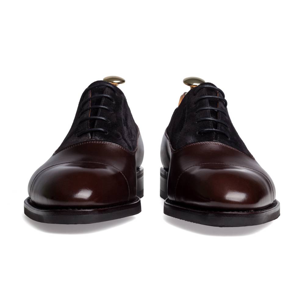 Элегантные двухцветные оксфорды изготовлены фабрикой Yanko по специальному заказу бутика Checkroom. Модель представляет собой тип Balmoral Oxford - разновидность классических оксфордов, когда союзка уходит к пяточной части и подчеркивается диагональной строчкой. Оригинальное сочетание тёмно-коричневого и чёрного цветов дополняется сочетанием фактур гладкой телячьей кожи и замши. Подошва состоит из кожи и резины, что позволяет носить обувь и в дождливую погоду. Конструкция Goodyear Welted.
