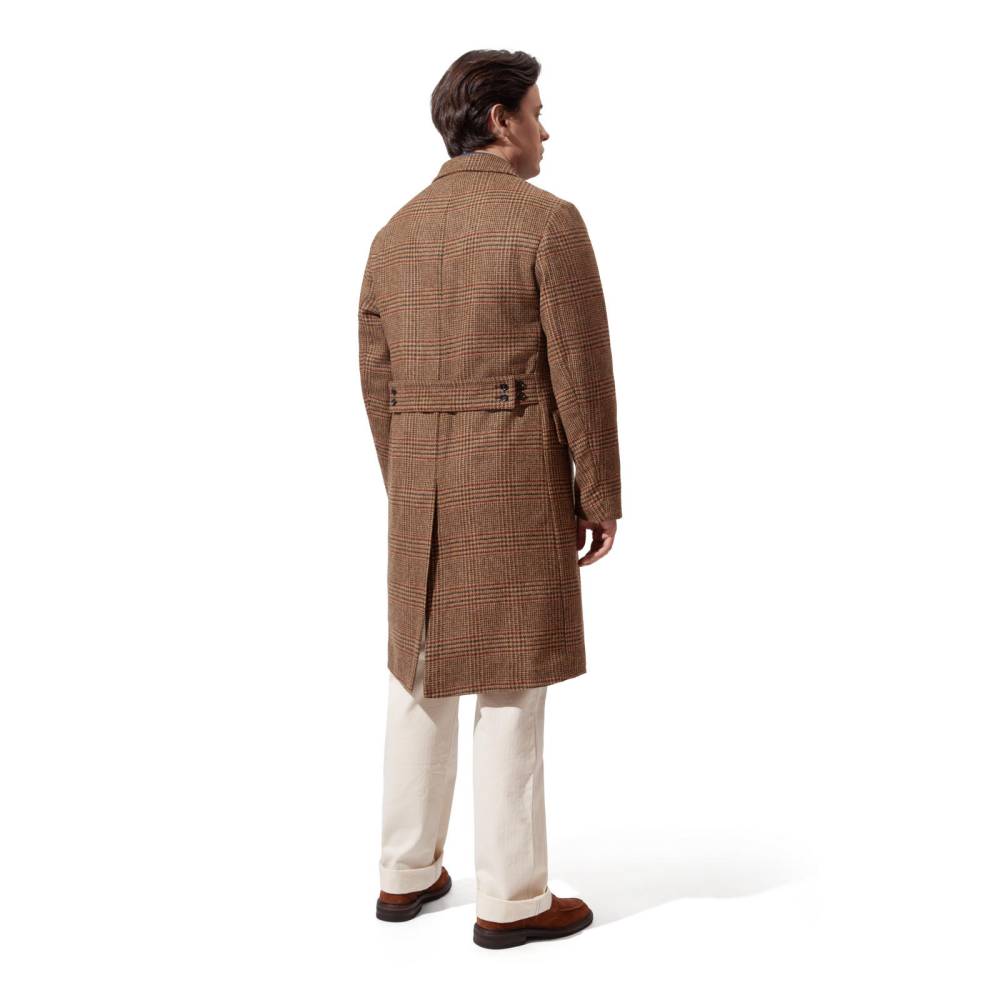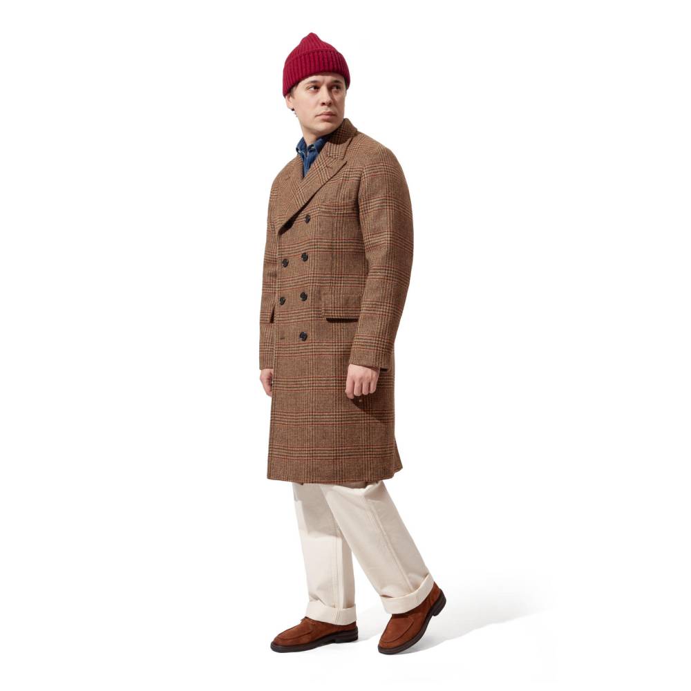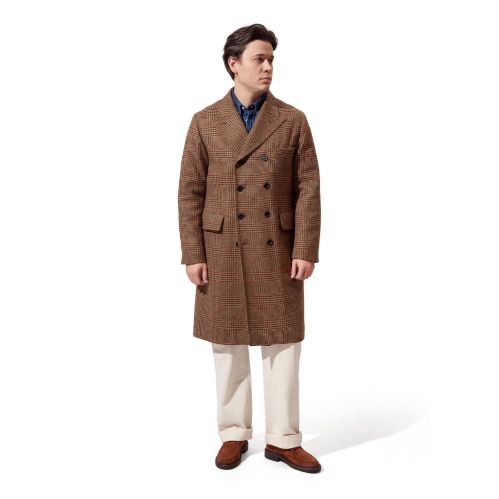 Мужское двубортное пальто приталенного силуэта от итальянского бренда L`impermeabile. Модель вдохновлена традиционными военными шинелями, используемыми британской армией в XX веке. Адаптированный вариант немного короче своих исторических собратьев и значительно легче, что делает его более практичным для города. Пальто выполнено из плотной, непереработанной Шетландской шерсти с классическим рисунком — клетка Принц Уэльский (Prince of Wales). Подкладка выполнена из хлопка и полиэстера саржевого плетения. С внешней стороны два вместительных накладных кармана с клапанами по бокам и один нагрудный карман. Внутри расположены еще два кармана. Сзади талию подчеркивает функциональный полупояс на пуговицах, который можно регулировать. Благодаря шлице сзади пальто не стесняет движений.