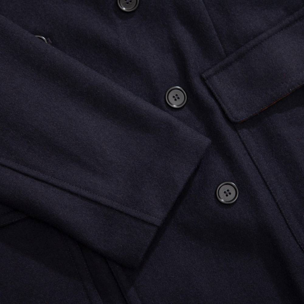 Мужское двубортное пальто приталенного силуэта с лацканами и шлицей от итальянского бренда L`impermeabile. Вдохновлено традиционными военными моделями, используемыми британской армией в XX веке. Адаптированный вариант немного короче своих собратьев и значительно легче. Пальто выполнено из плотной фактурной шерсти с добавлением синтетических волокон для придания большей устойчивости к осадкам. С внешней стороны по бокам два вместительных кармана с клапанами и один нагрудный. Подкладка выполнена из тонкого бежевого текстиля из хлопка и полиэстера. Внутри два кармана. Сзади талию подчёркивает функциональный пояс на пуговицах.