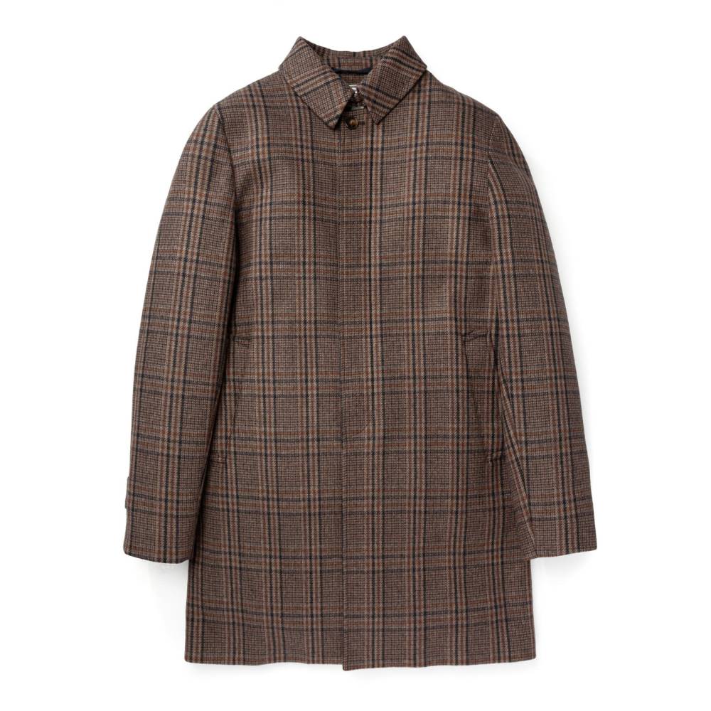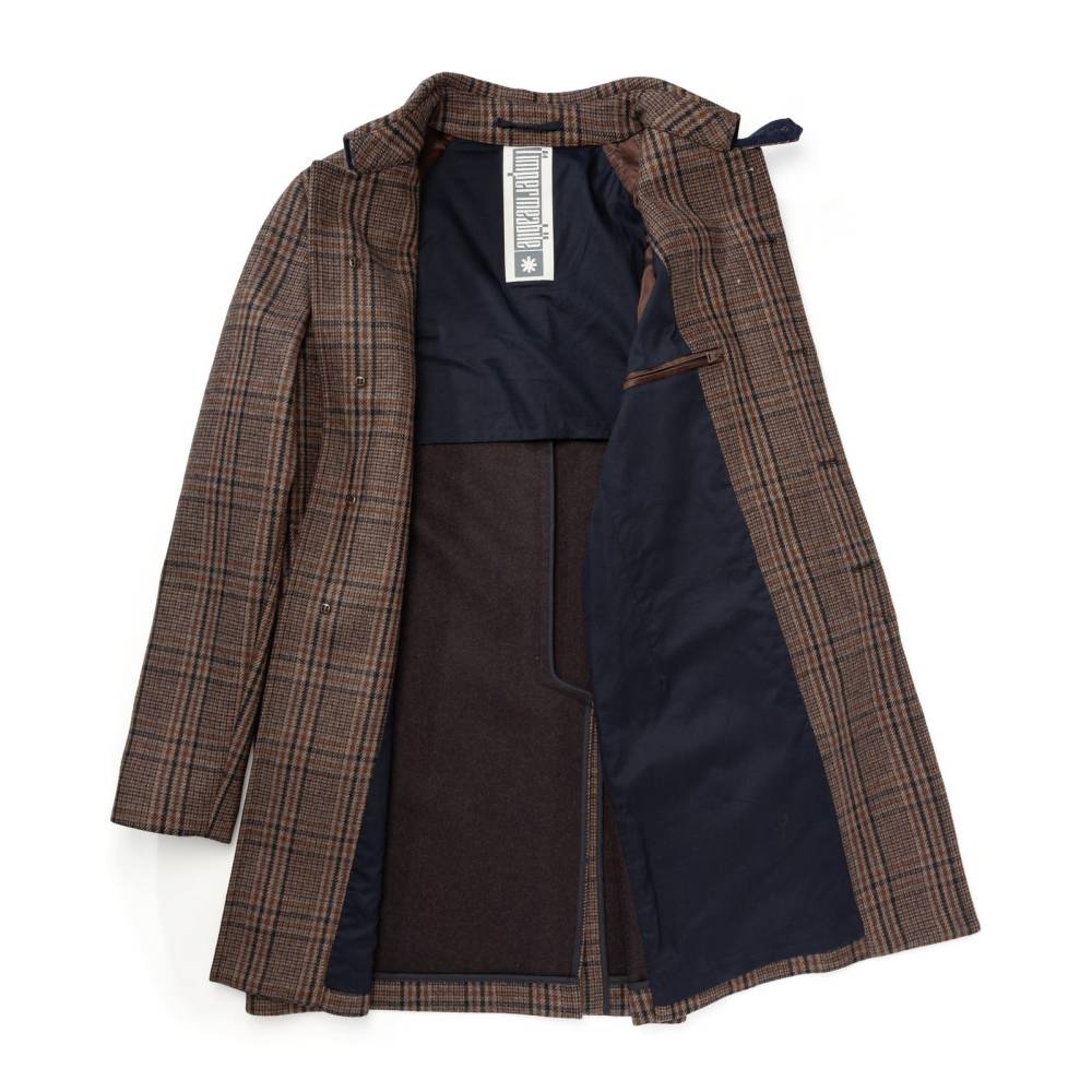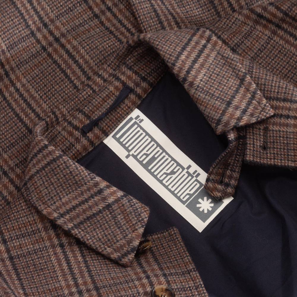Стильное шерстяное пальто Martlan итальянского бренда L`Impermeabile без подкладки. Примечательно то, что сама ткань является двойной: с внешней стороны клетчатый узор тартан в коричневых тонах, а с внутренней – однотонная поверхность. Также бортовка и часть спинки дополнительно уплотнены тёмно-синим текстилем. Модель умеренно свободного силуэта застёгивается на пуговицы. Два внешних кармана и два внутренних.