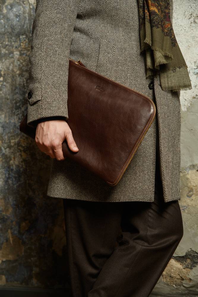 Элегантная и сдержанная кожаная папка для документов, в которую без труда поместится и ноутбук. Внутри имеются два кармана, один из которых застегивается на молнию. Такая папка станет незаменимым спутником делового человека, которому необходимо всегда держать под рукой важные документы. Подкладка выполнена из высококачественной бархатистой алькантары бежевого цвета, а фурнитура — из латуни. В производстве используется кожа растительного дубления — приятная на ощупь, с мягким матовым блеском, зернистая и упругая. Такая кожа ценится за долговечность, а также за благородный винтажный вид, который приобретается с течением времени.
