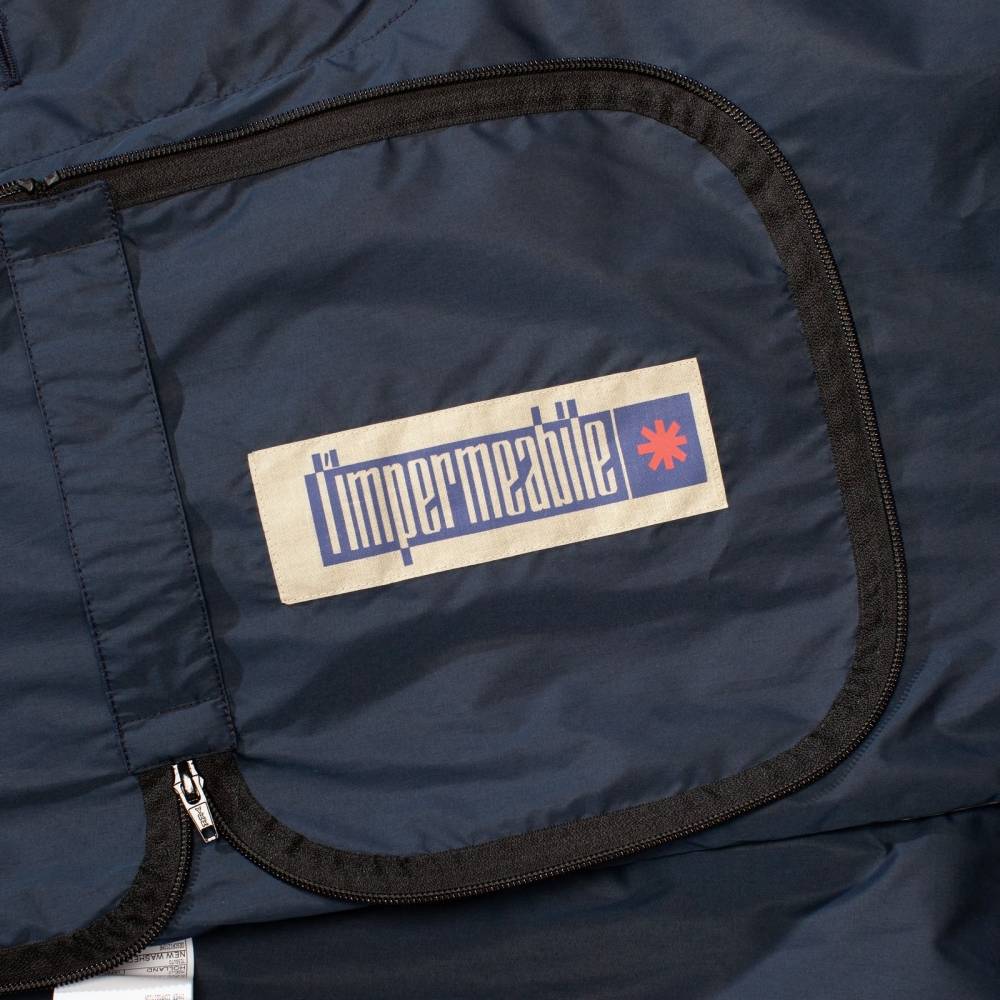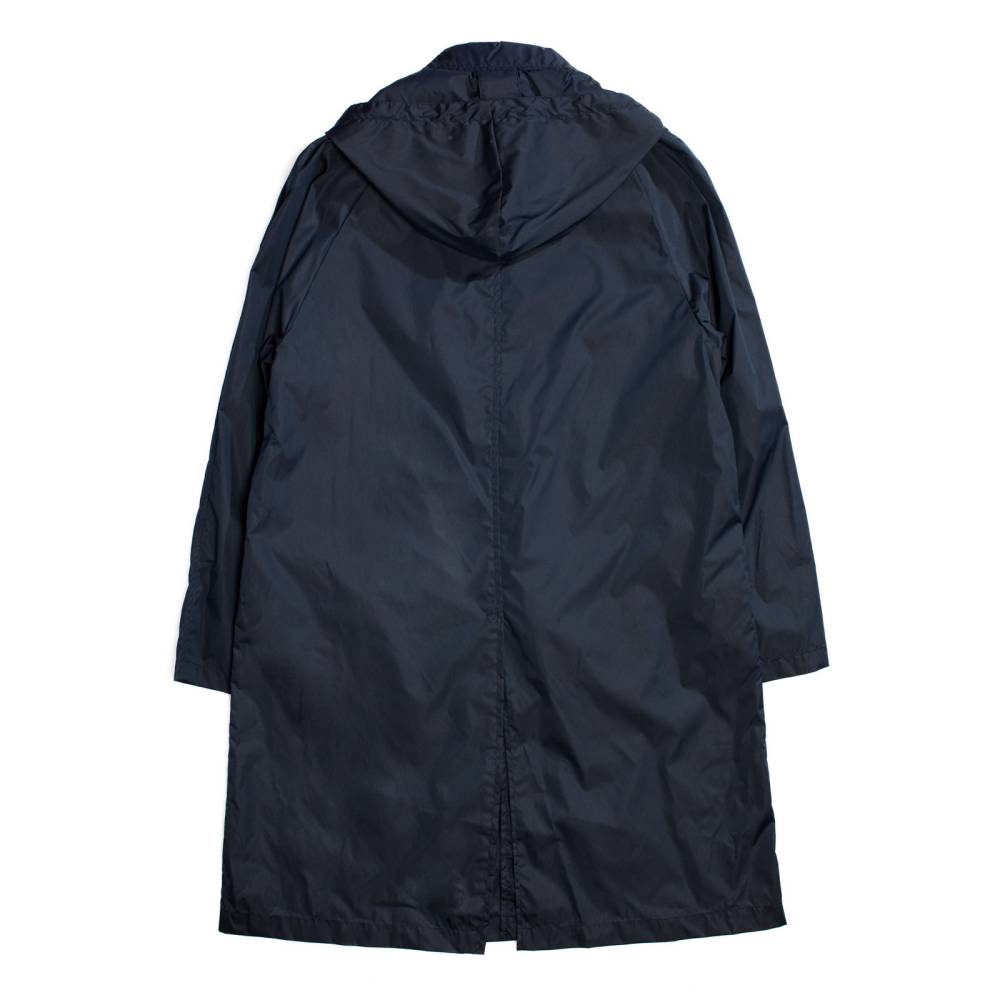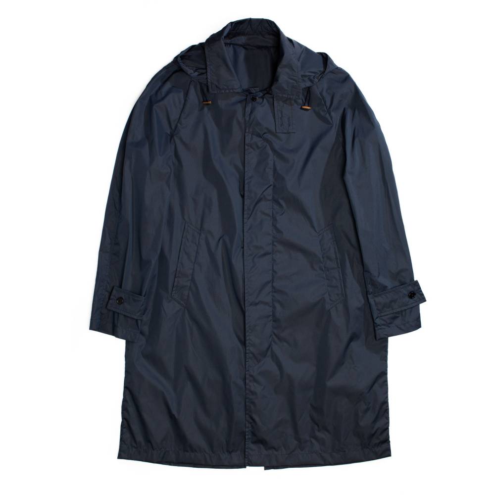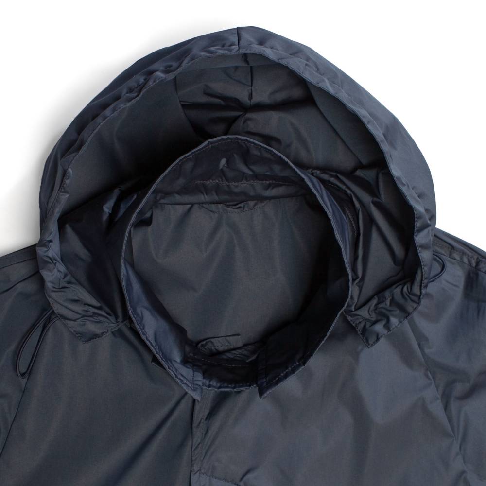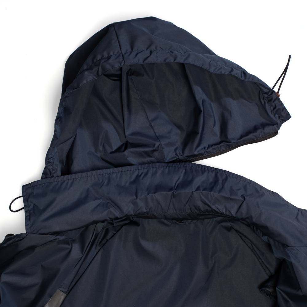 Лёгкая водонепроницаемая парка Holland итальянского бренда L`Impermeabile свободного кроя. Модель выполнена из тонкого прорезиненного полиэстера синего цвета. Застегивается на пуговицы, скрытые под планкой. С внешней стороны расположены два кармана по бокам. Капюшон пристёгивается на молнию и регулируется при помощи кулисок. Внутри имеются функциональный карман на пуговице, а также карман-сумка, в которую компактно складывается сама парка. Практичный и удобный предмет гардероба, который можно брать с собой в поездки и командировки. Лаконичный дизайн и традиционный силуэт делают эту парку подходящей абсолютно ко всем стилям одежды.