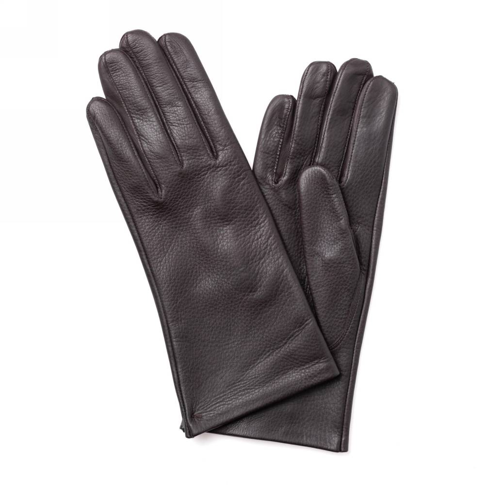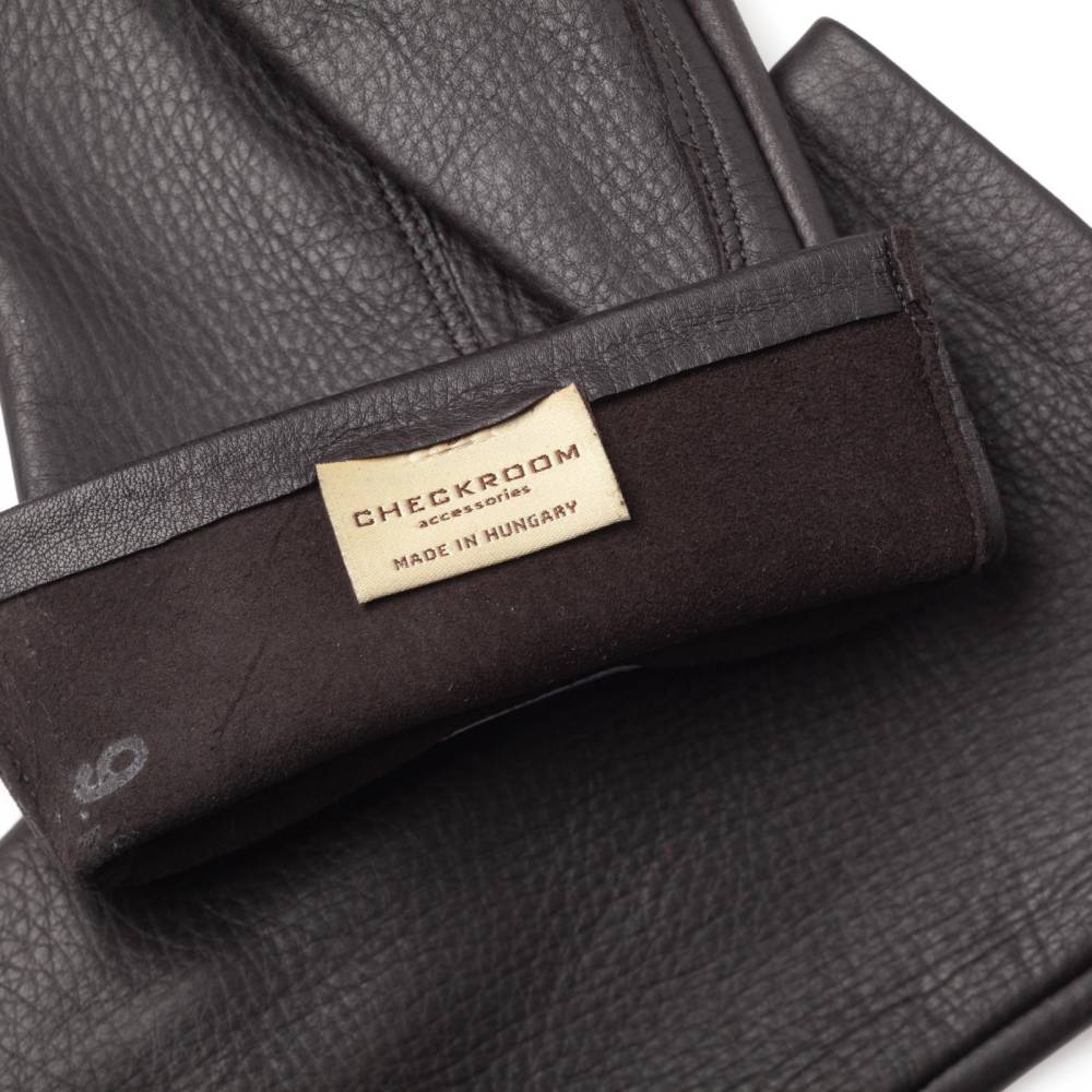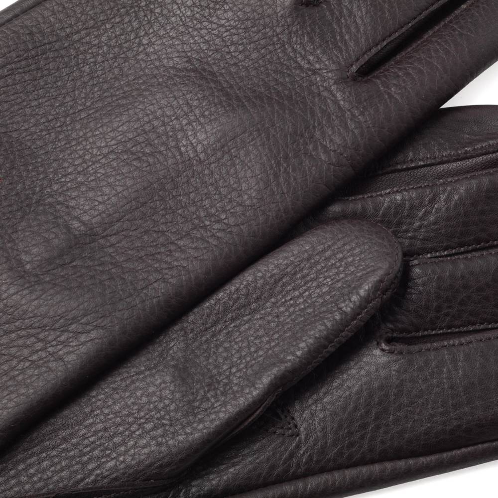 Удлинённые классические мужские перчатки без подкладки. Модель выполнена из эластичной оленьей кожи тёмно-коричневого цвета. Благодаря лаконичному дизайну и неброской фактуре эти перчатки хорошо впишутся в повседневный классический гардероб современного мужчины: они отлично смотрятся с шерстяными пальто, фактурными пиджаками и брюками из вельвета, фланели или других фактурных тканей.