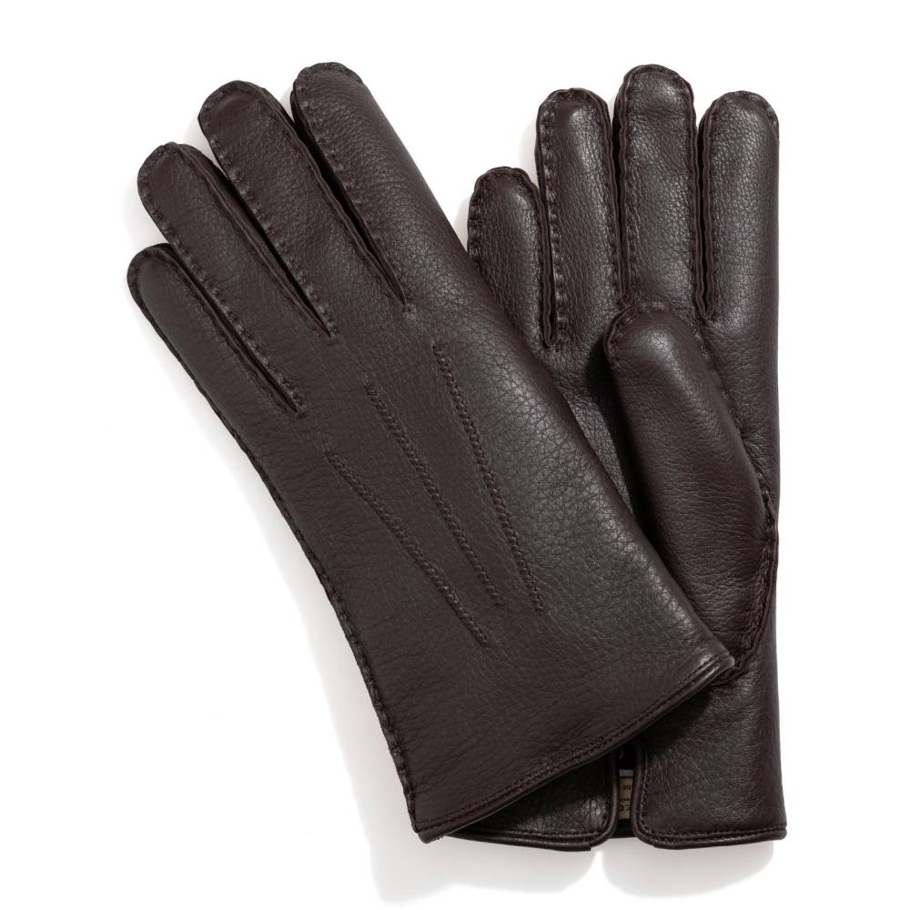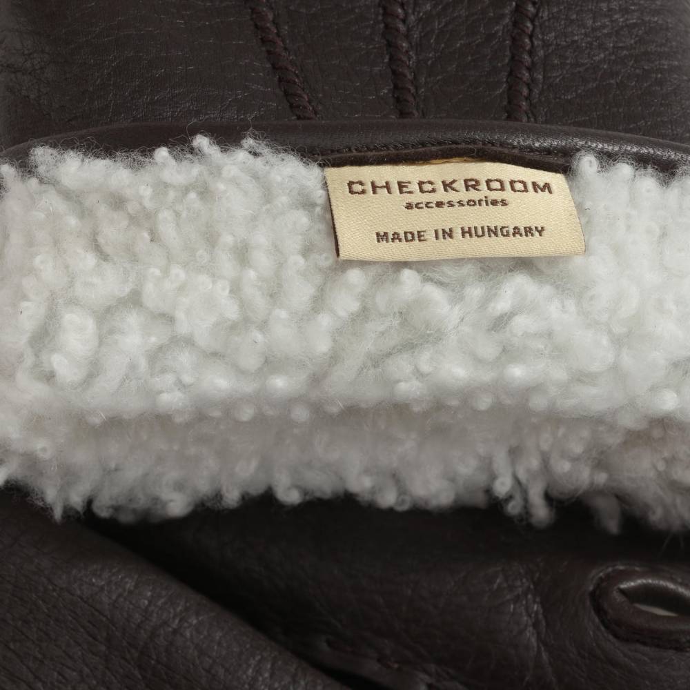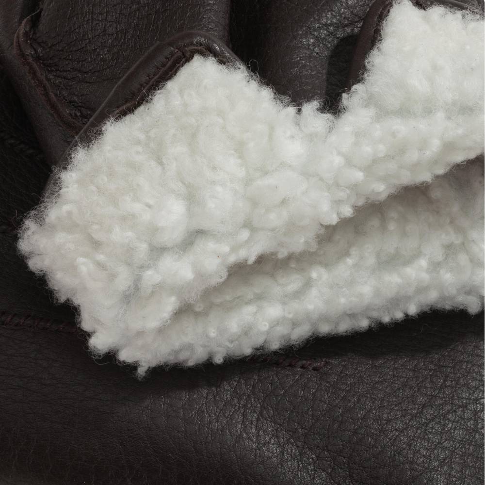 Тёплые лаконичные мужские перчатки Checkroom классического дизайна из мягкой оленьей кожи тёмно-коричневого цвета. Подкладка выполнена из густого натурального меха белого цвета. С обратной стороны ладони модель декорирована традиционными строчками в виде трезубца. Перчатки прекрасно защищают от холода и ветра в зимнюю погоду.
