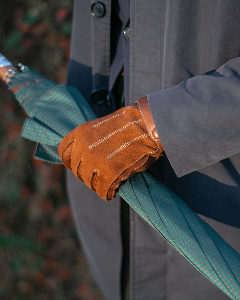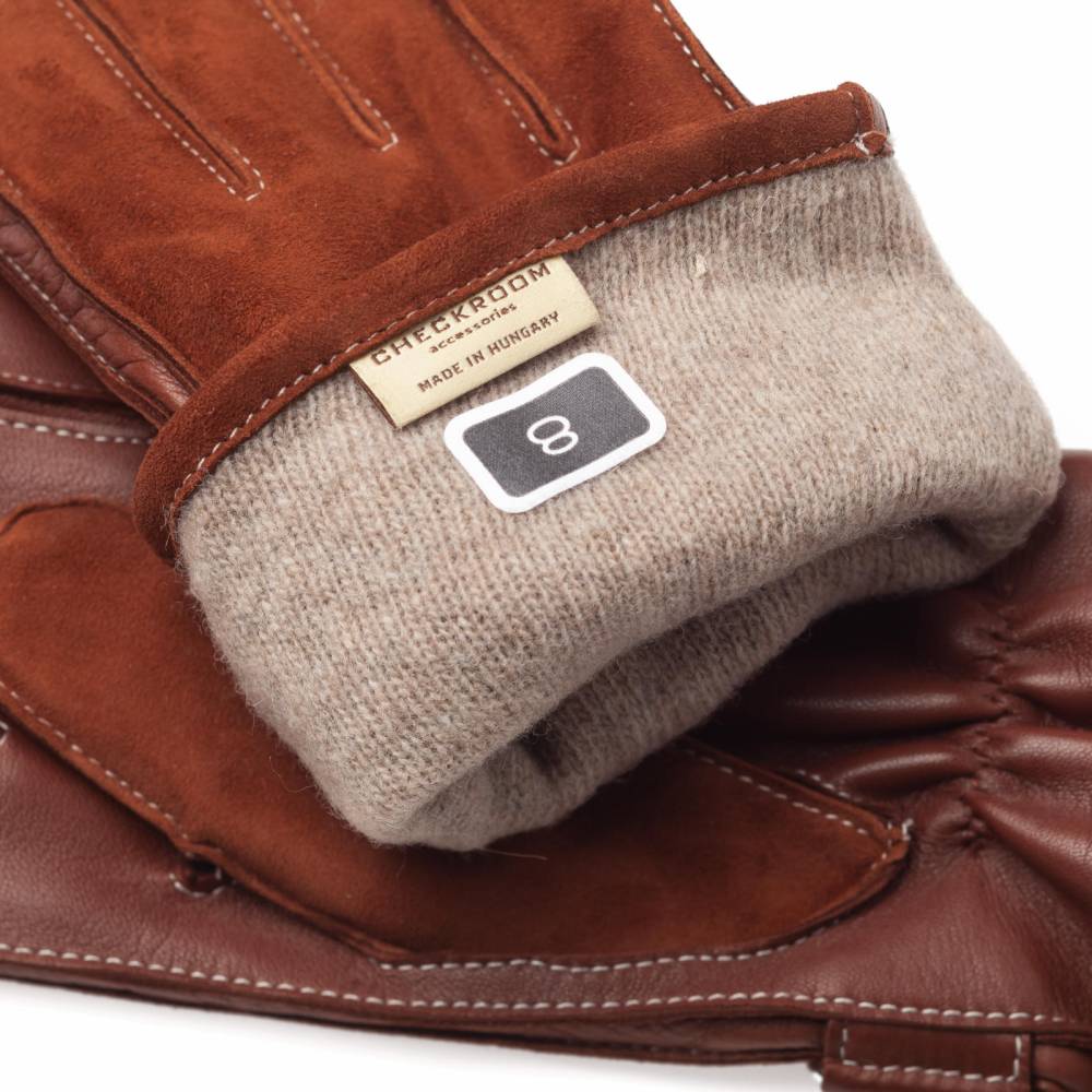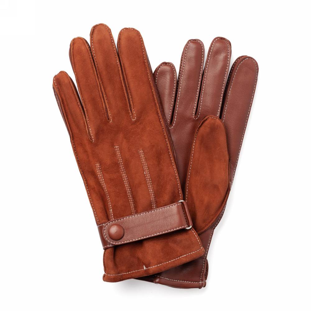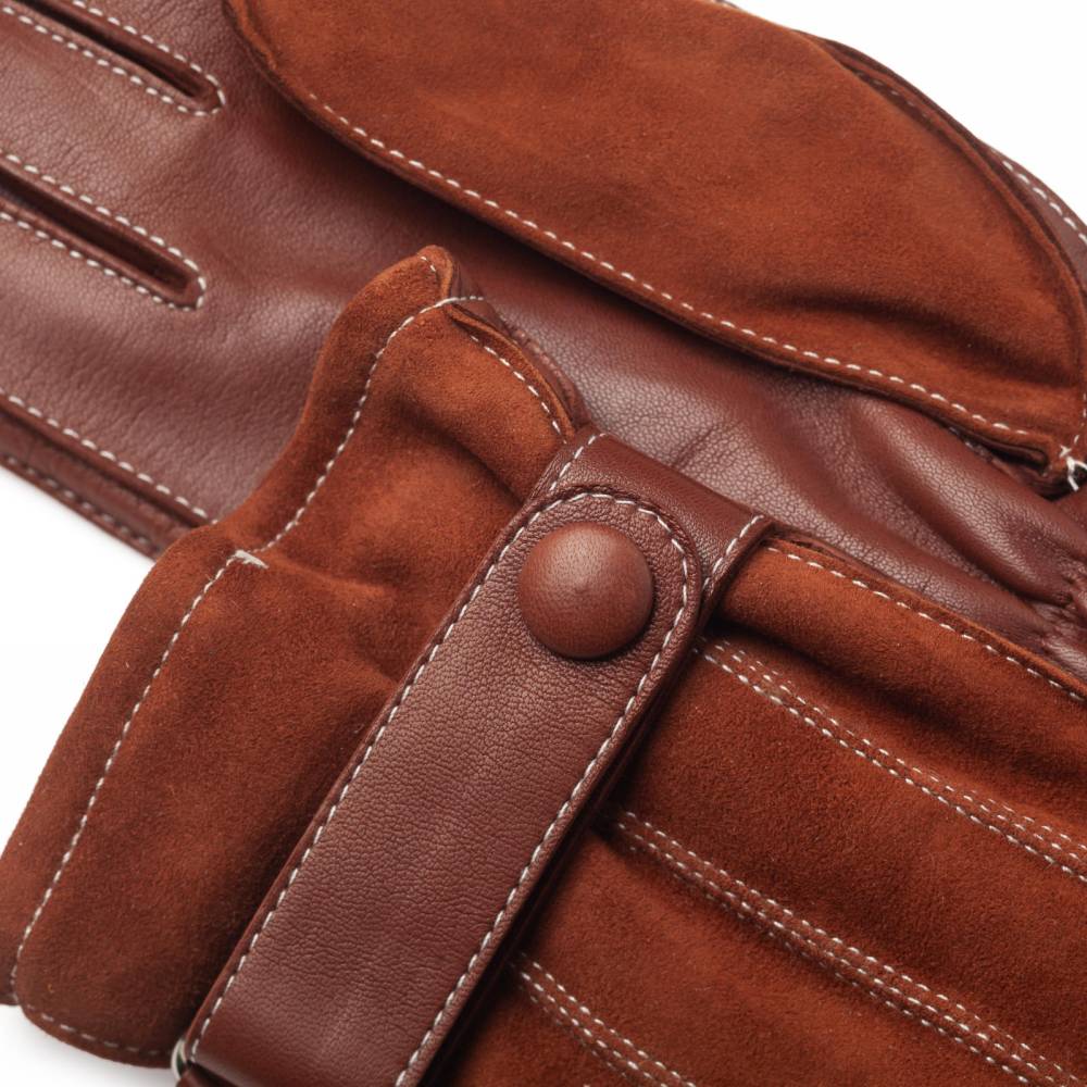 Элегантные мужские перчатки коричневого цвета. Модель сочетает мягкую эластичную кожу ягнёнка и бархатистую замшу из кожи козы. Благодаря застёжке в области запястья, перчатки лучше облегают руку и комфортнее сидят. Подкладка выполнена из чистой шерсти. Такие перчатки можно носить осенью и зимой, когда температура опускается не ниже -5 °С.