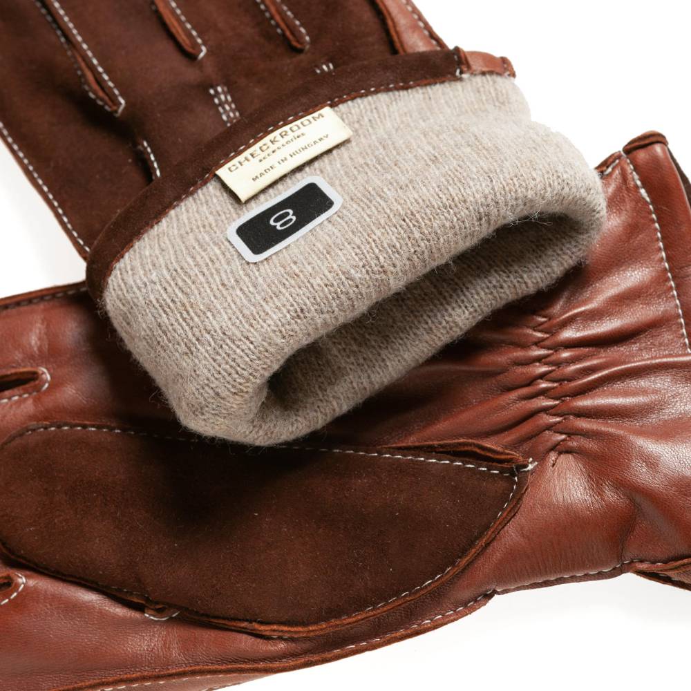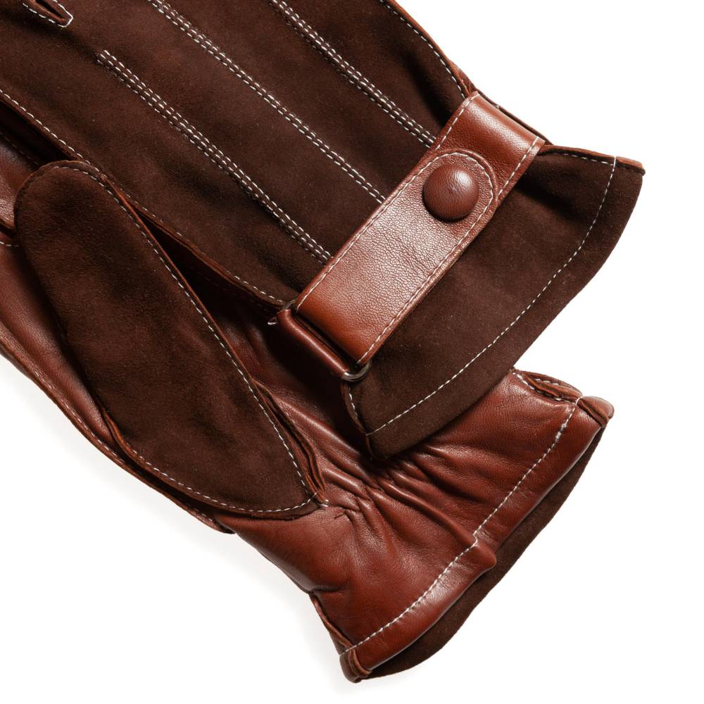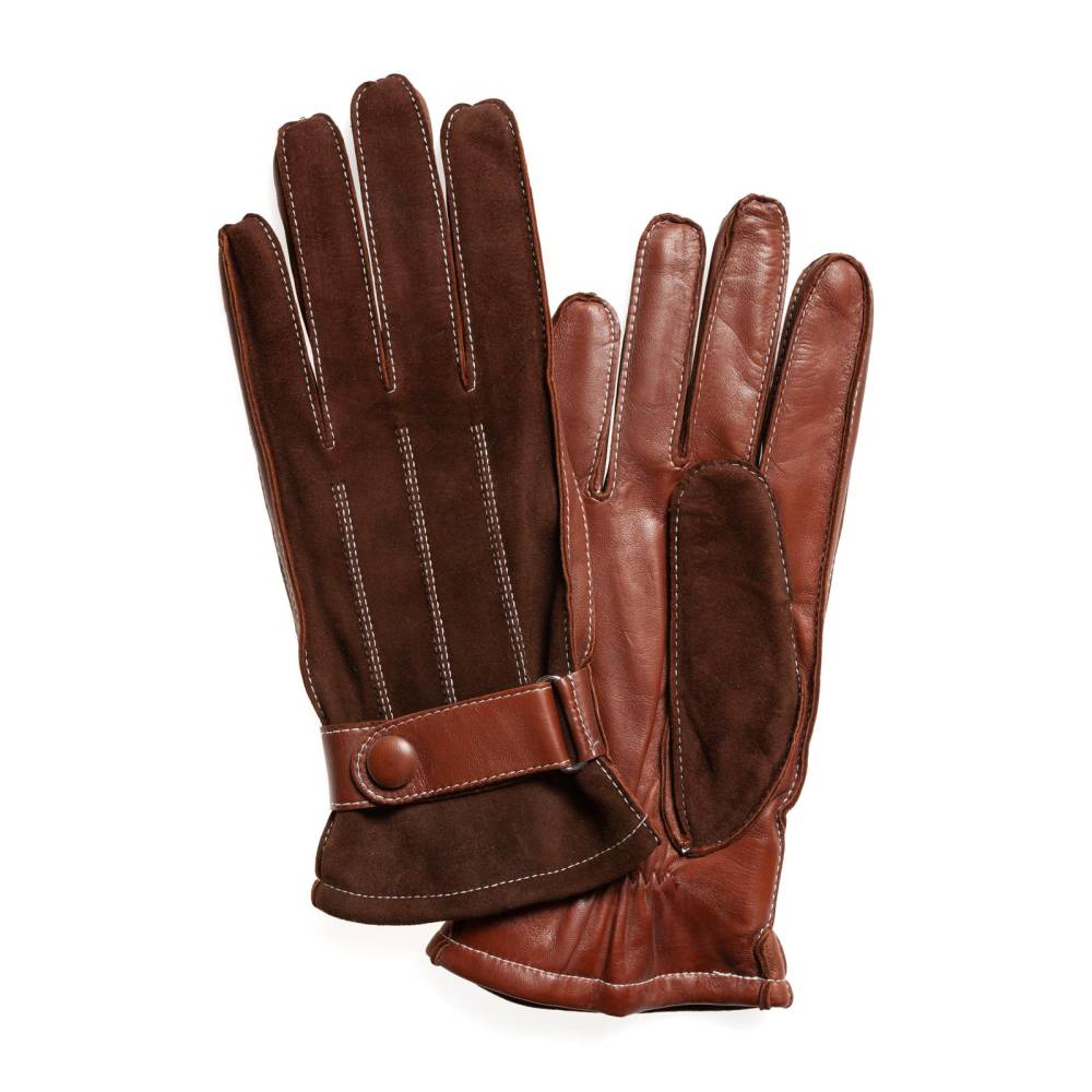 Стильные тёмно-коричневые мужские перчатки, сшитые из мягкой эластичной кожи ягнёнка и бархатистой замши из кожи козы. Благодаря застёжке в области запястья, перчатки лучше облегают руку и комфортнее сидят. Подкладка выполнена из чистой шерсти. Такие перчатки можно носить осенью и зимой, когда температура опускается не ниже -5 °С.