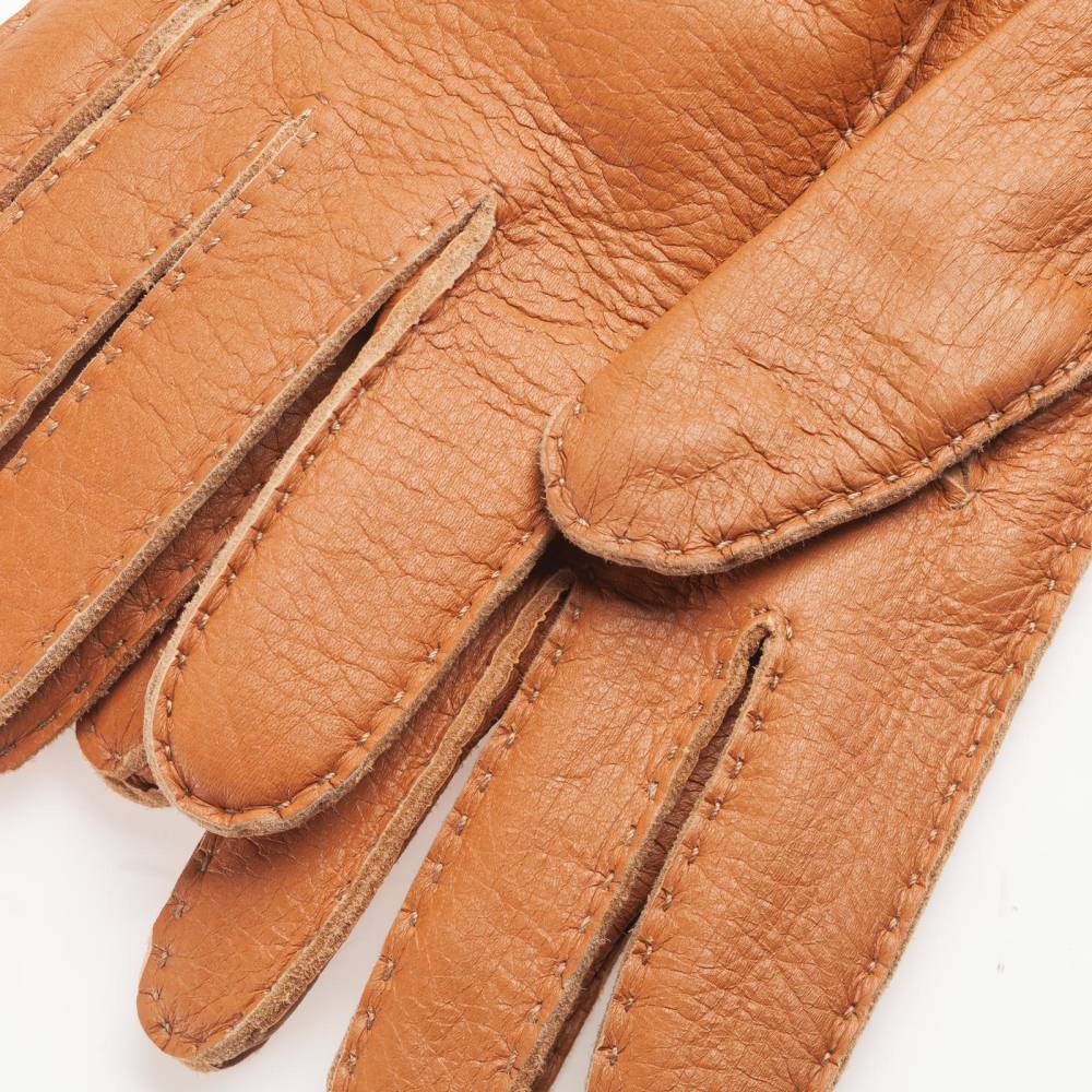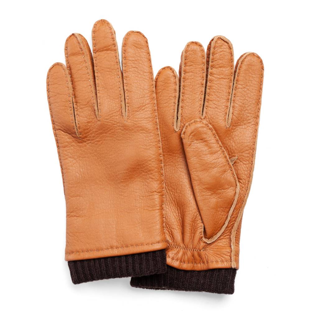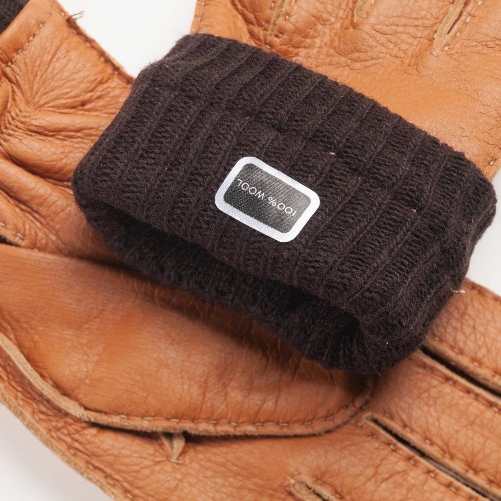 Тёплые мужские перчатки Checkroom выполнены из мягкой приятной на ощупь оленьей кожи светло-коричневого цвета. Область запястья с внутренней стороны дополнена эластичной вставкой, которая позволяет быстро и легко надевать перчатки. Подкладка выполнена из натуральной шерсти. Модель имеет удлиненный фасон за счет тёплого вязаного манжета. Перчатки подойдут для осенней и зимней погоды с температурой до – 7 °С.