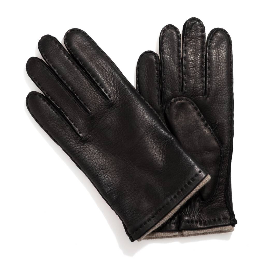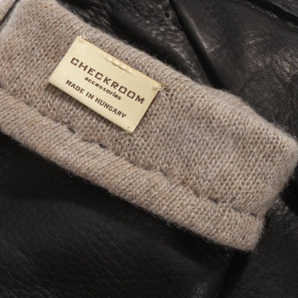 Лаконичные мужские перчатки созданы по специальному заказу бутика Checkroom в Венгрии. Модель выполнена из мягкой, приятной на ощупь кожи оленя чёрного цвета. Благодаря укороченному фасону, перчатки не задевают рукава куртки или пиджака. Подкладка выполнена из мягкой 100% шерсти серого цвета и слегка выдаётся наружу, образуя тонкий манжет. Перчатки выглядят достаточно строго и подойдут под сдержанный классический гардероб в синих и коричневых тонах. Модель будет кофортна в носке при температуре не ниже -5 °С.