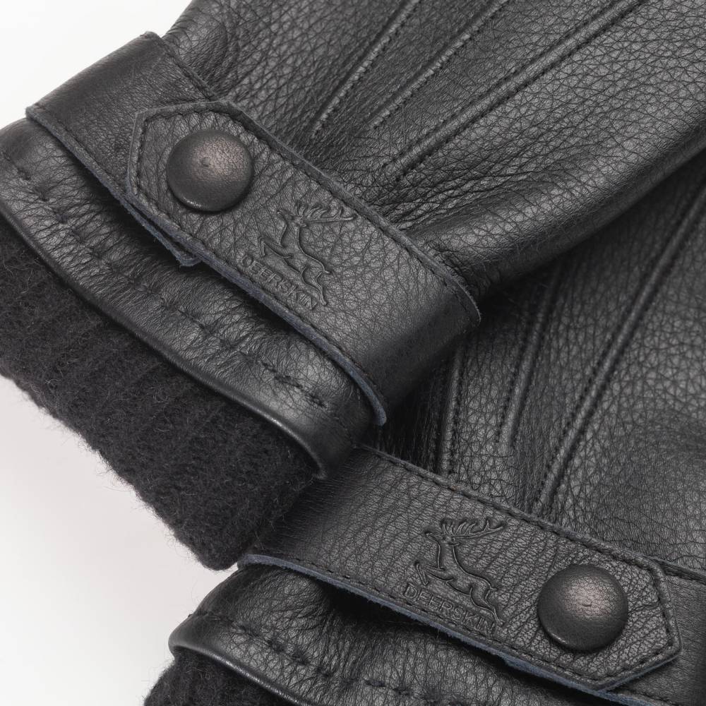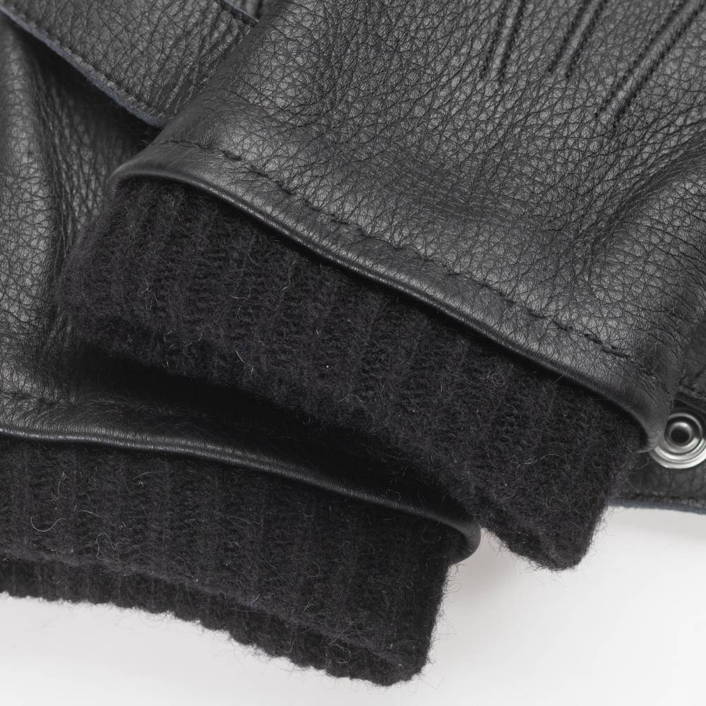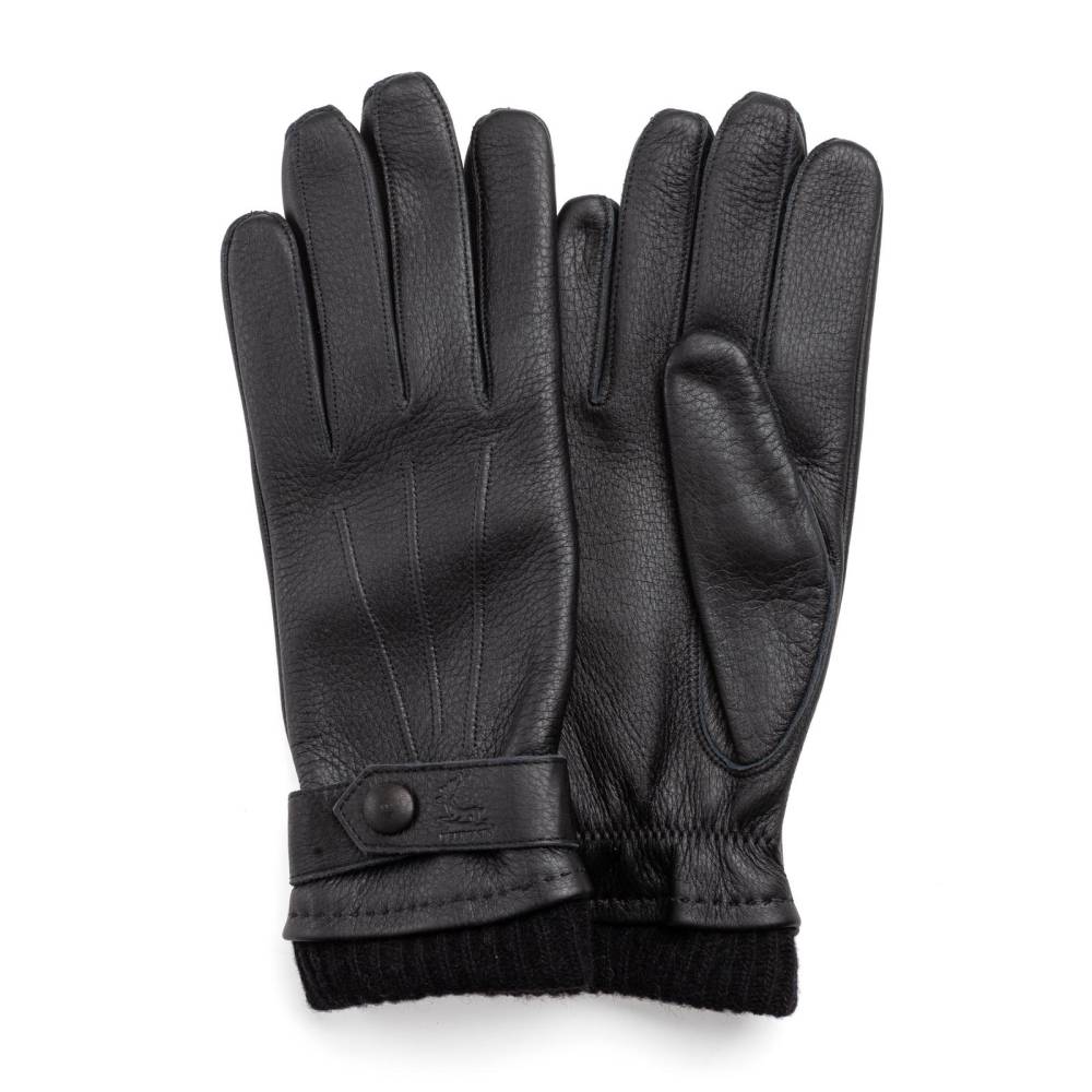 Тёплые мужские перчатки Checkroom чёрного цвета созданы для ежедневного использования при минусовых температурах в городских условиях. С внешней стороны модель выполнена из мягкой приятной на ощупь оленьей кожи с великолепной зернистой фактурой. Область запястья дополнена эластичной вставкой, которая позволяет быстро и легко надевать перчатки. Шерстяная подкладка защищает от проникновения ветра и сохраняет тепло. Модель имеет удлиненный фасон за счет тёплого вязаного манжета. Перчатки подойдут для осенней и зимней погоды с температурой до – 7 °С.