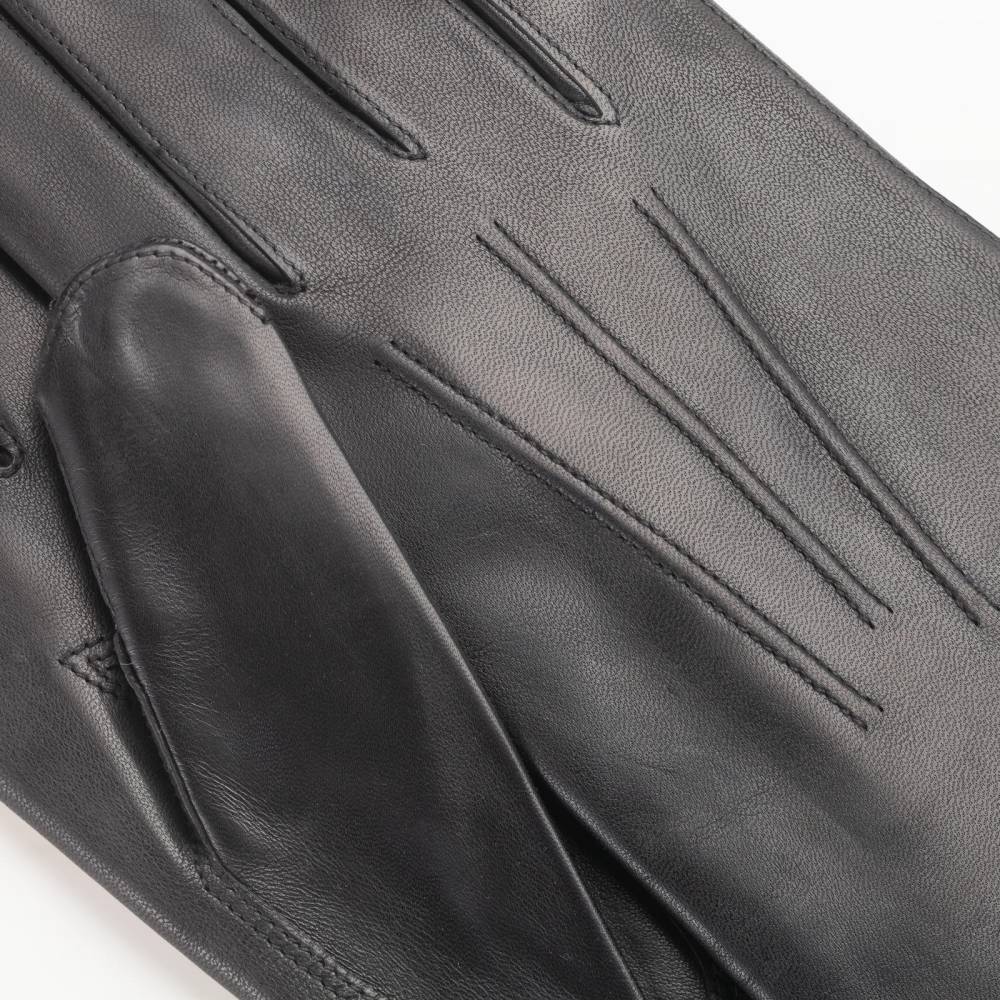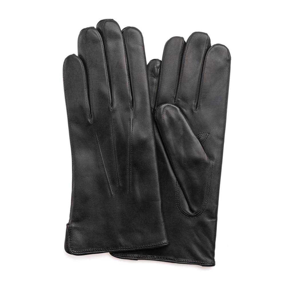 Лаконичные и элегантные мужские перчатки Checkroom чёрного цвета. Модель сшита из высококачественной кожи ягнёнка с лёгким ненавязчивым блеском. Благодаря выдающейся мягкости и эластичности, кожа ягнёнка справедливо считается одним из лучших материалов для производства перчаток. Подкладка выполнена из 100% шерсти. Перчатки выглядят достаточно строго и подойдут под сдержанный классический гардероб в синих и коричневых тонах. Эти перчатки можно носить осенью и зимой при температуре до – 5 °С.