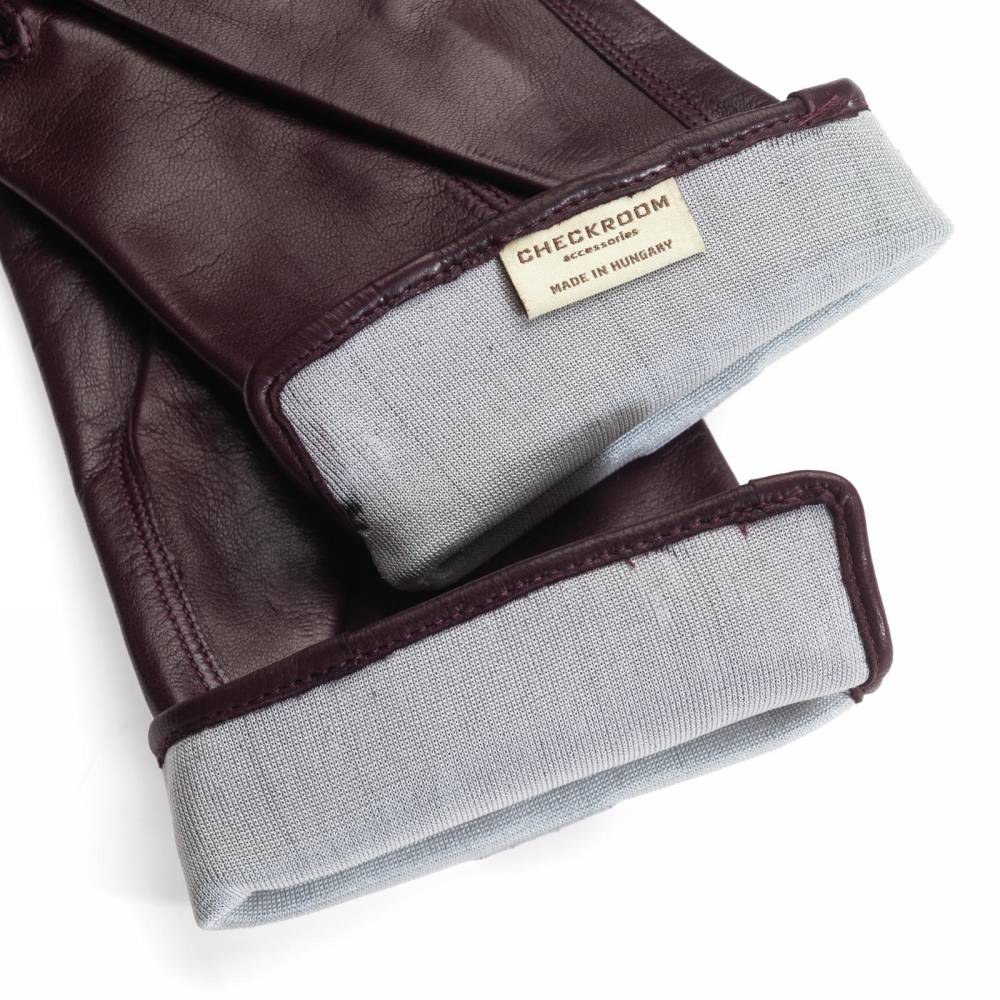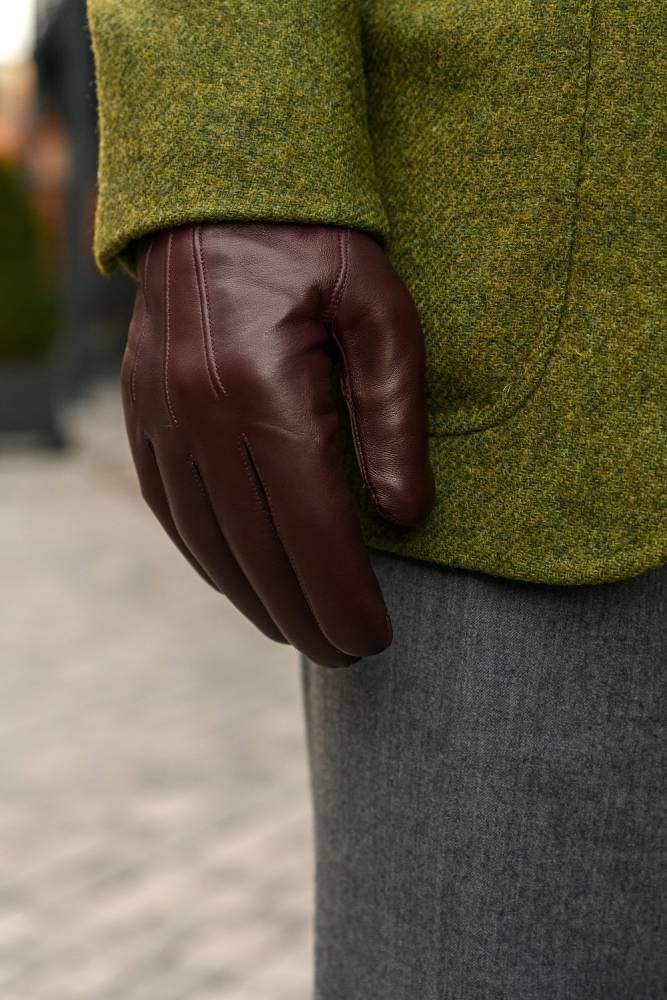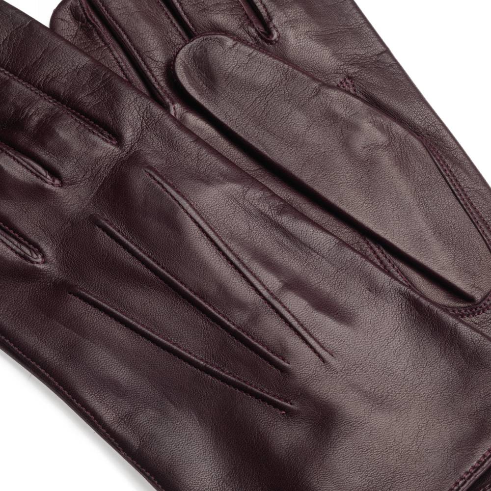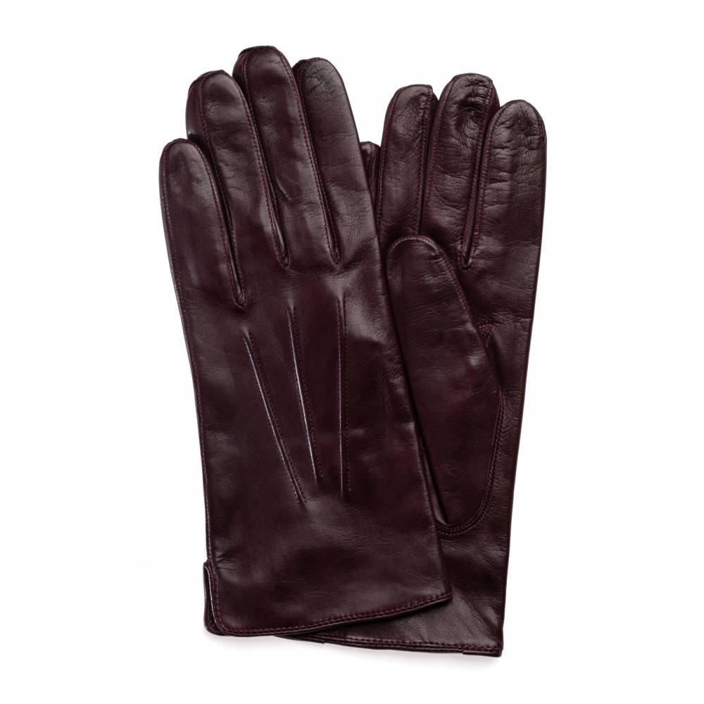 Элегантные классические мужские перчатки насыщенного винного оттенка. Модель сшита из высококачественной кожи ягнёнка с характерным лёгким блеском. Благодаря выдающейся мягкости и эластичности, кожа ягнёнка справедливо считается одним из лучших материалов для производства перчаток. Подкладка выполнена из 100% шёлка. Перчатки выглядят строго и хорошо сочетаются со сдержанным классическим гардеробом в синих, серых и коричневых тонах. Такие перчатки можно носить осенью и зимой при температуре до –5 °С.