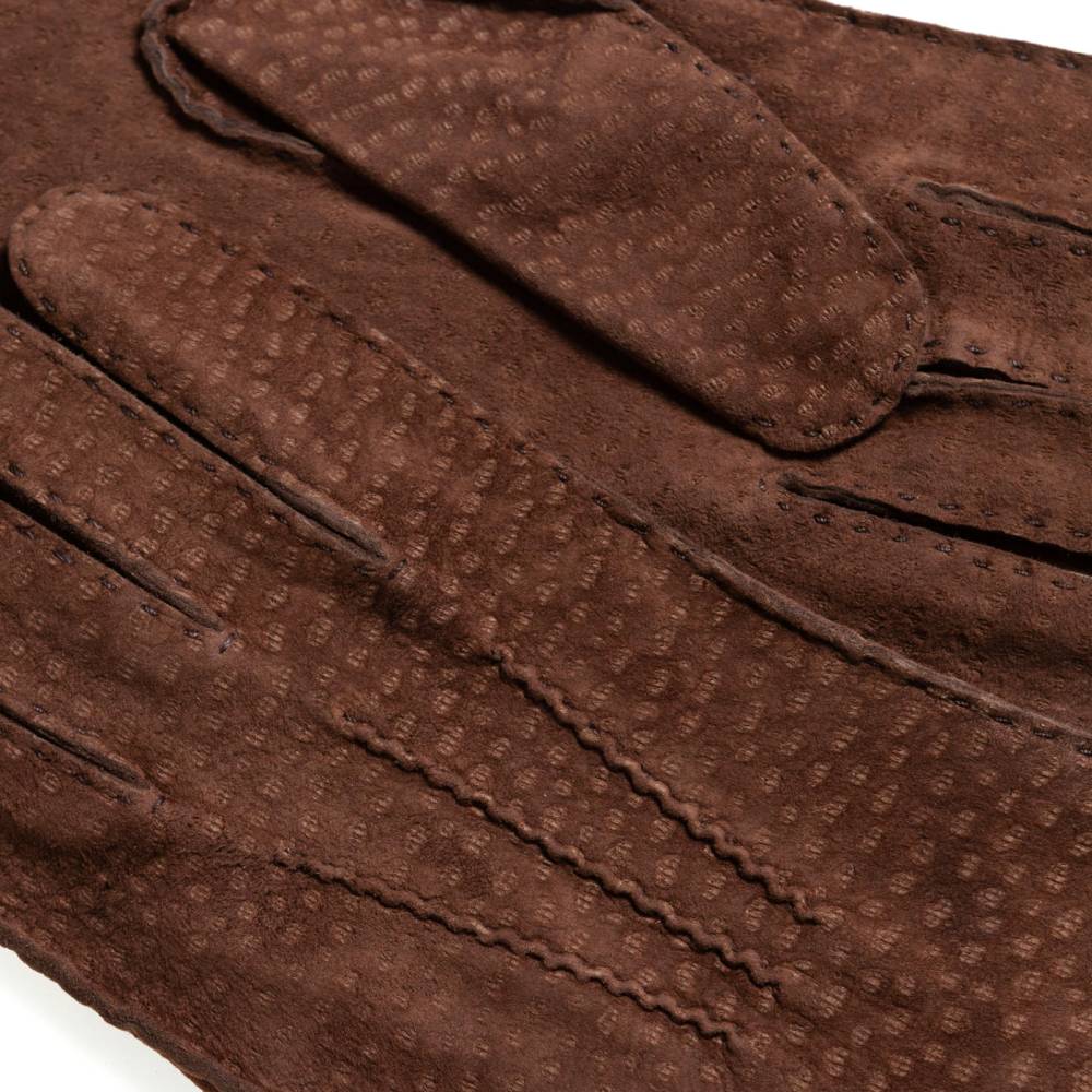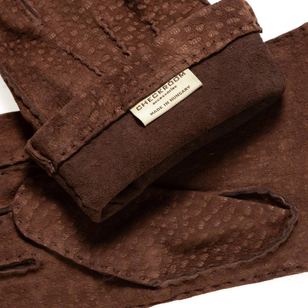 Классические коричневые мужские перчатки без подкладки. Модель изготовлена вручную из одного отрезка кожи капибары (карпинчо) – самого крупного в мире грызуна, обитающего в Южной Америке. Приятная на ощупь, ноская и эластичная кожа капибары по своей структуре напоминает замшу. Такие перчатки можно носить осенью и зимой, когда температура опускается не ниже 0°С.