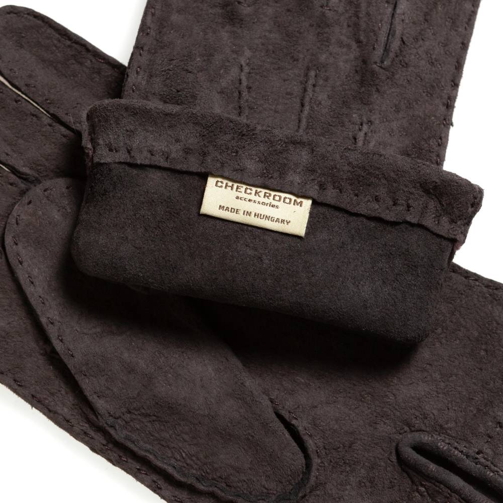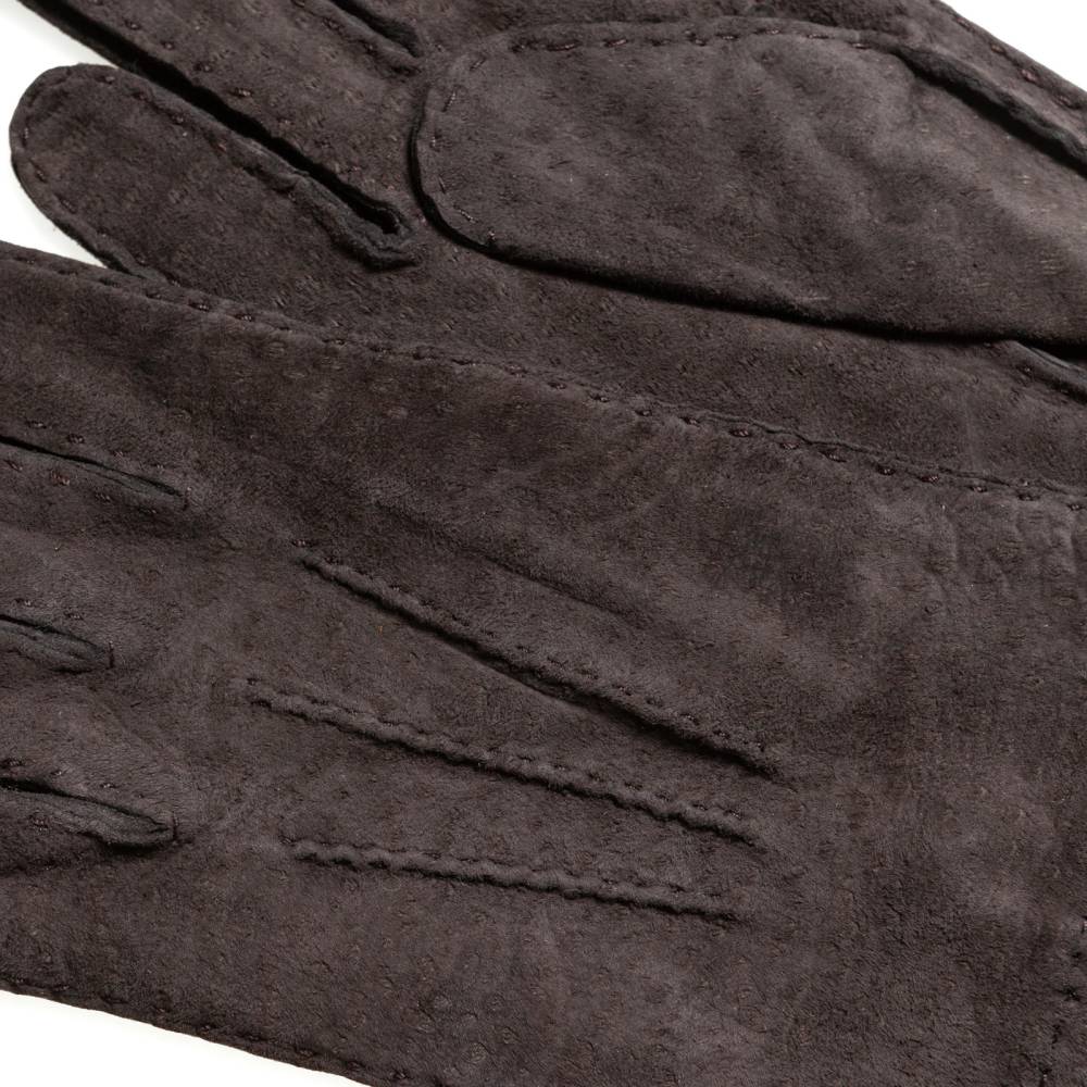 Классические тёмно-коричневые мужские перчатки без подкладки. Модель изготовлена вручную из одного отрезка кожи капибары (карпинчо) – самого крупного в мире грызуна, обитающего в Южной Америке. Приятная на ощупь, ноская и эластичная кожа капибары по своей структуре напоминает замшу. Такие перчатки можно носить осенью и зимой, когда температура опускается не ниже 0°С.