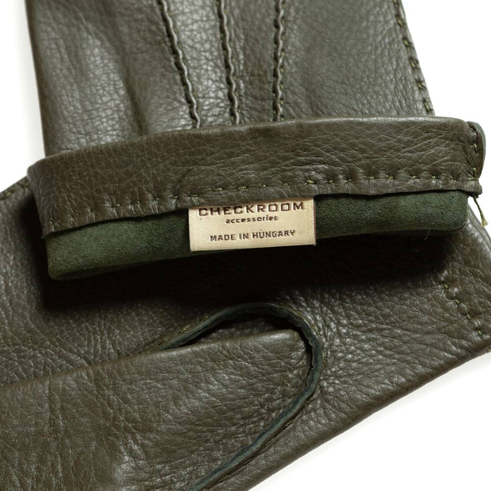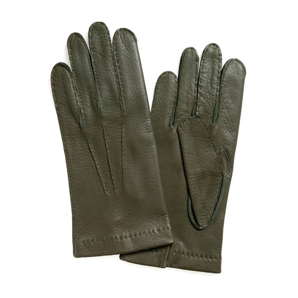 Классические мужские перчатки без подкладки. Модель изготовлена из одного отрезка мягкой и эластичной оленьей кожи благородного тёмно-зелёного цвета. Благодаря тому, что перчатки выкроены и сшиты вручную, они лучше облегают руку и комфортнее сидят. Такие перчатки можно носить осенью и зимой, когда температура опускается не ниже 0°С.