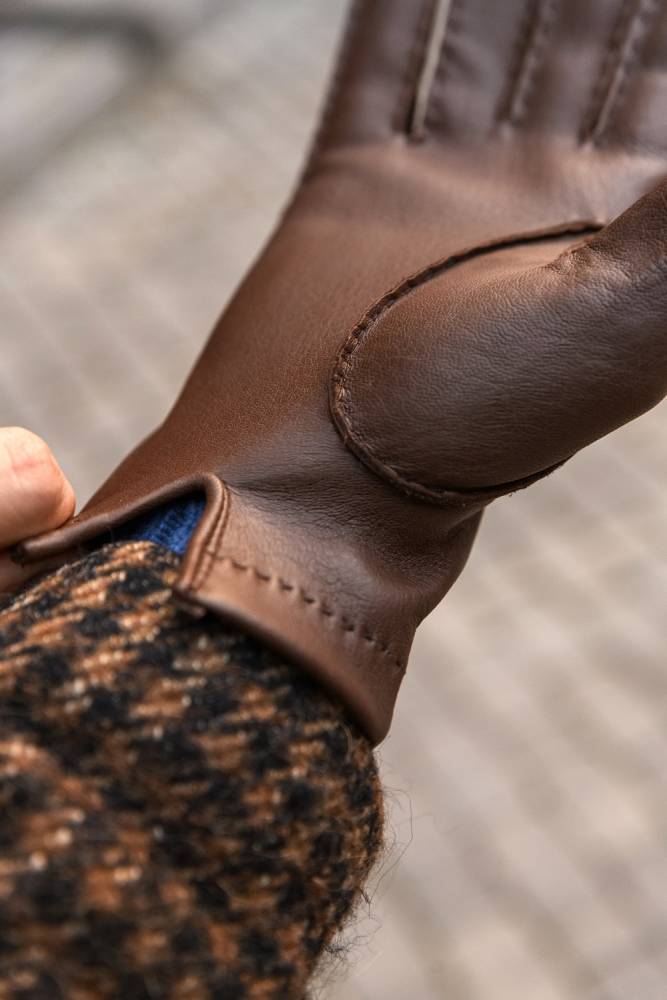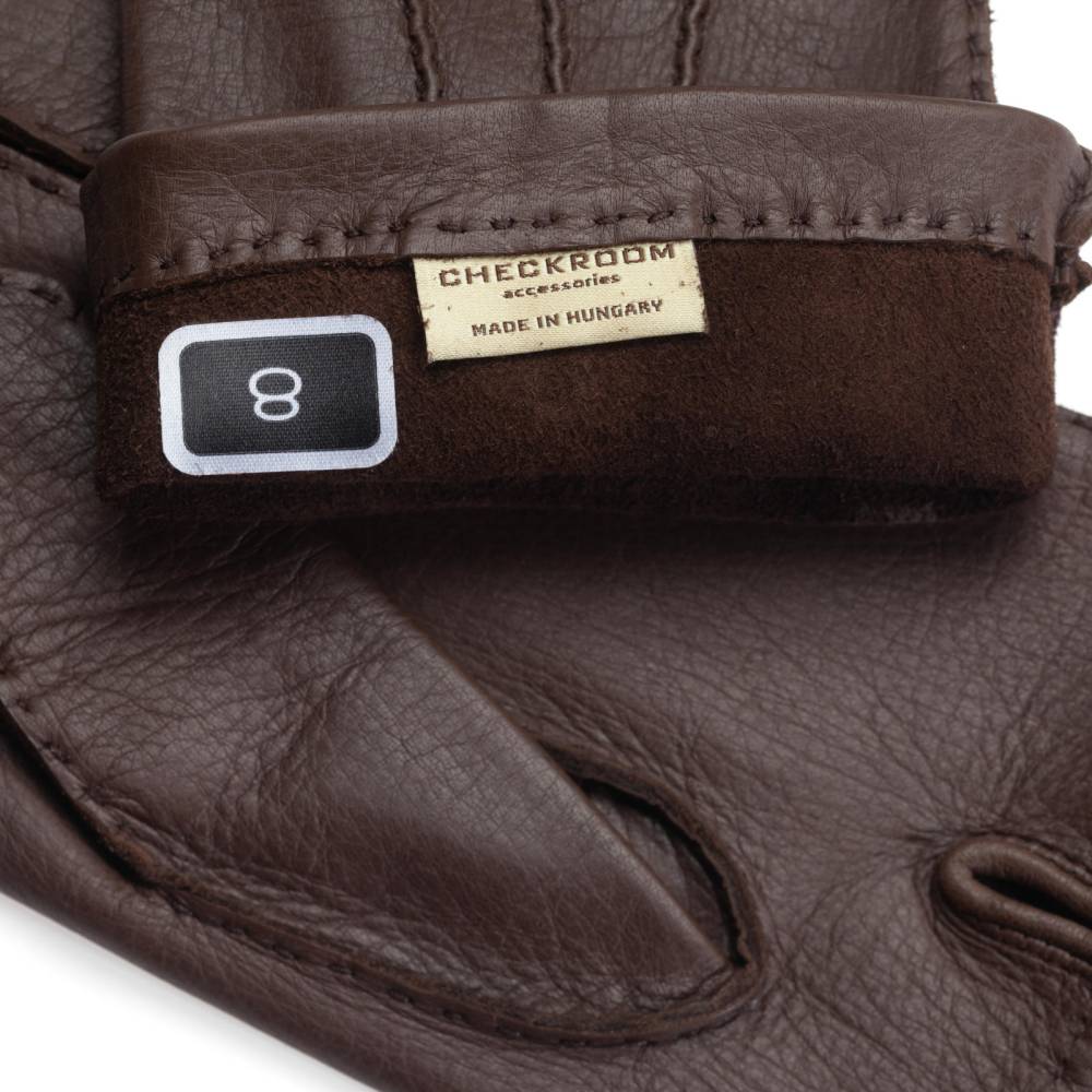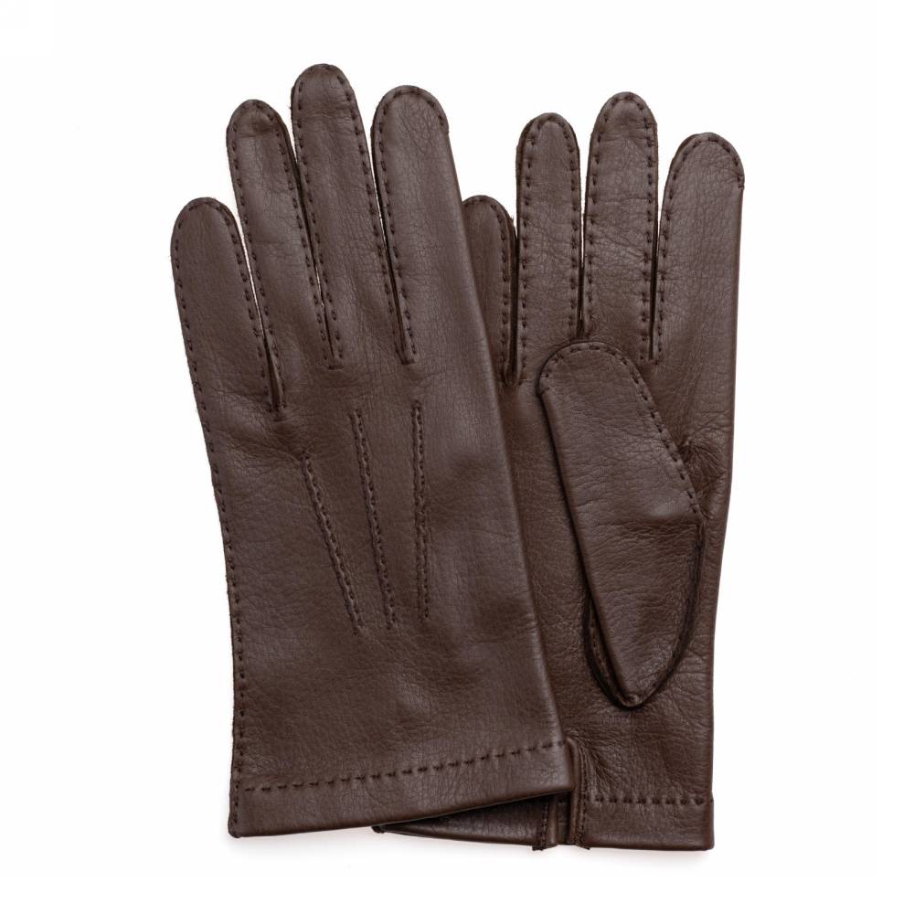 Классические мужские перчатки без подкладки. Модель изготовлена из одного отрезка мягкой и эластичной оленьей кожи коричневого цвета. Благодаря тому, что перчатки выкроены и сшиты вручную, они лучше облегают руку и комфортнее сидят. Такие перчатки можно носить осенью и зимой, когда температура опускается не ниже 0°С.
