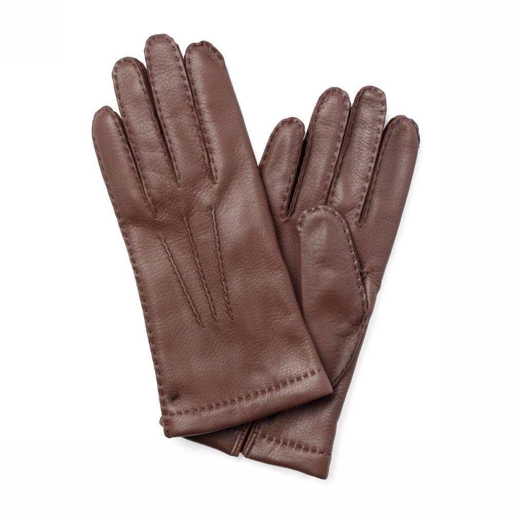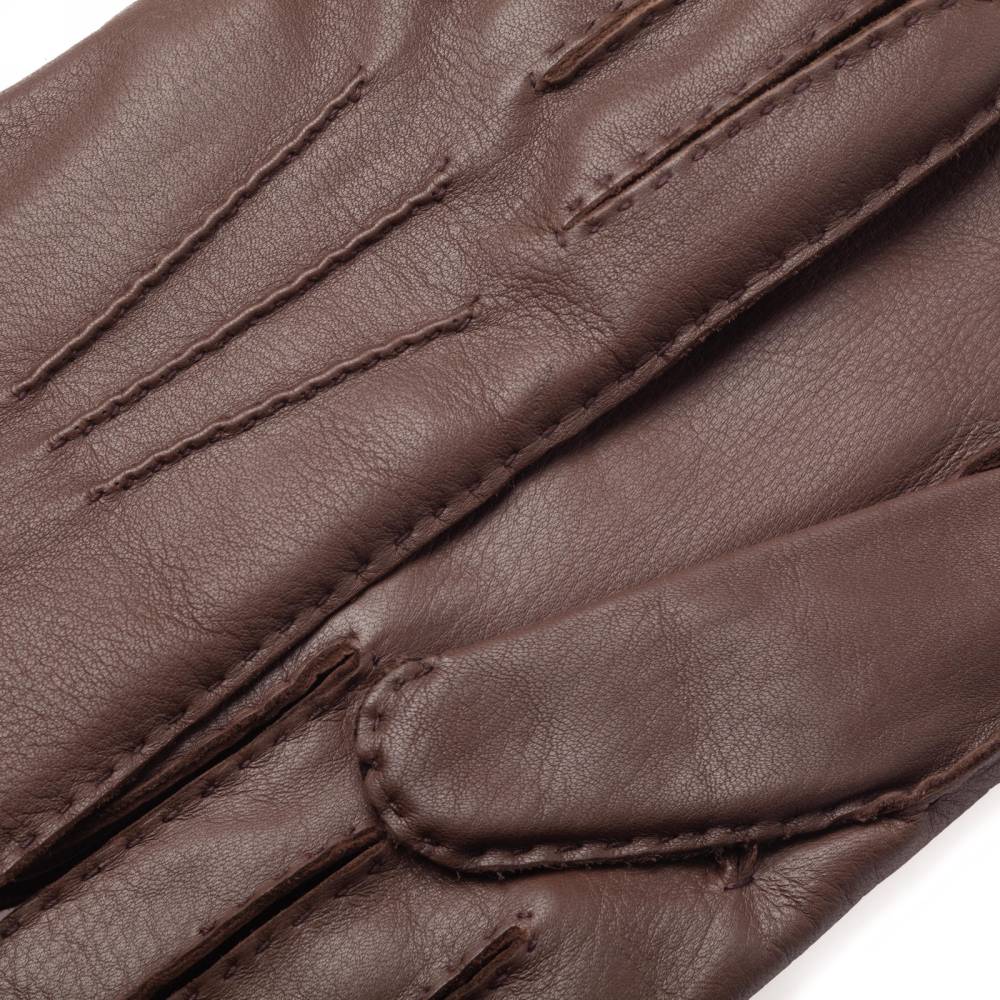 Классические коричневые мужские перчатки традиционного дизайна. Модель изготовлена из одного отрезка мягкой и эластичной оленьей кожи. Благодаря тому, что перчатки выкроены и сшиты вручную, они лучше облегают руку и комфортнее сидят. Подкладка выполнена из чистой шерсти. Такие перчатки можно носить осенью и зимой, когда температура опускается не ниже - 5 °С.