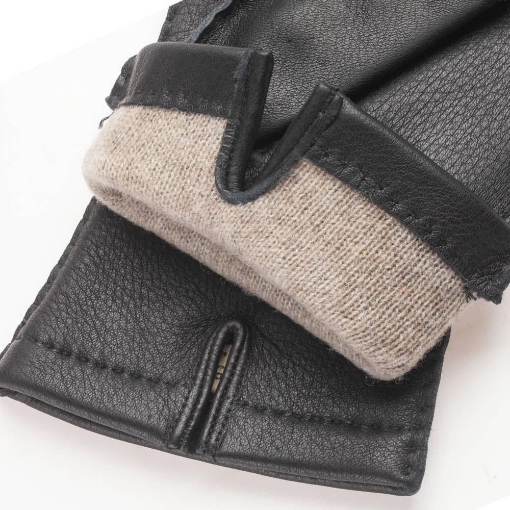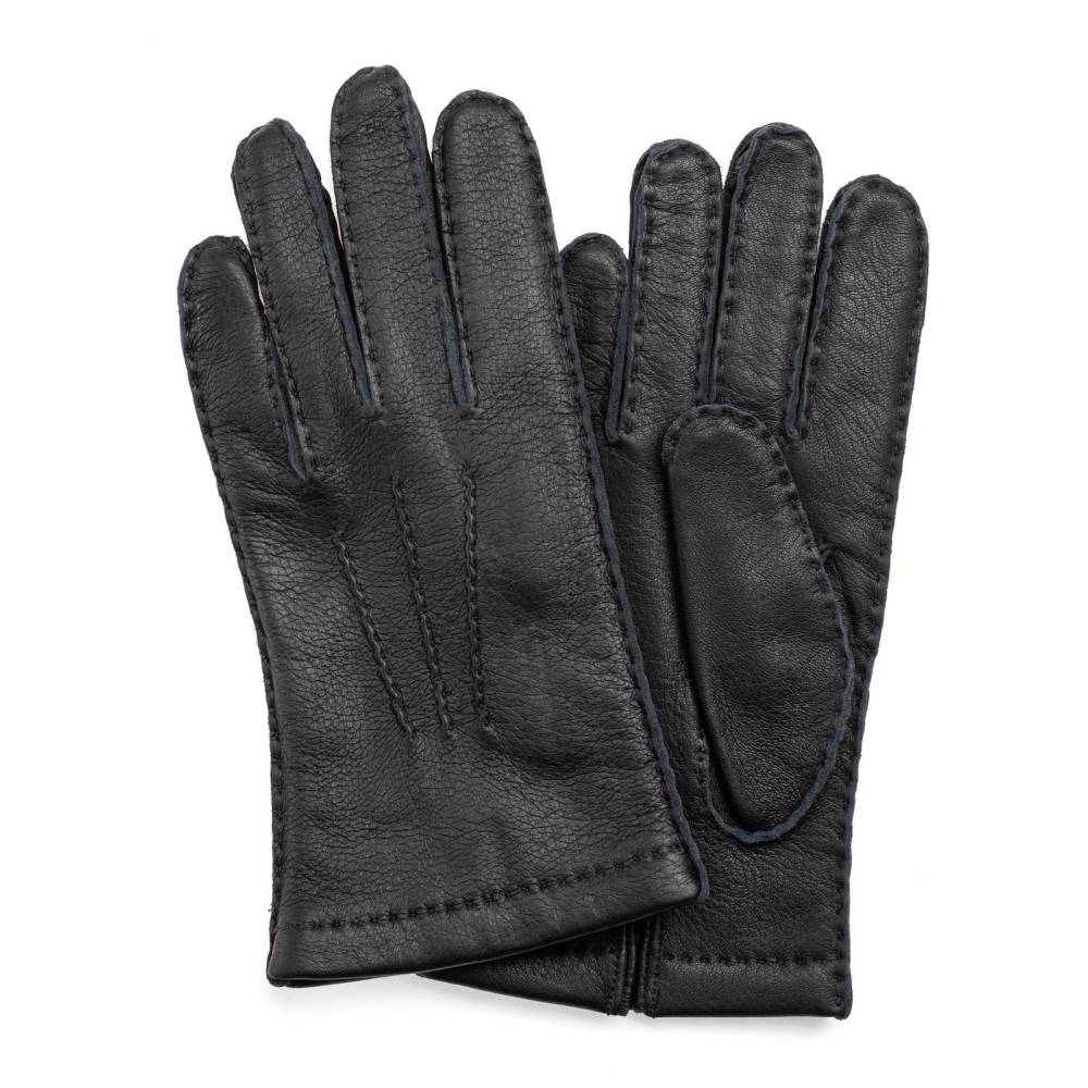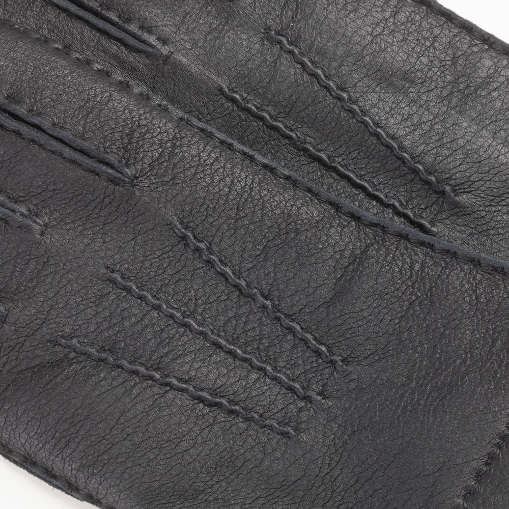 Классические чёрные мужские перчатки Checkroom традиционного дизайна. Модель изготовлена из мягкой и эластичной оленьей кожи с характерной зернистой фактурой. Подкладка выполнена из чистой шерсти. Такие перчатки можно носить осенью и зимой, когда температура опускается не ниже - 5 °С.