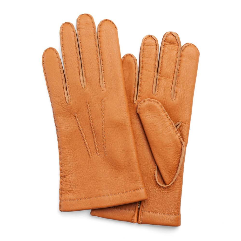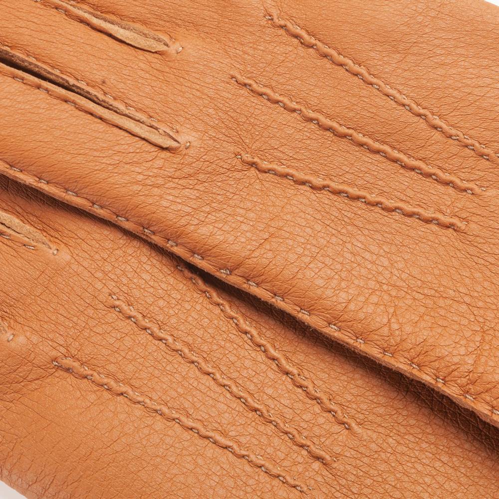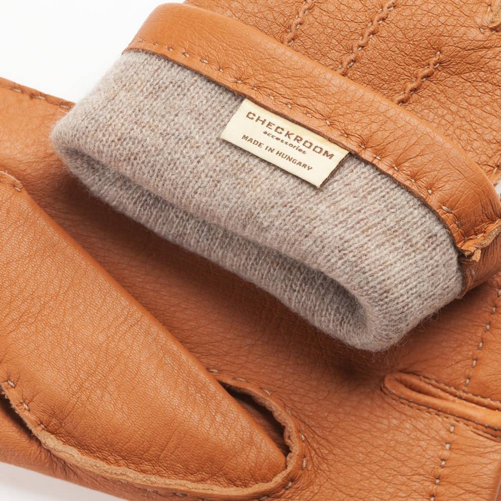 Классические светло-коричневые мужские перчатки Checkroom традиционного дизайна. Модель изготовлена из мягкой и эластичной оленьей кожи с характерной зернистой фактурой. Подкладка выполнена из чистой шерсти. Такие перчатки можно носить осенью и зимой, когда температура опускается не ниже - 5 °С.