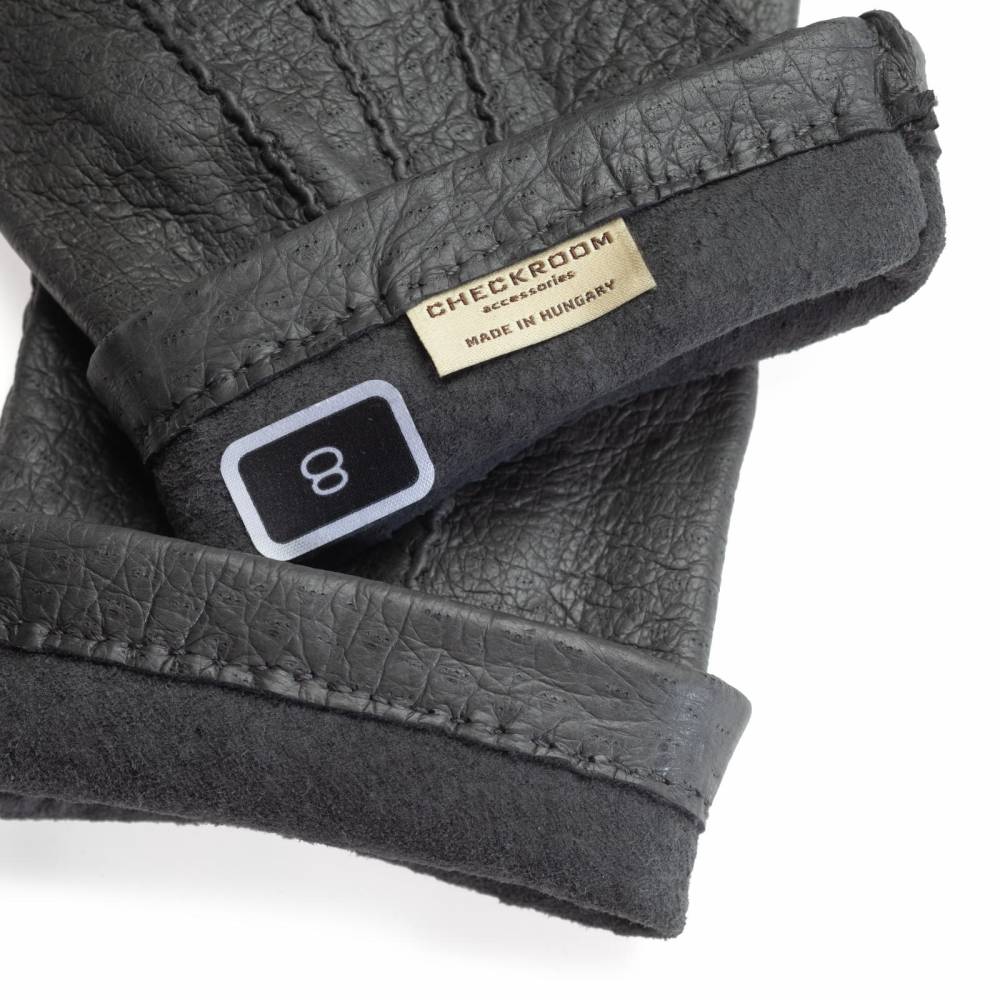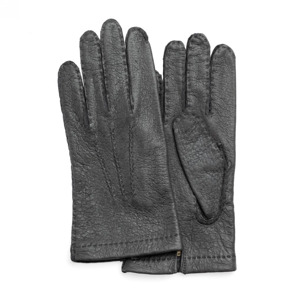 Тонкие элегантные мужские перчатки Checkroom серого цвета. Модель изготовлена из одного отрезка кожи пекари – дикого кабана, обитающего в джунглях Амазонки. Редкая и эксклюзивная кожа пекари обладает прекрасными изоляционными свойствами и характерным рисунком. Она не требует особого ухода и со временем, наоборот, становится только мягче и эластичнее, приобретая благородную патину. Так как перчатки не имеют подкладки, они лучше всего подходят для ранней осени и весны, когда температура не ниже нуля.