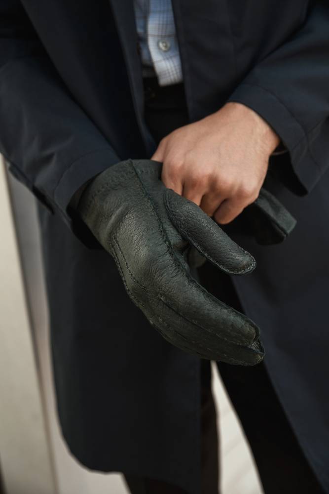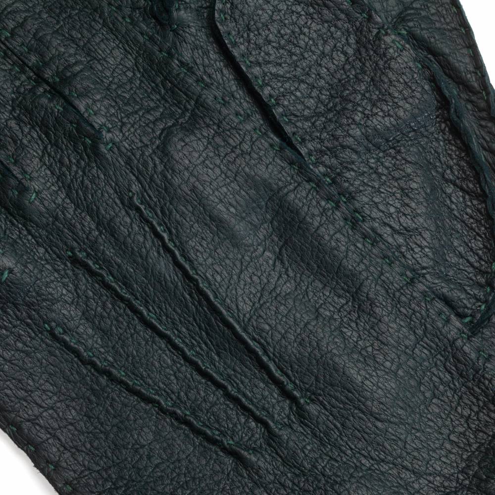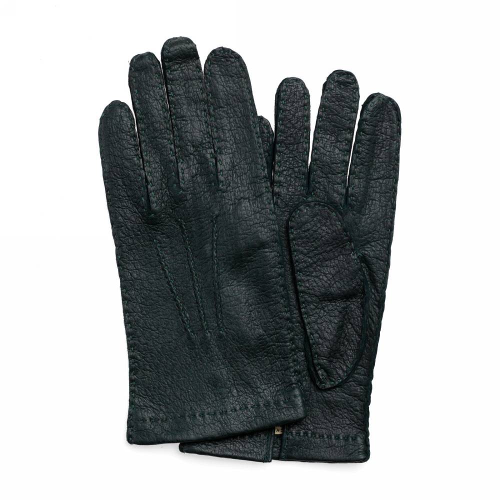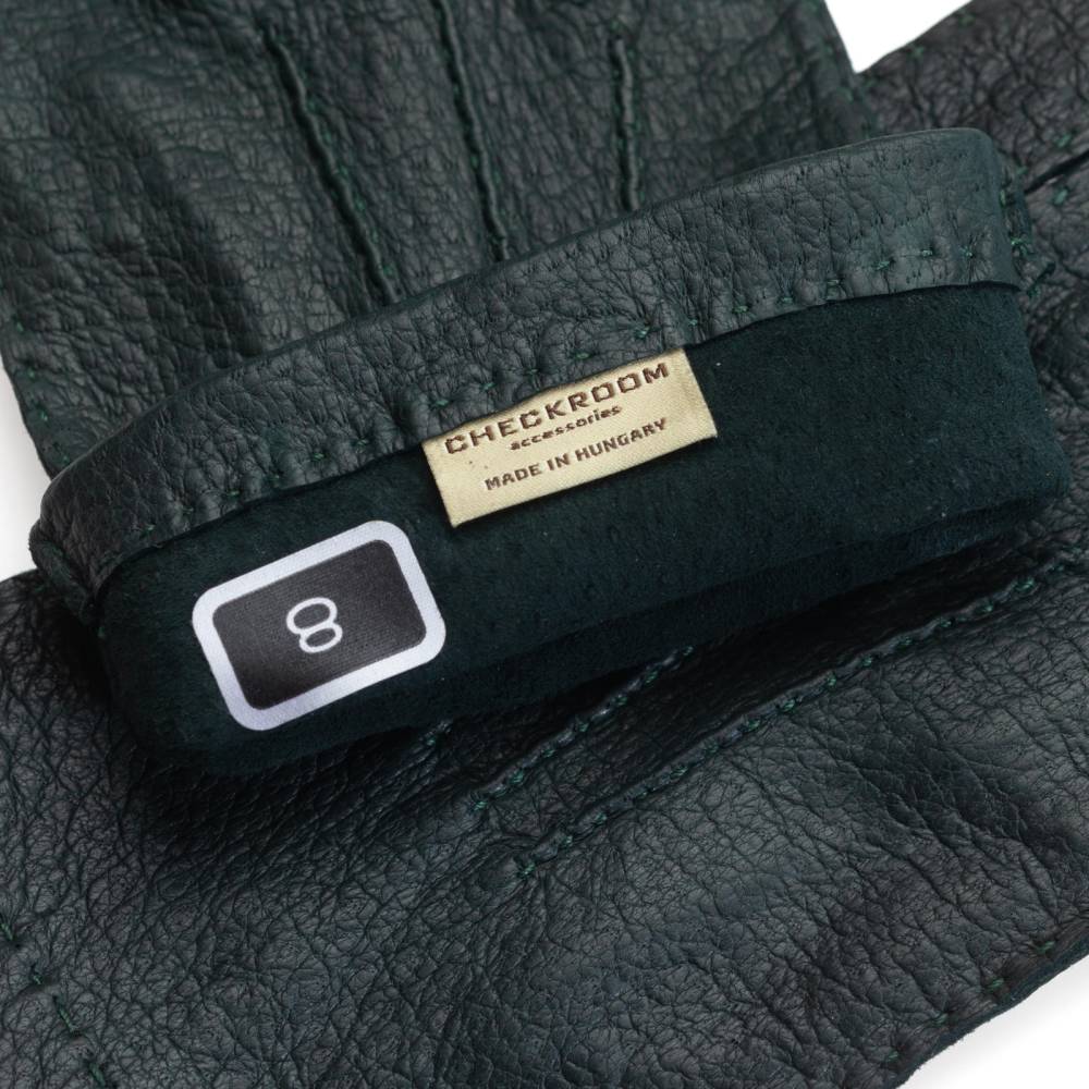 Тонкие элегантные мужские перчатки Checkroom тёмно-зелёного цвета сшиты вручную из одного отрезка кожи пекари – дикого кабана, обитающего в джунглях Амазонки. Редкая и эксклюзивная кожа пекари обладает прекрасными изоляционными свойствами и характерным рисунком. Она не требует особого ухода и со временем, наоборот, становится только мягче и эластичнее, приобретая благородную патину. Так как перчатки не имеют подкладки, они лучше всего подходят для ранней осени и весны, когда температура не ниже нуля.