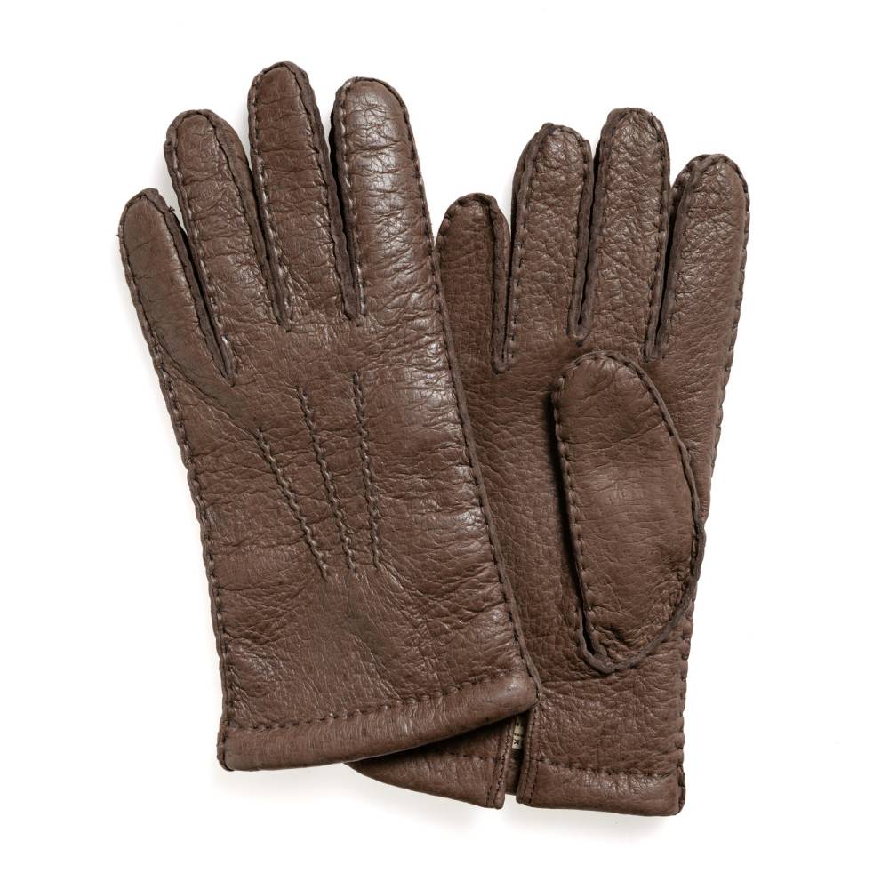 Лаконичные мужские перчатки тёмно-коричневого цвета (цвет: Tabac) сшиты вручную из одного отрезка кожи пекари – кабана, обитающего в джунглях Амазонки. Кожа пекари редкий и дорогостоящий материал, который отличается характерной фактурой и рисунком, а со временем приобретает благородную патину. Такая кожа не требует особого ухода и с годами становится мягче и эластичнее. Подкладка выполнена из 100% кашемира. С внешней стороны модель украшена традиционным вышитым трезубцем. Перчатки можно носить, когда температура опускается не ниже -15 °С.