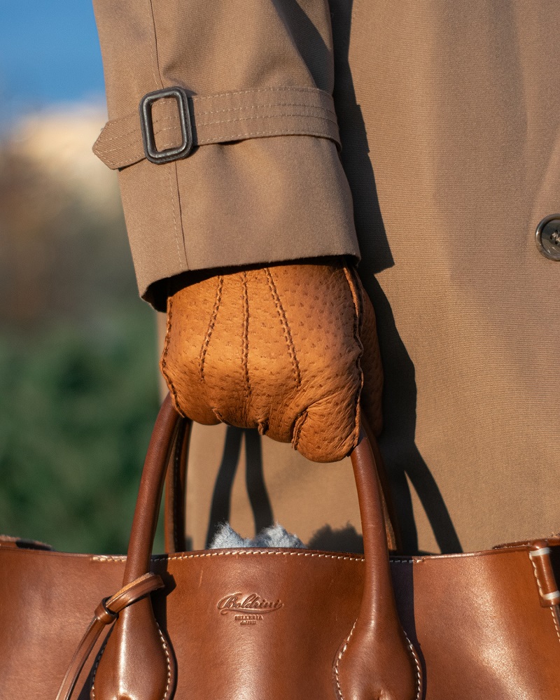 Лаконичные светло-коричневые (цвет: Cork) мужские перчатки Checkroom сшиты вручную из одного отрезка кожи пекари – кабана, обитающего в джунглях Амазонки. Кожа пекари редкий и дорогостоящий материал, который отличается характерной фактурой и рисунком, а со временем приобретает благородную патину. Такая кожа не требует особого ухода и с годами становится мягче и эластичнее. Подкладка выполнена из 100% кашемира. С внешней стороны модель украшена традиционным вышитым трезубцем. Перчатки можно носить, когда температура опускается не ниже -15 °С.