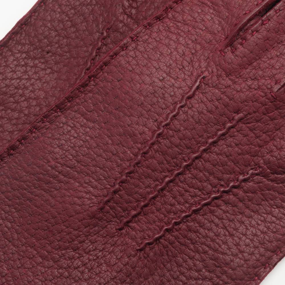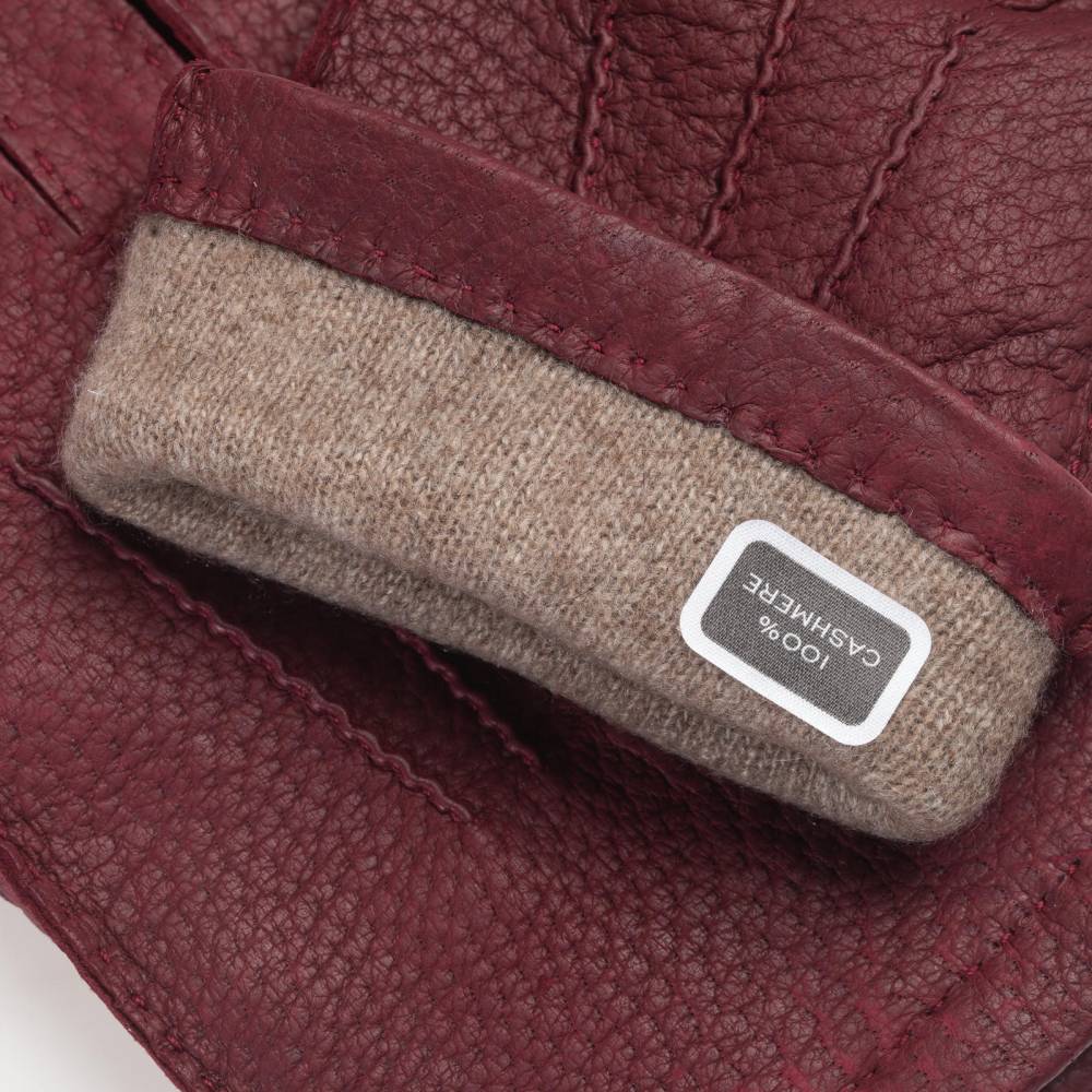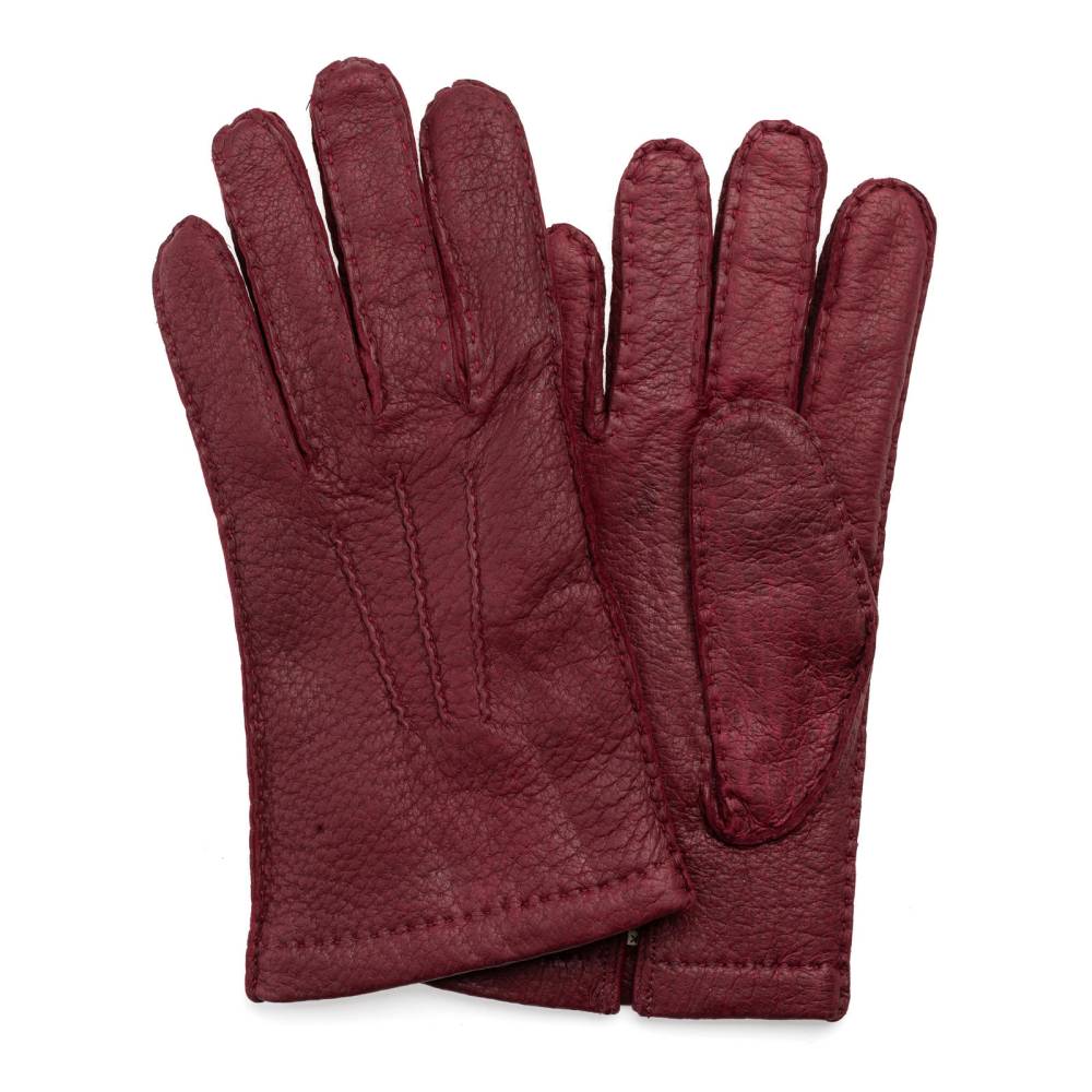 Эффектные бордовые мужские перчатки Checkroom сшиты вручную из одного отрезка кожи пекари – кабана, обитающего в джунглях Амазонки. Кожа пекари редкий и дорогостоящий материал, который отличается характерной фактурой и рисунком, а со временем приобретает благородную патину. Такая кожа не требует особого ухода и с годами становится мягче и эластичнее. Подкладка выполнена из 100% кашемира. С внешней стороны модель украшена традиционным вышитым трезубцем. Перчатки можно носить, когда температура опускается не ниже -15 °С.