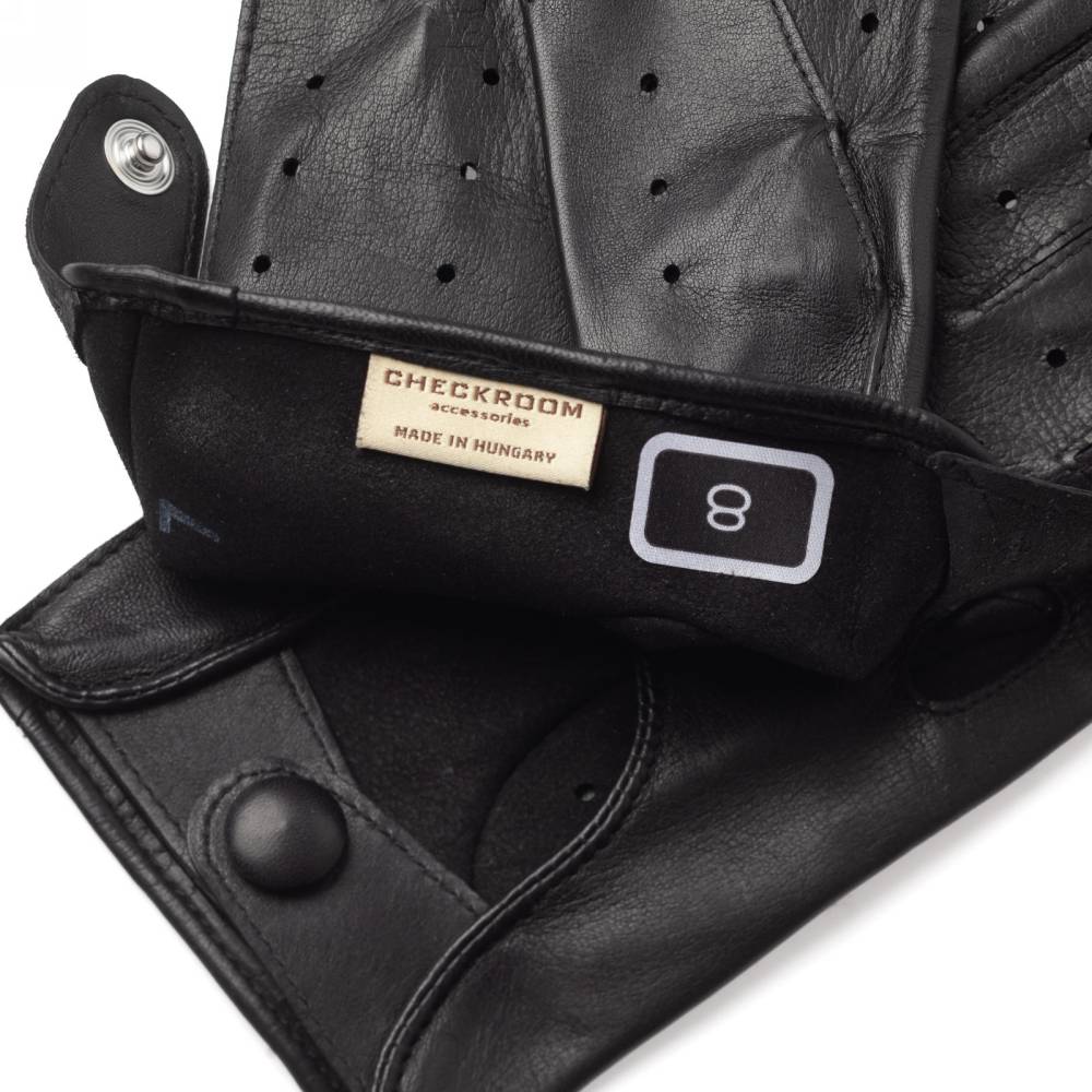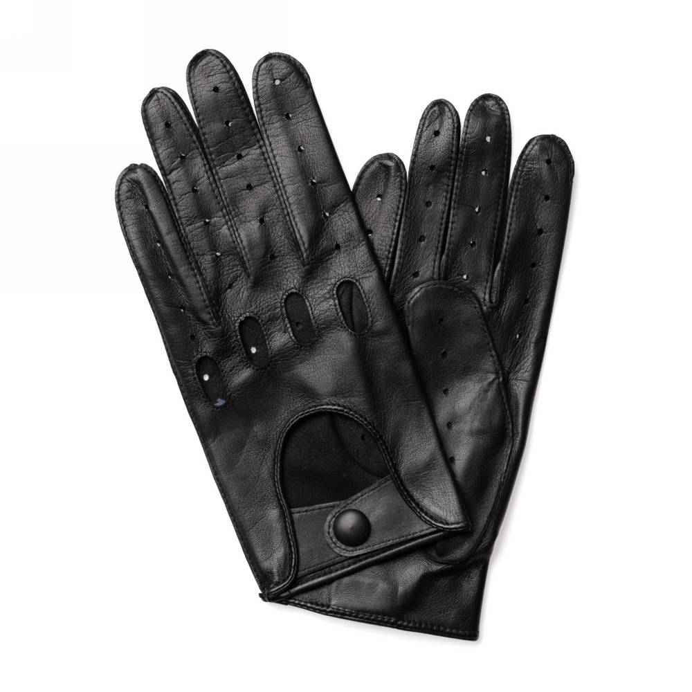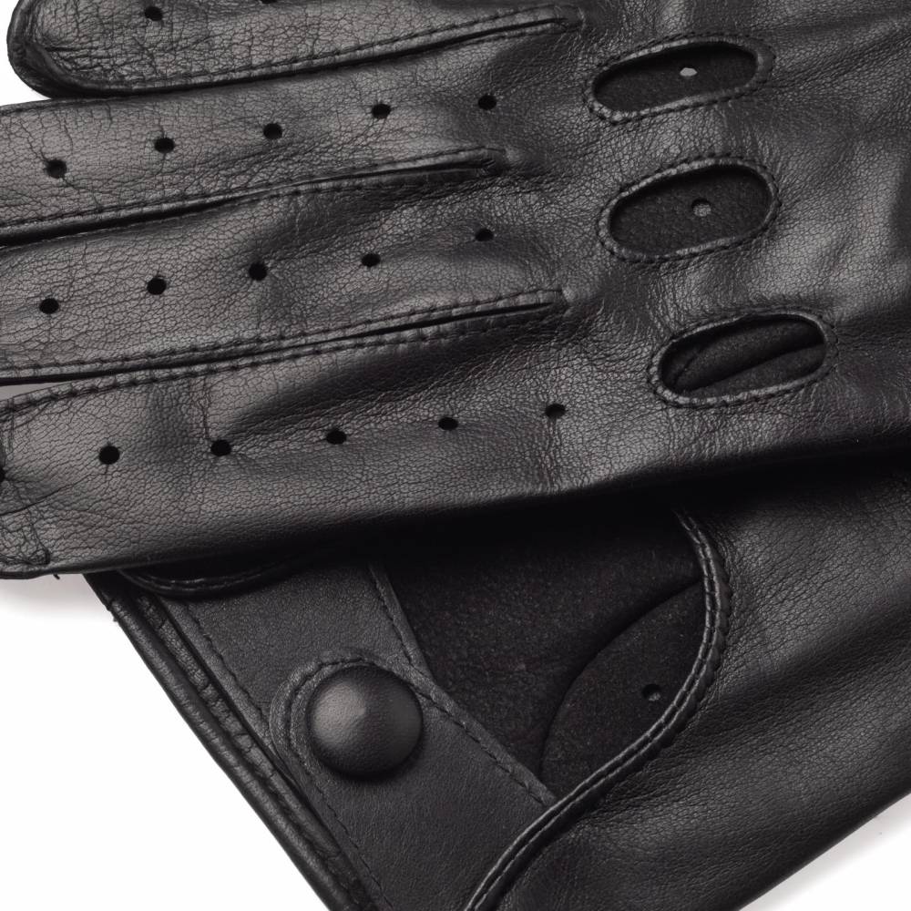 Эффектные чёрные мужские перчатки для вождения автомобиля сшиты из качественной кожи ягнёнка. Благодаря выдающейся мягкости и эластичности, этот материал по достоинству считается одним из лучших видов кожи для производства перчаток. Ремешок на кнопке позволяет легко снимать и надевать перчатки, а также фиксировать их в области запястья. Поскольку модель без подкладки, она подойдёт для тёплой погоды. Помимо использования в автомобиле, её можно носить и в повседневной жизни как дополнение к стильному образу. Такие перчатки хорошо сочетаются с не очень строгой классической одеждой.