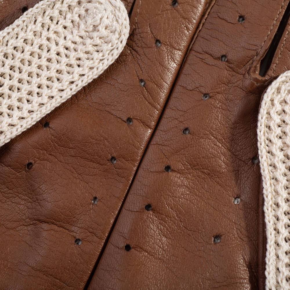Эффектные мужские перчатки для вождения автомобиля сшиты из качественной кожи ягнёнка коричневого цвета и светло-бежевой хлопковой пряжи, за счёт чего перчатки хорошо садятся по руке. Ремешок на кнопке позволяет легко снимать и надевать перчатки, а также фиксировать их в области запястья. Поскольку модель без подкладки, она подойдёт для тёплой погоды. Помимо использования в автомобиле, её можно носить и в повседневной жизни как дополнение к стильному образу.