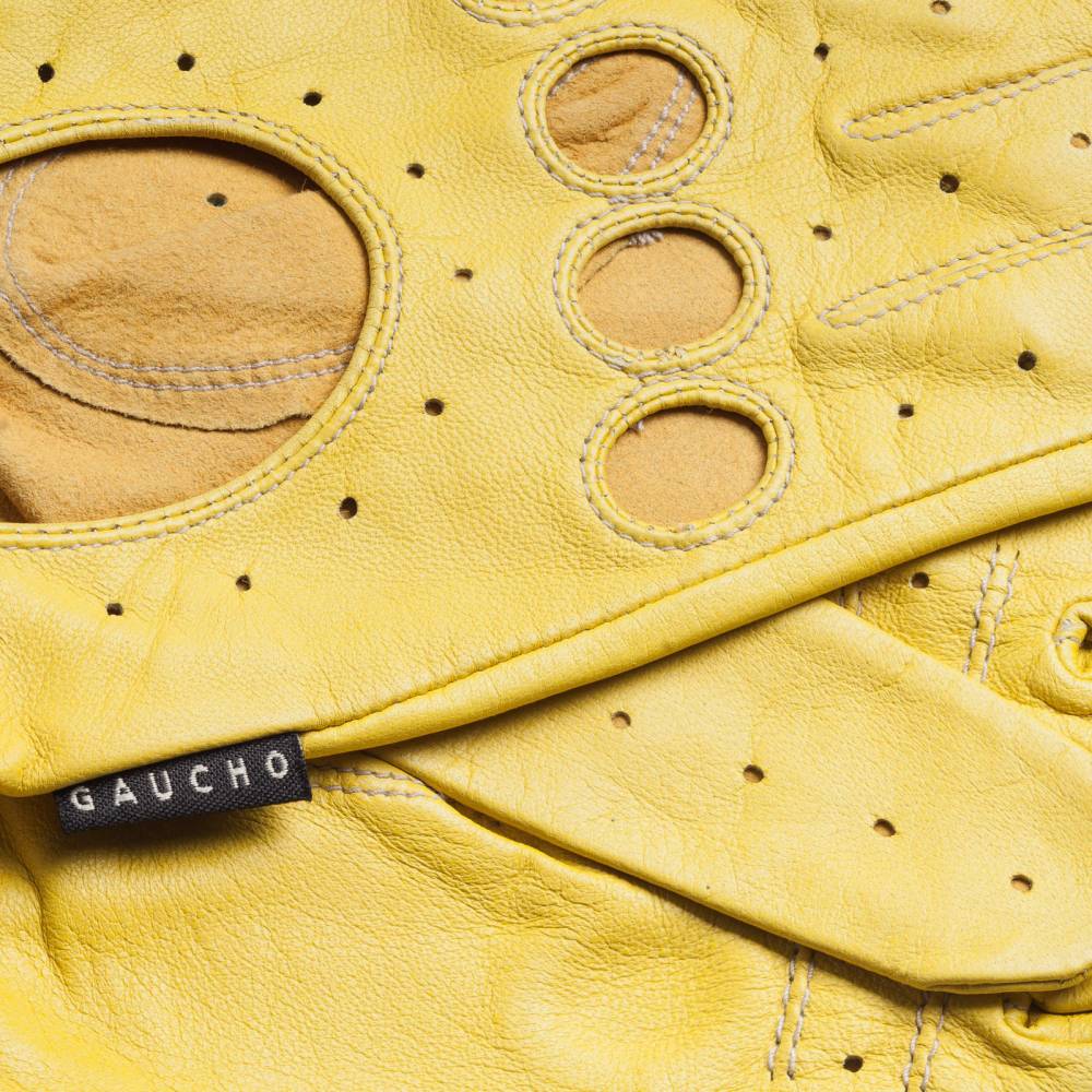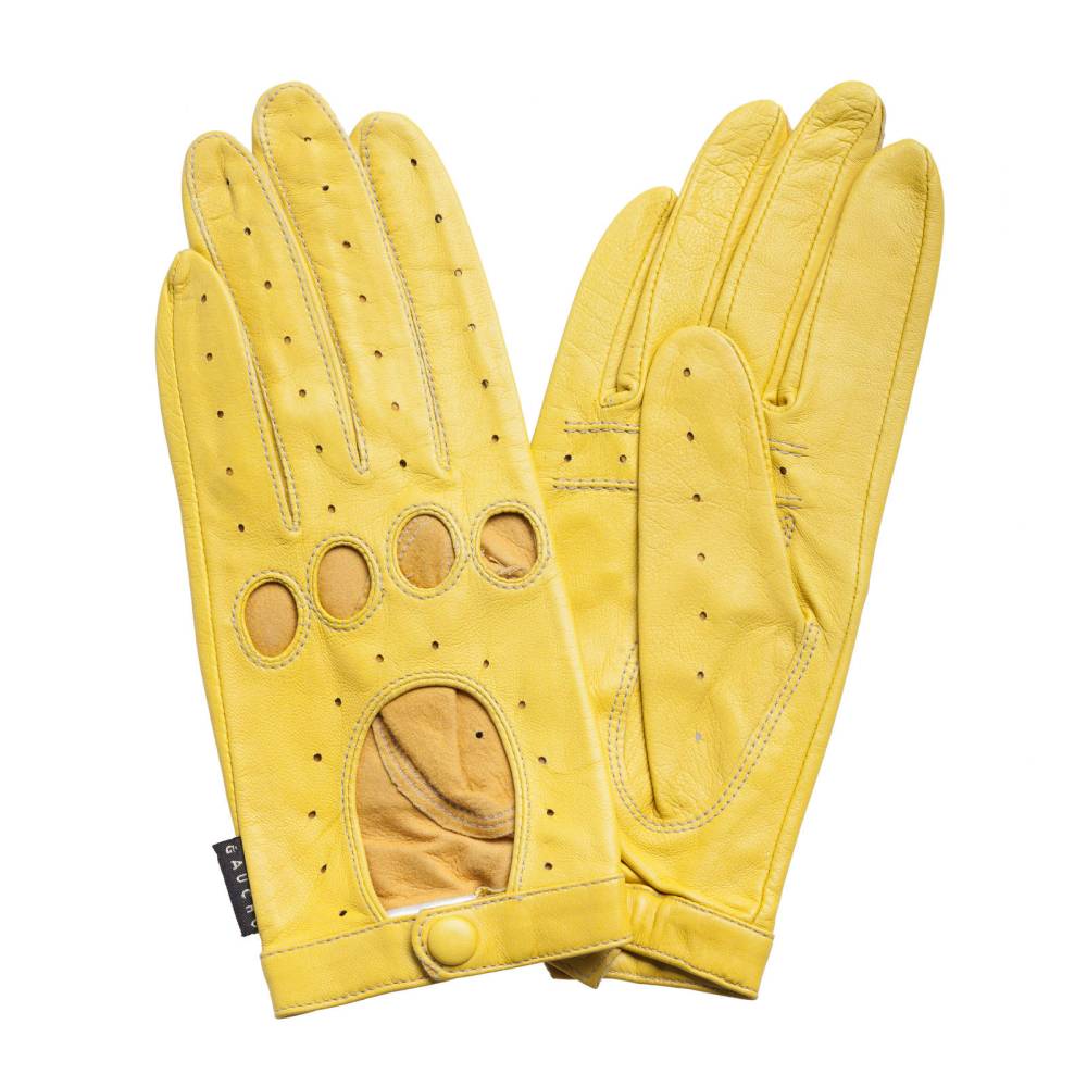 Эффектные женские перчатки GAUCHO для вождения автомобиля выполнены из качественной кожи ягнёнка желтого цвета. Мягкая кожа с перфорацией обеспечивает рукам комфорт и прочное сцепление с рулём. Ремешок на кнопке позволяет легко снимать и надевать перчатки. Подходят для тёплых весенних и осенних дней.