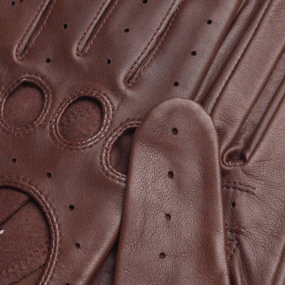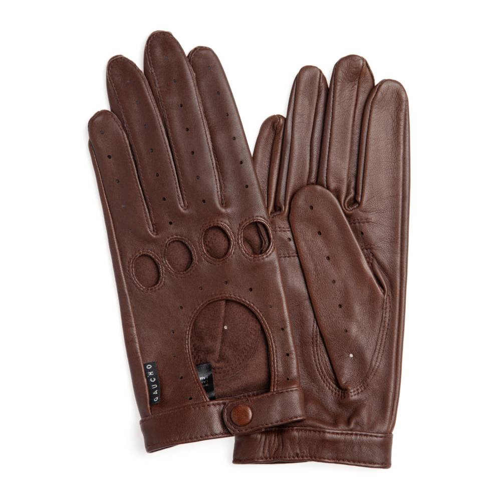 Эффектные женские перчатки GAUCHO для вождения автомобиля выполнены из качественной кожи ягнёнка шоколадного цвета. Мягкая кожа с перфорацией обеспечивает рукам комфорт и прочное сцепление с рулём. Ремешок на кнопке позволяет легко снимать и надевать перчатки. Подходят для тёплых весенних и осенних дней.