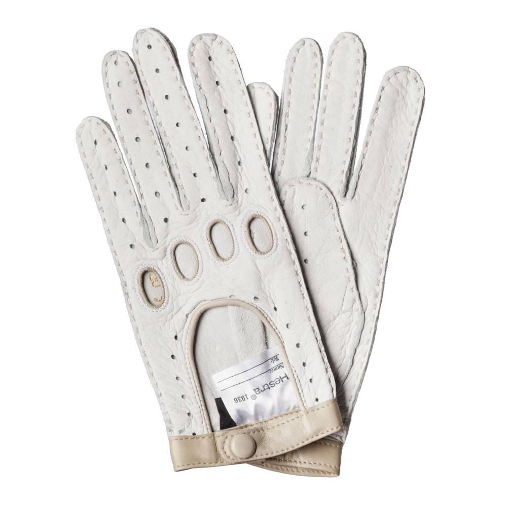 Женские перчатки Hestra из кожи пекари белого цвета с бежевым ремешком на кнопке. Мягкий, эластичный материал комфортно облегает кисть, но не стесняет движения пальцев. Перфорация на внешней стороне позволяет коже дышать. Перчатки идеально подходят для вождения автомобиля и прогулок в тёплые весенние дни.