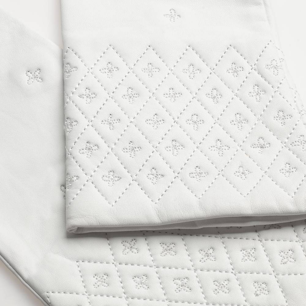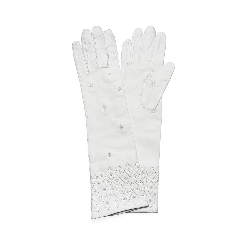 Изящные и элегантные длинные женские перчатки шведской марки Hestra. Модель сшита из нежной, но прочной ягнячьей кожи белого цвета, а тонкая и приятная на ощупь подкладка выполнена из чистого шёлка. Перчатки украшены вышитыми цветами. Эта модель отлично подойдет для прохладных осенних дней и будет отлично сочетаться с пальто с рукавами «три четверти».