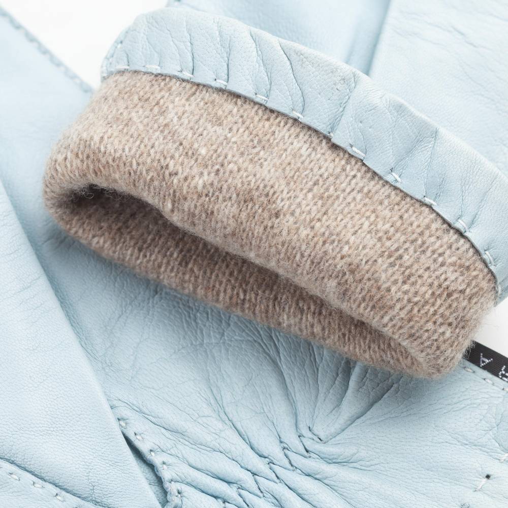 Элегантные женские перчатки от бренда Gaucho станут изысканным акцентом в вашем гардеробе. Модель выполнена из высококачественной кожи ягненка голубого оттенка, которая отличается исключительной мягкостью, эластичностью и деликатным природным блеском. Особую ценность изделию придают наружные швы, прошитые вручную контрастной нитью. Эта трудоемкая ручная работа не только подчеркивает статус аксессуара, но и обеспечивает комфортную посадку, не ограничивающую движения пальцев. Внутри предусмотрена мягкая и теплая подкладка из натуральной шерсти, которая приятно прилегает к коже и обеспечивает оптимальный микроклимат в прохладные осенние и зимние дни.