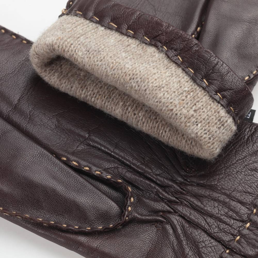 Элегантные женские перчатки от бренда Gaucho станут изысканным акцентом в вашем гардеробе. Модель выполнена из высококачественной кожи ягненка тёмно-коричневого оттенка, которая отличается исключительной мягкостью, эластичностью и деликатным природным блеском. Особую ценность изделию придают наружные швы, прошитые вручную контрастной нитью. Эта трудоемкая ручная работа не только подчеркивает статус аксессуара, но и обеспечивает комфортную посадку, не ограничивающую движения пальцев. Внутри предусмотрена мягкая и теплая подкладка из натуральной шерсти, которая приятно прилегает к коже и обеспечивает оптимальный микроклимат в прохладные осенние и зимние дни.