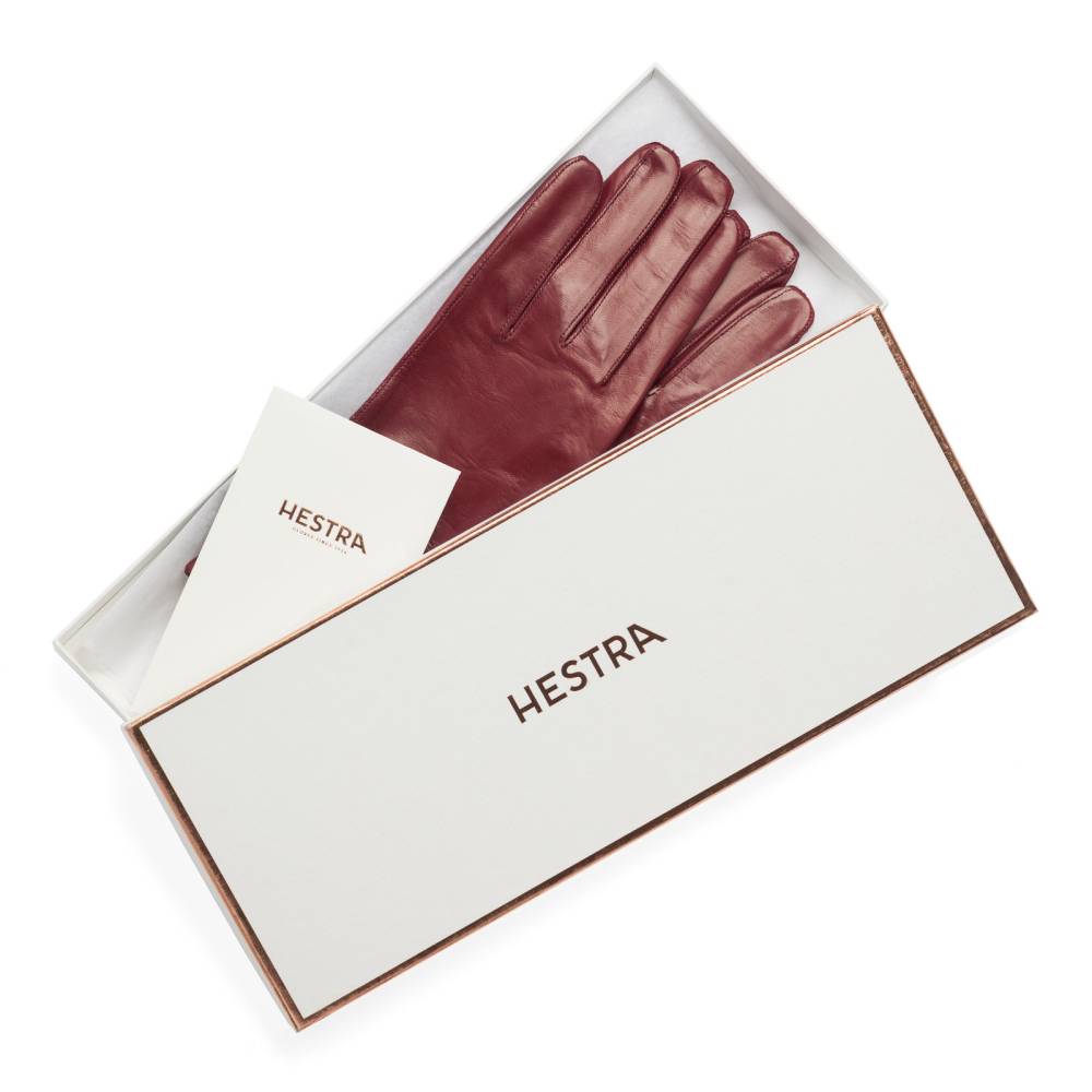 Классические женские перчатки Hestra тёмно-красного цвета. Обе перчатки имеют одинаковую текстуру, так как выполнены из одного отрезка уникальной овечьей кожи hairsheep, поставляемой из Эфиопии. Такая кожа отличается мягкостью, тонкой структурой и благородным блеском. К тому же она прочна и эластина, что обеспечивает прекрасную посадку по форме руки. Подкладка выполнена из чистого шёлка бежевого цвета. Модель подойдет для ранней осени и весны, когда температура воздуха не ниже нуля. К перчаткам прилагается фирменная коробка.