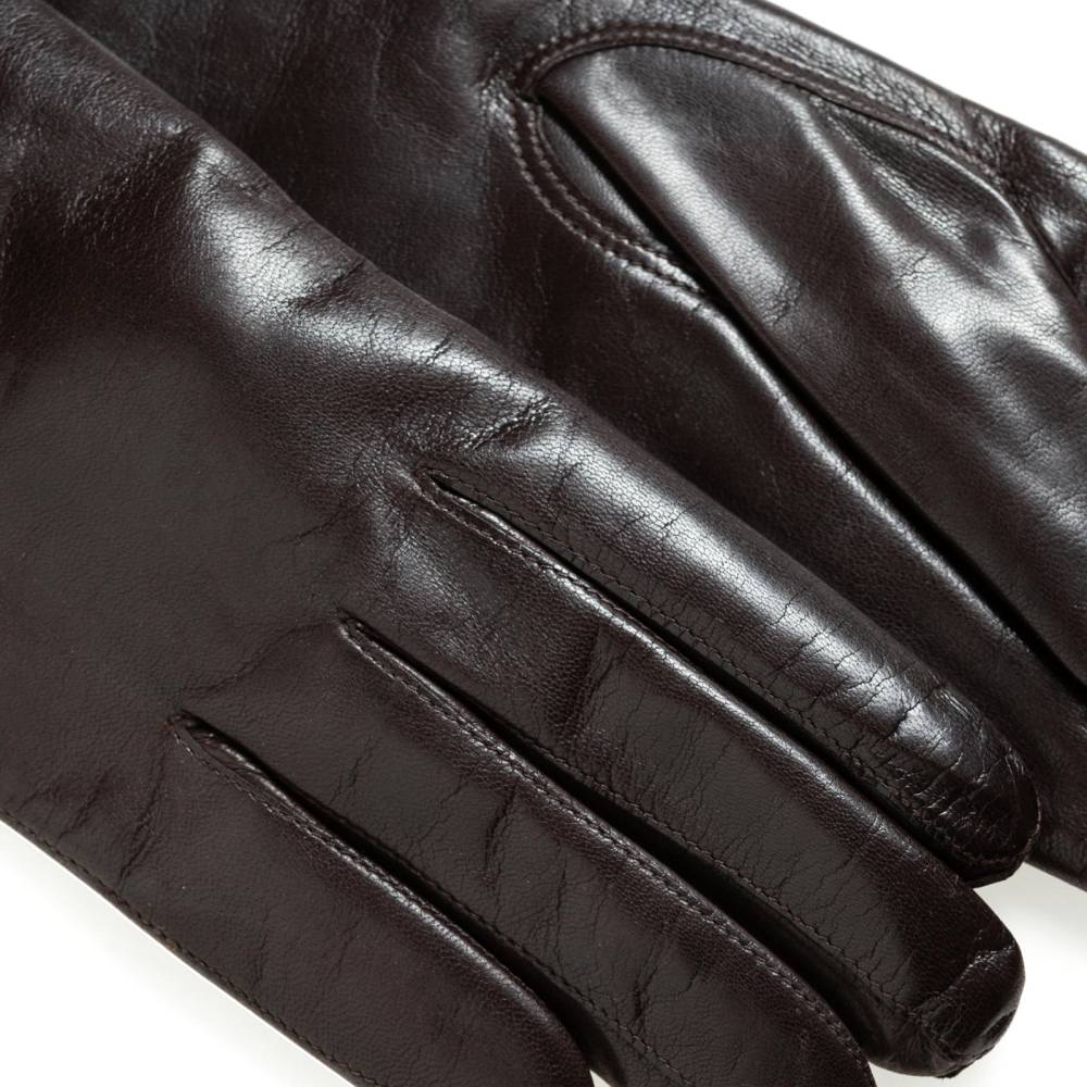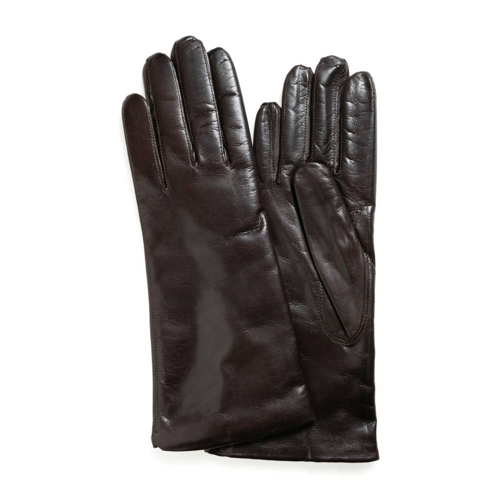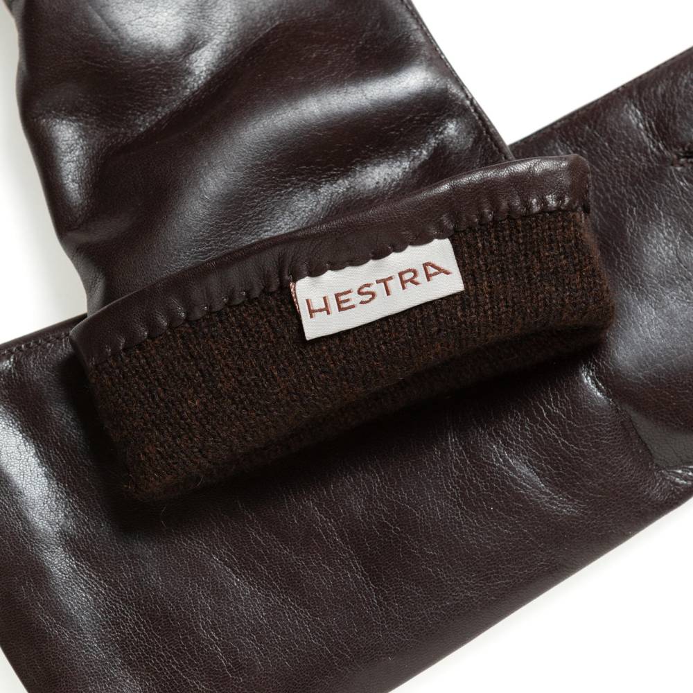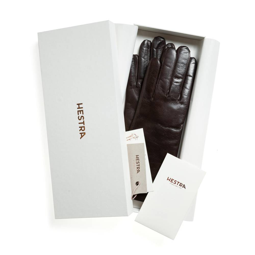 Классические тёмно-коричневые женские перчатки шведского бренда Hestra. Обе перчатки имеют одинаковую фактуру, так как выполнены из одного отрезка уникальной кожи ягнёнка, поставляемой из Эфиопии. Такая кожа отличается мягкостью, тонкой структурой и благородным блеском. К тому же она прочна и эластична, поэтому такие перчатки превосходно садятся по руке. Подкладка выполнена из мягкого кашемира.