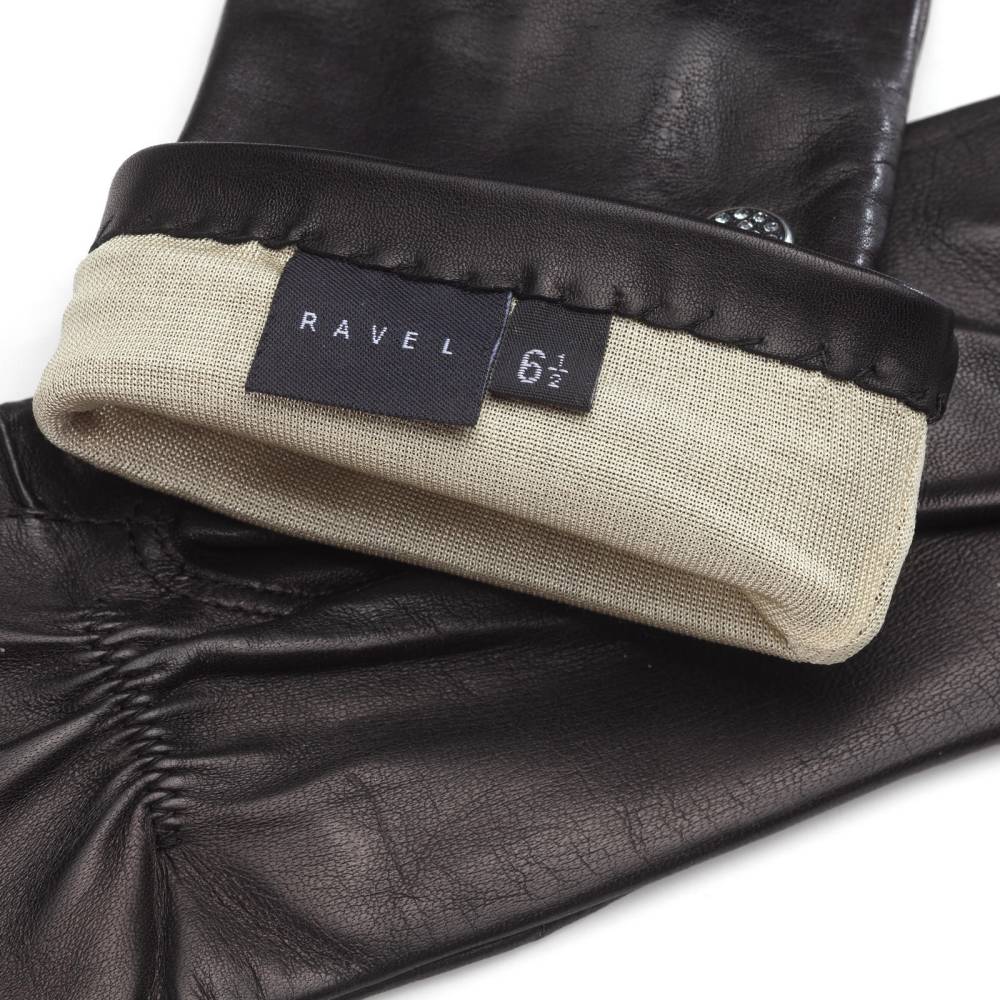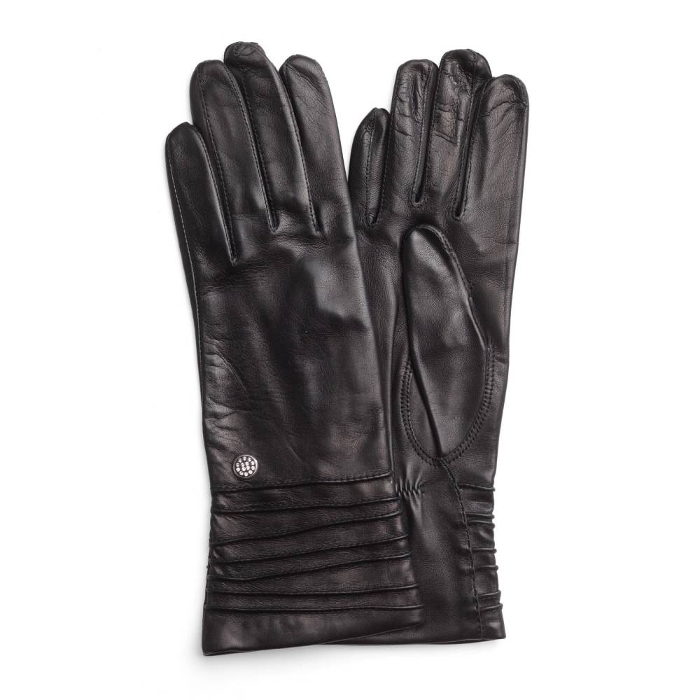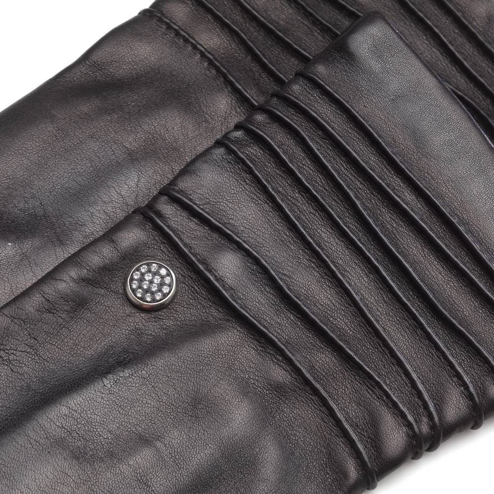Изящные и элегантные чёрные женские перчатки шведской марки Hestra. Модель сшита из нежной, но прочной кожи ягнёнка, а тонкая и приятная на ощупь подкладка выполнена из шёлка. В области запястья имеются декоративные строчки; кроме того, перчатки украшены стразами. Эта модель отлично подойдет для прохладных осенних дней или вечерних выходов.