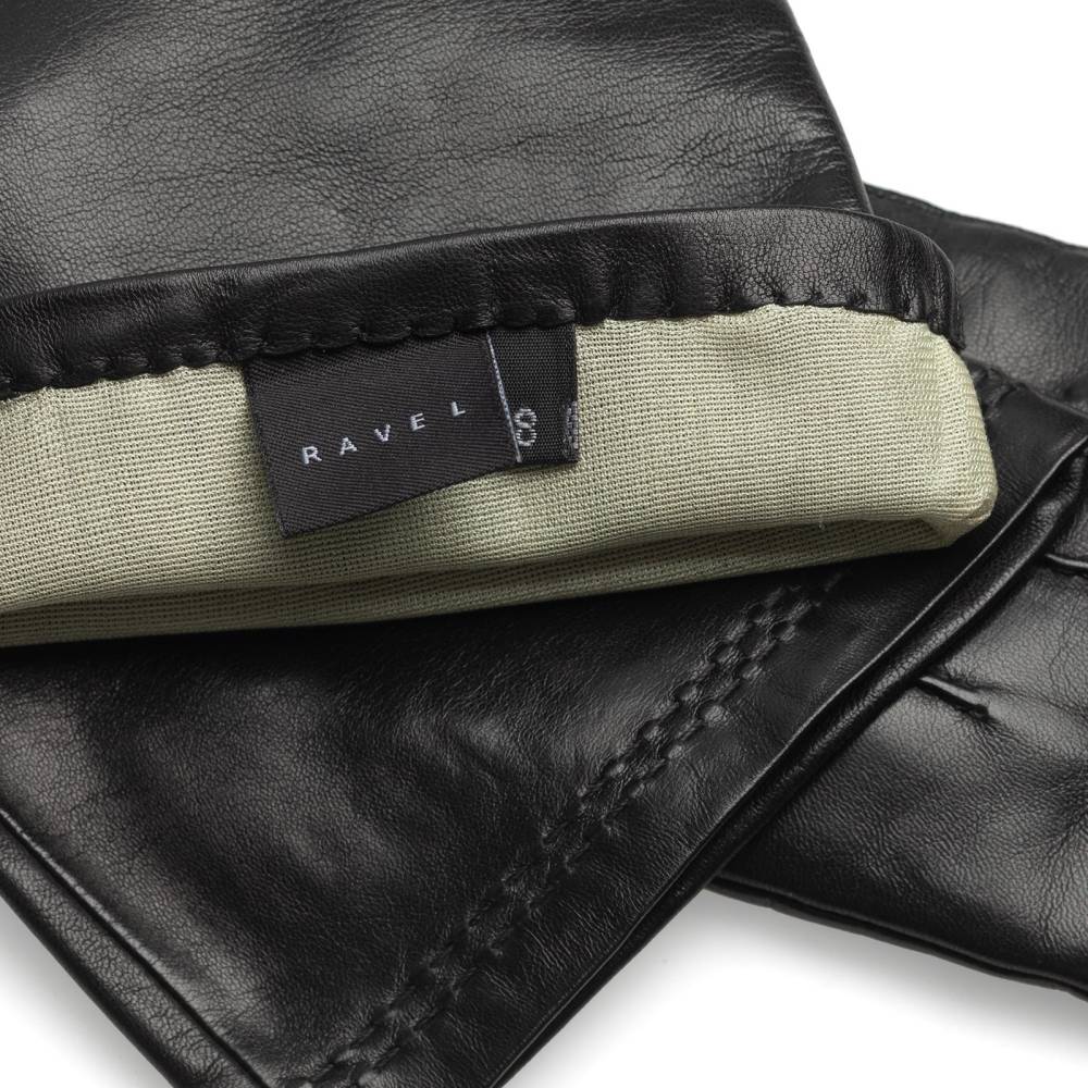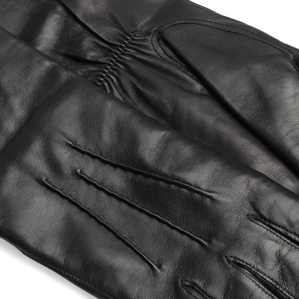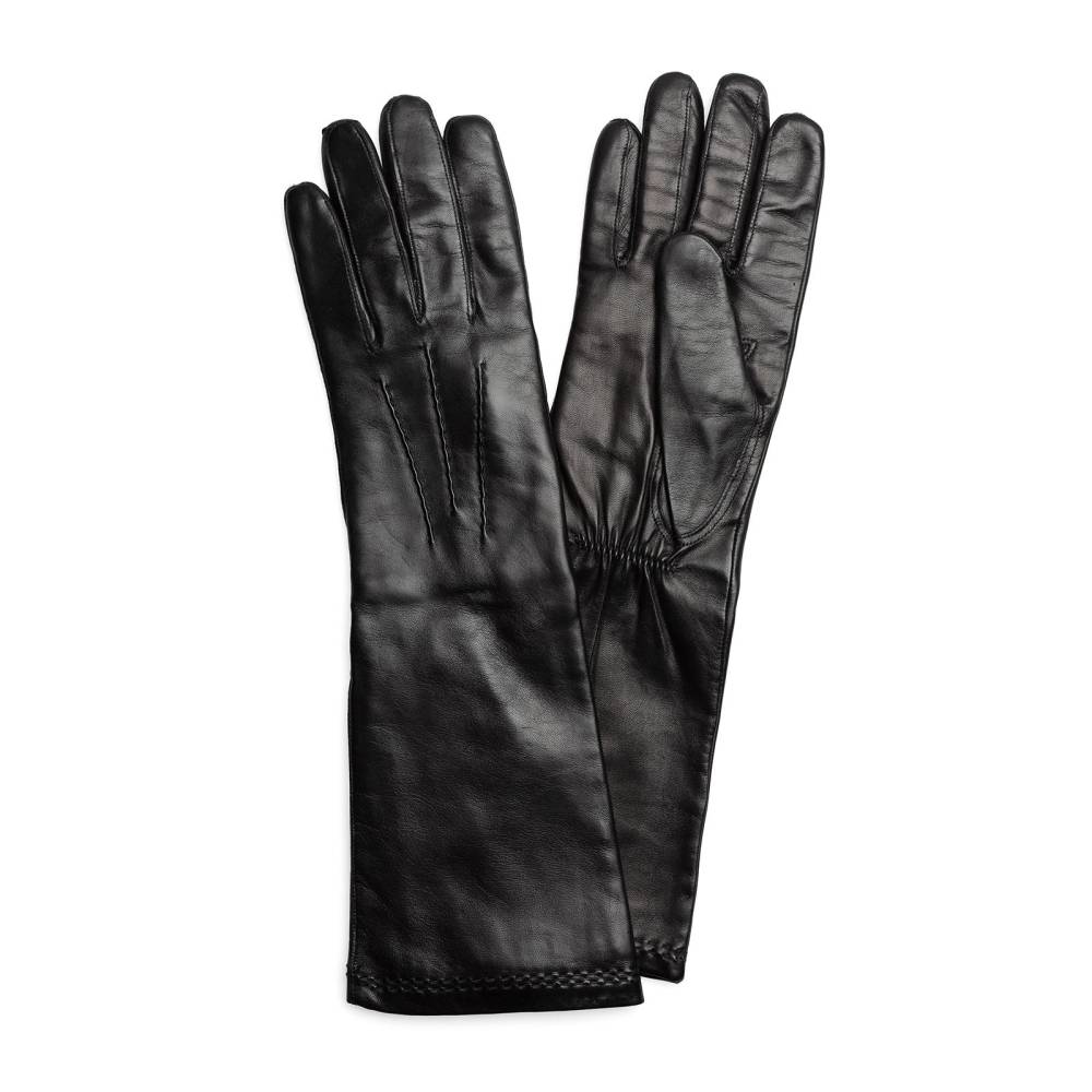 Элегантные длинные женские перчатки шведской марки Hestra для пальто и шуб с рукавом три четверти. Модель сшита из нежной, но прочной кожи ягнёнка чёрного цвета. Тонкая и приятная на ощупь подкладка выполнена из сочетания шёлка и шерсти. На тыльной стороне ладони и в области запястья проложены декоративные строчки. Эта модель отлично подойдет для прохладных осенних и зимних дней или вечерних выходов.