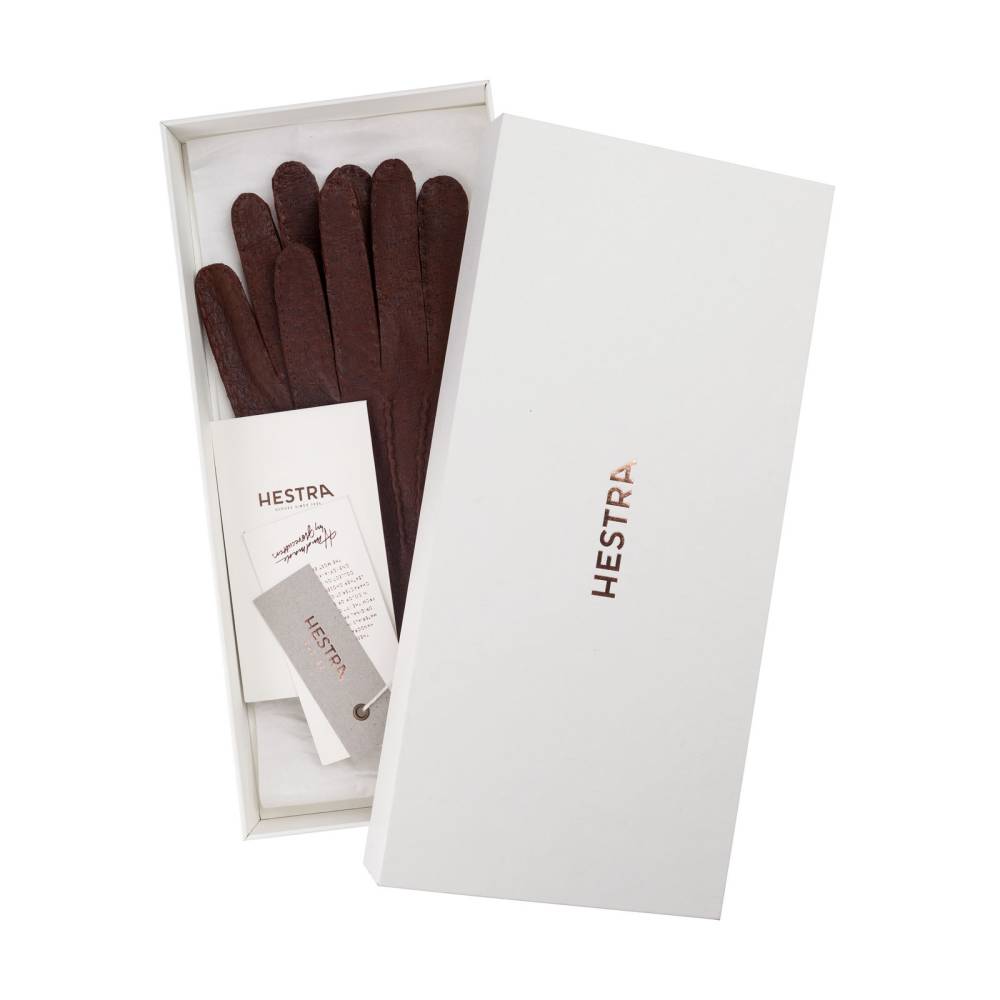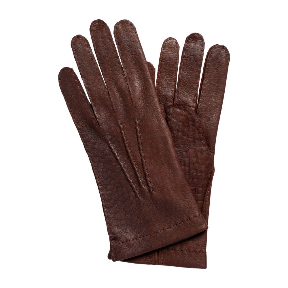 Тонкие элегантные мужские перчатки шведского бренда Hestra тёмно-коричневого цвета. Модель из коллекции Table Cut вручную изготовлена из одного отрезка кожи пекари – дикого кабана, обитающего в джунглях Амазонки. Редкая и эксклюзивная кожа пекари обладает прекрасными изоляционными свойствами и характерным рисунком. Она не требует особого ухода и со временем, наоборот, становится только мягче и эластичнее, приобретая благородную патину. Так как перчатки не имеют подкладки, они лучше всего подходят для ранней осени и весны, когда температура не ниже нуля.