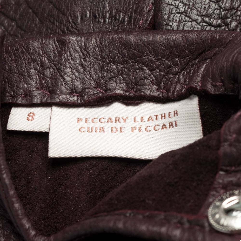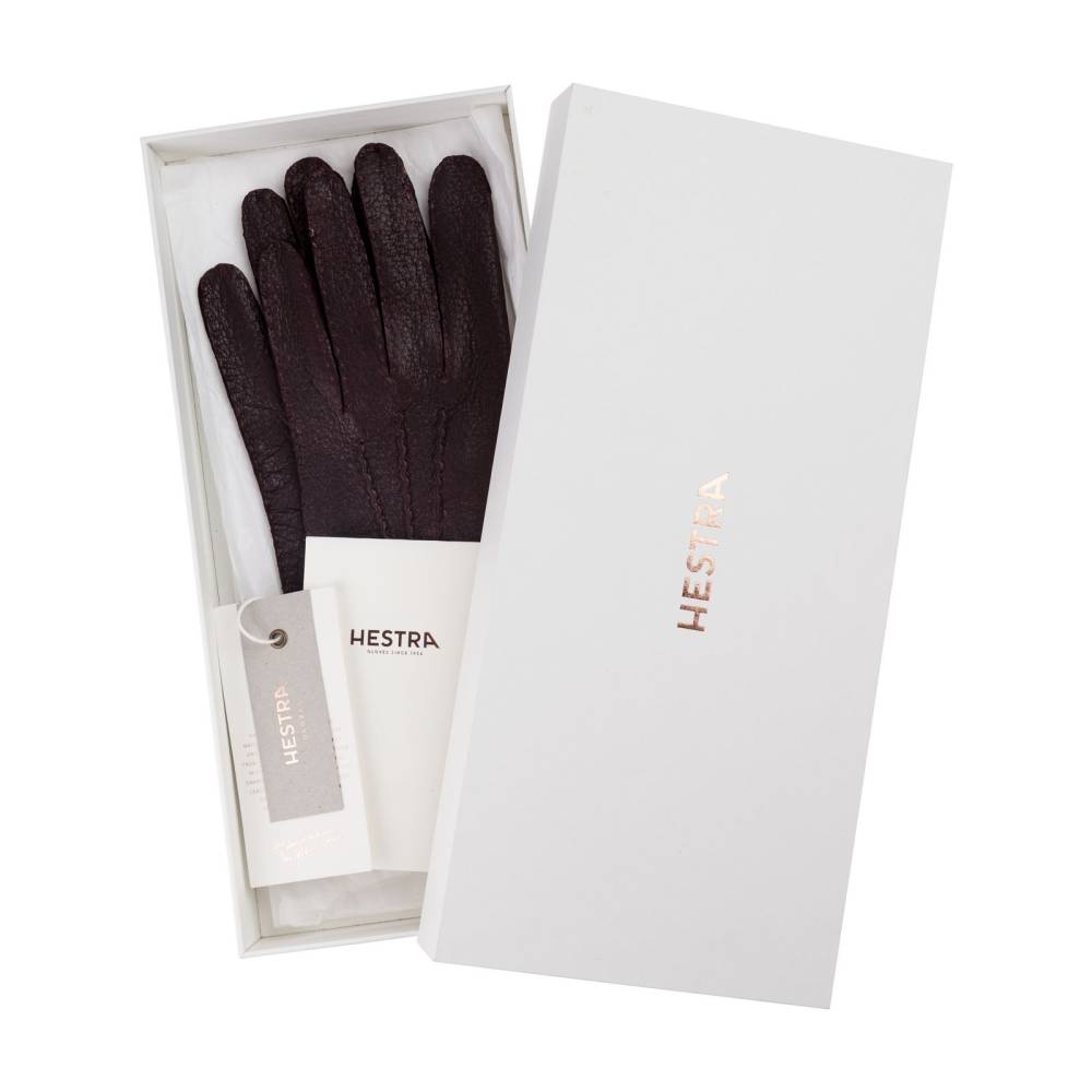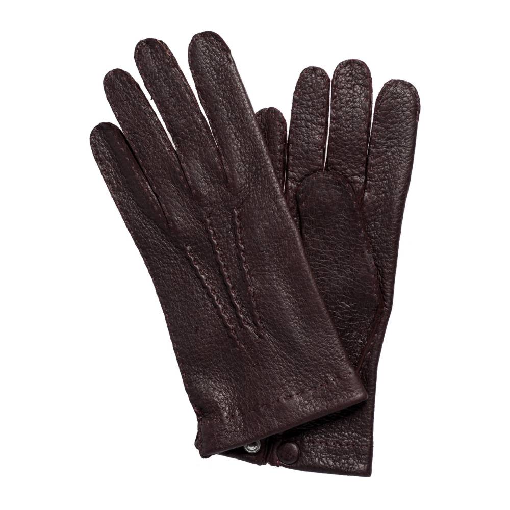 Тонкие элегантные мужские перчатки шведского бренда Hestra тёмно-бордового цвета с кнопочной застёжкой на запястье. Модель из коллекции Table Cut вручную изготовлена из одного отрезка кожи пекари – дикого кабана, обитающего в джунглях Амазонки. Редкая и эксклюзивная кожа пекари обладает прекрасными изоляционными свойствами и характерным рисунком. Она не требует особого ухода и со временем, наоборот, становится только мягче и эластичнее, приобретая благородную патину. Так как перчатки не имеют подкладки, они лучше всего подходят для ранней осени и весны, когда температура не ниже нуля.