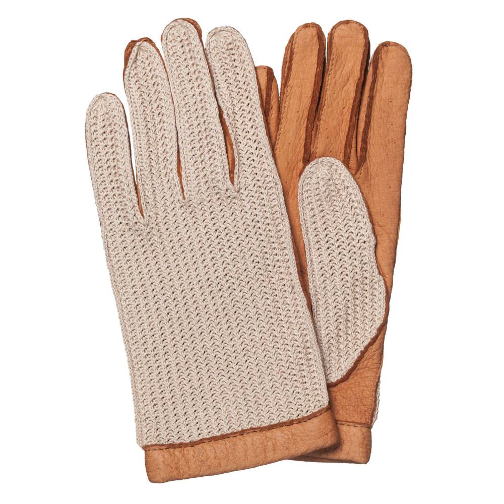 Мужские перчатки Hestra Peccary Crochet выполнены из кожи пекари светло-коричневого цвета и вязаного хлопкового полотна без подкладки. Редкая и эксклюзивная кожа пекари обладает прекрасными изоляционными свойствами и характерным рисунком. Она не требует особого ухода и со временем, наоборот, становится только мягче и эластичнее, приобретая благородную патину Вырез на запястье позволяет легко надевать и снимать перчатки. На внутренней стороне проложены фактурные строчки для защиты от трения. Модель подходит для погоды с плюсовой температурой.